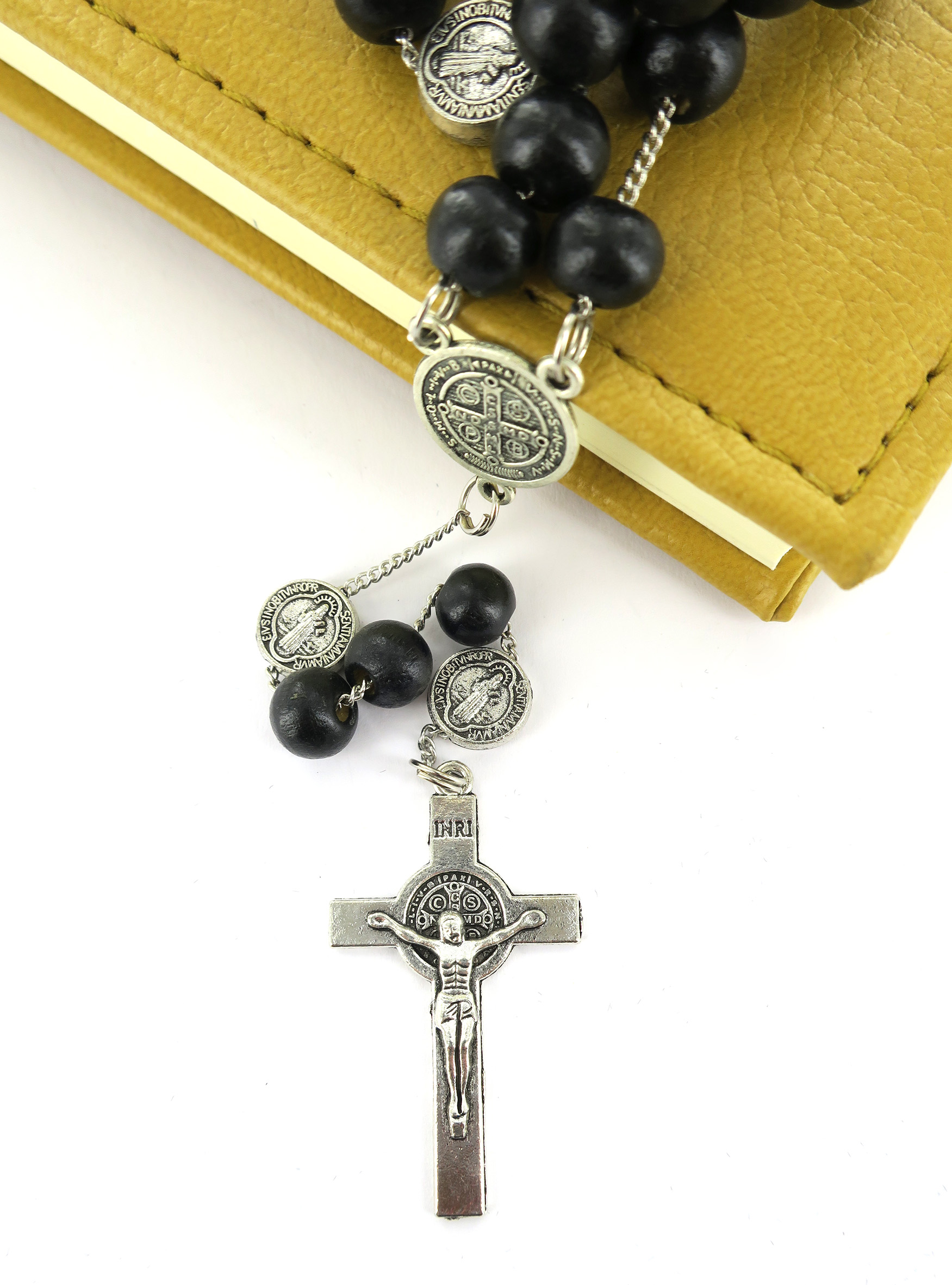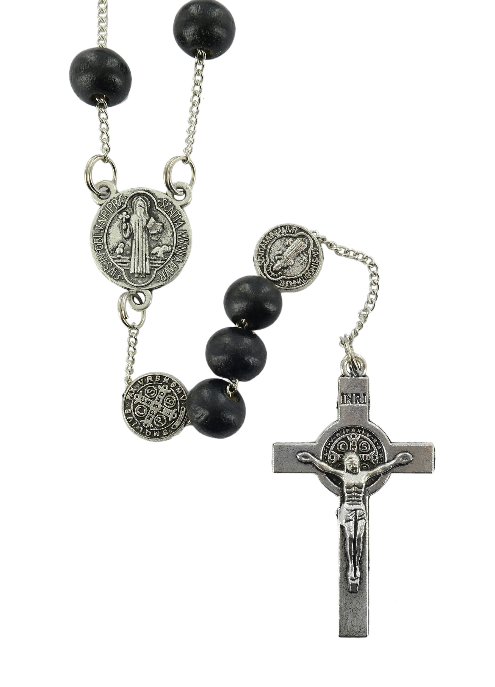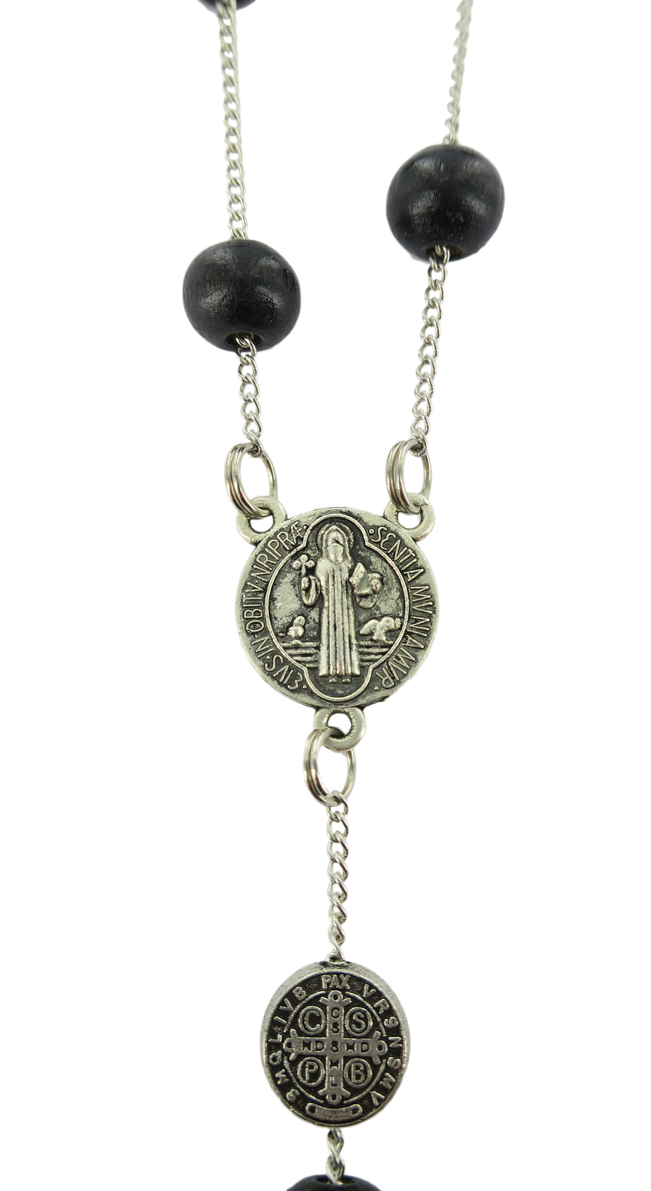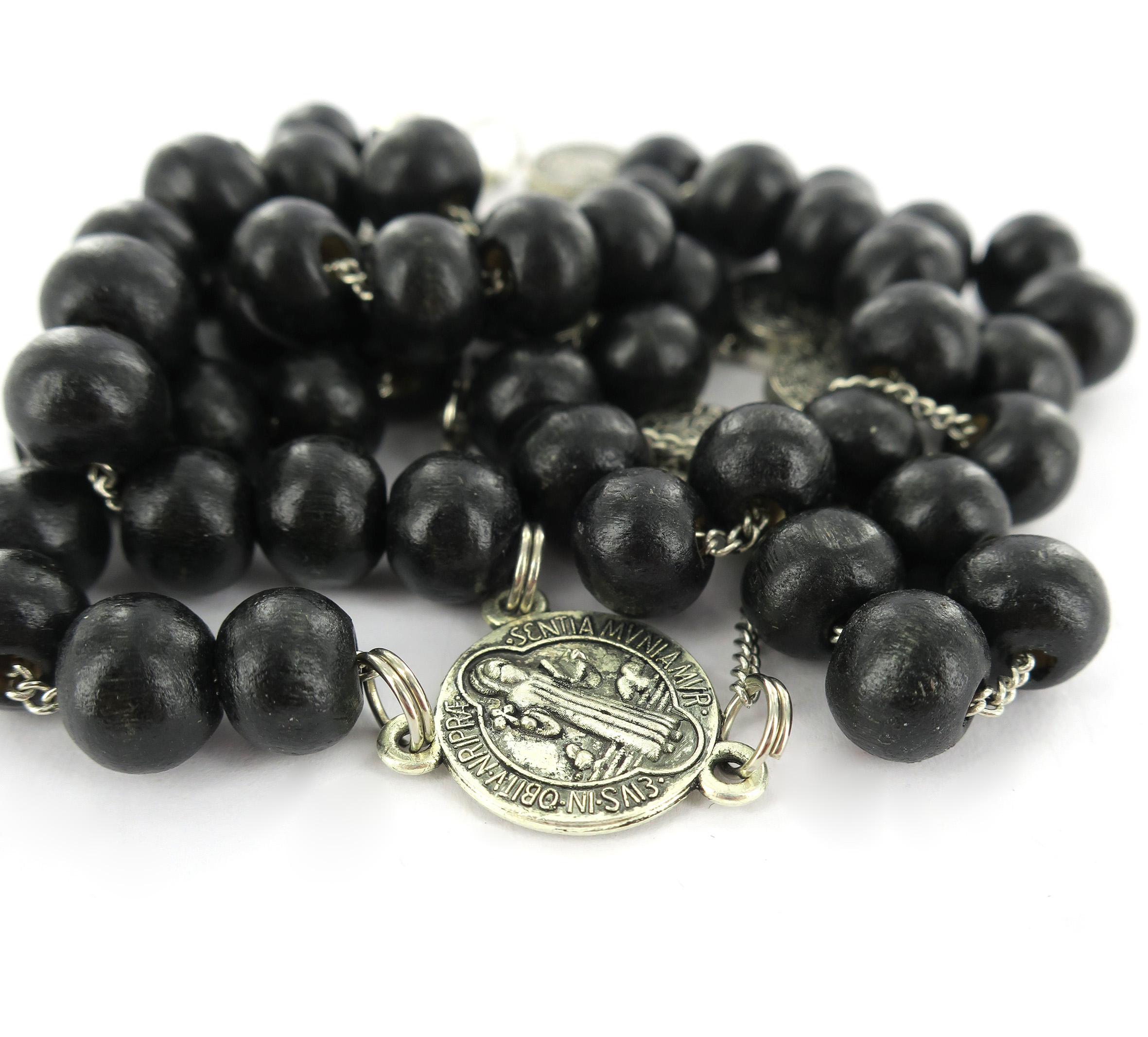 Rosario di San Benedetto in legno tondo nero diametro 7 mm con Pater e legatura in metallo e chiusura con moschettone