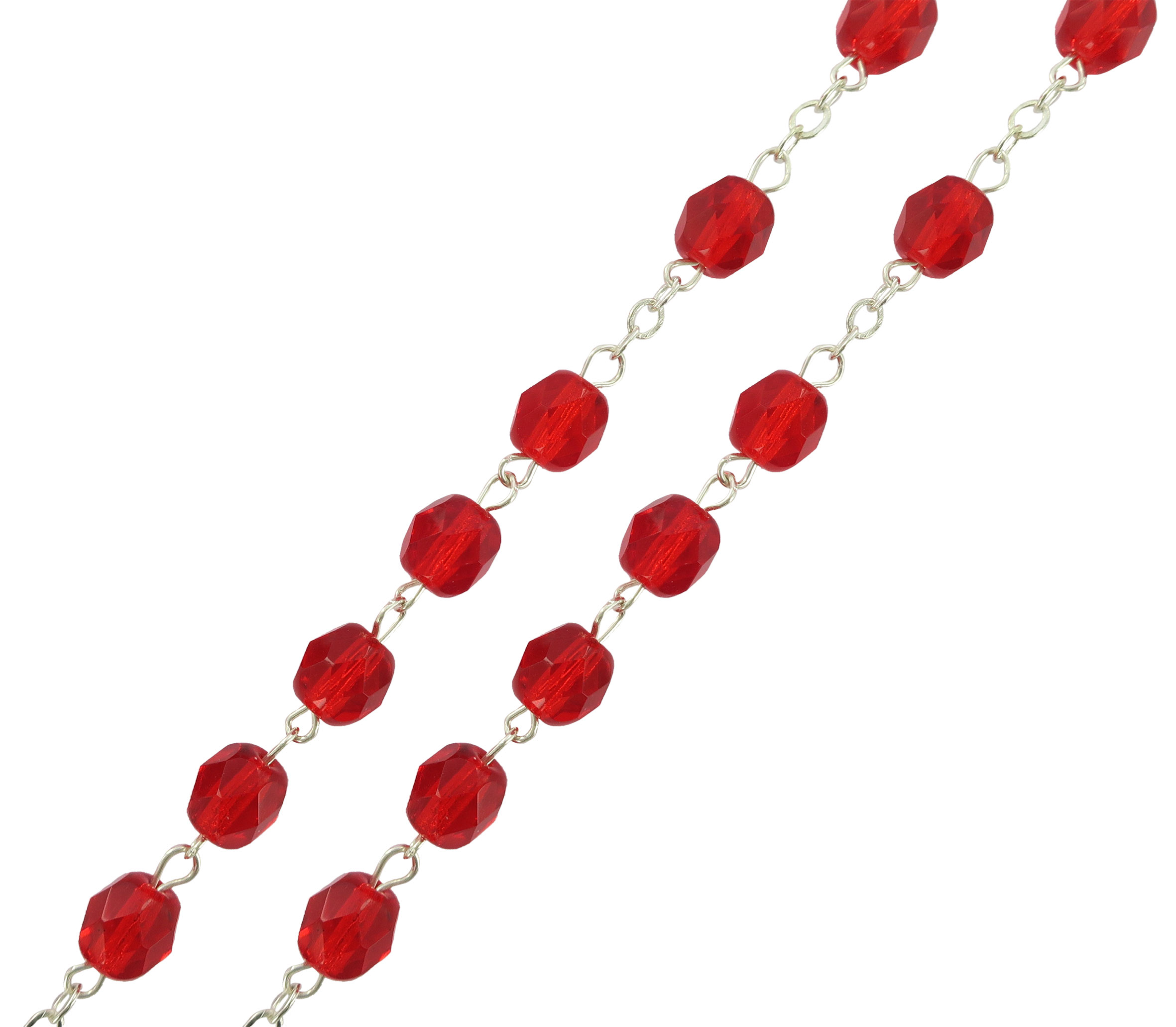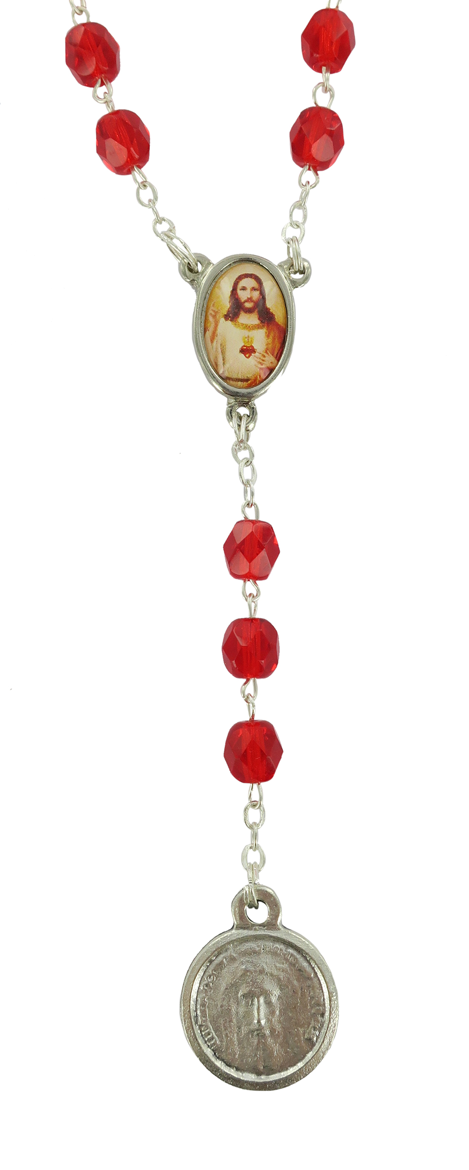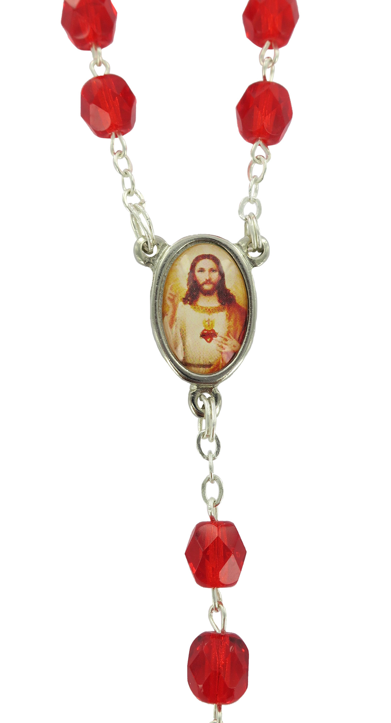 Rosario devozionale del Prezioso Sangue, con legatura a mano in metallo e spiegazione. Grani in plastica rossa e legatura metallica. L'immagine resinata di Gesù completa questo rosario devozionale.