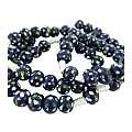 Rosario con grani tondi in legno blu con fiore bianco e giallo e legatura a mano con filo bianco.