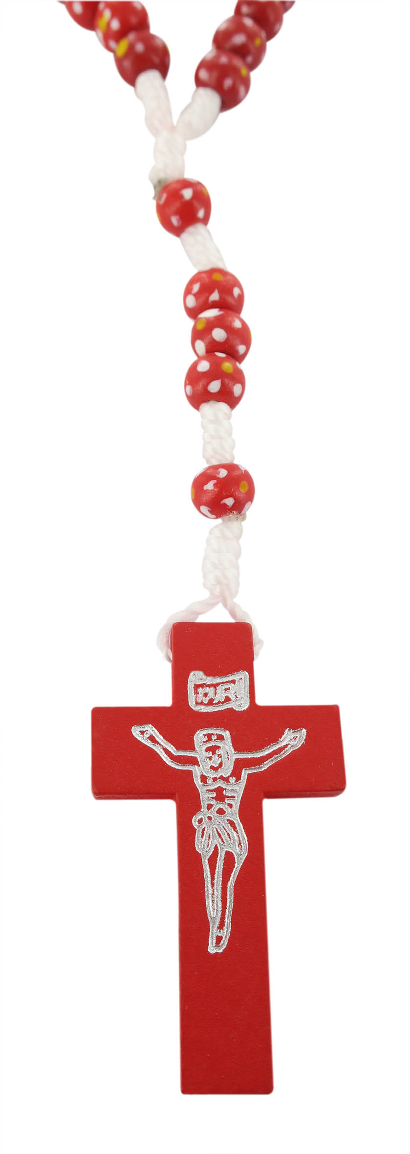 Rosario con grani tondi in legno rosso con fiore bianco e giallo e legatura a mano con filo bianco.