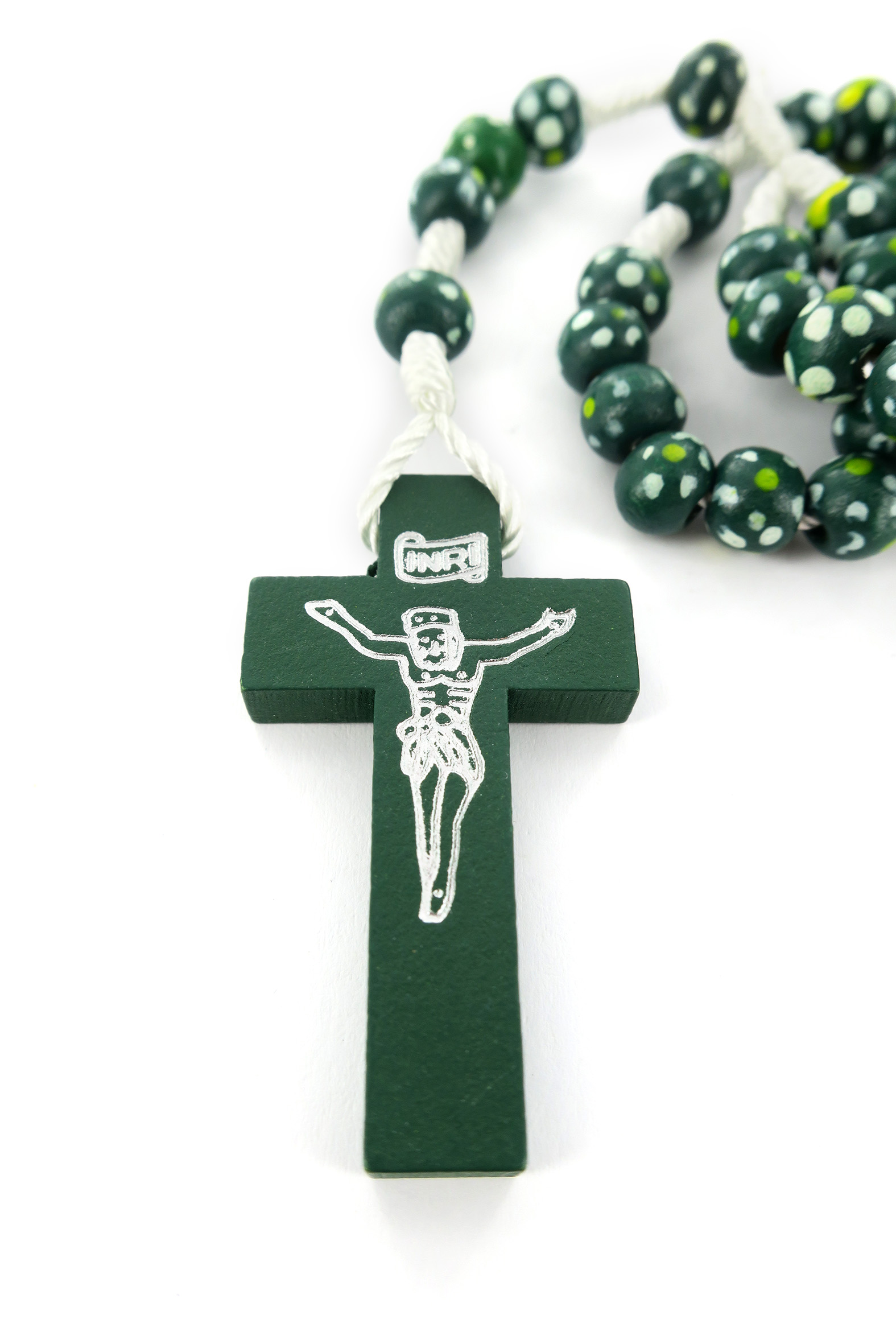 Ogni grano è di millimetri 7 e sulla croce in legno è impresso il corpo di Cristo in colore argento.