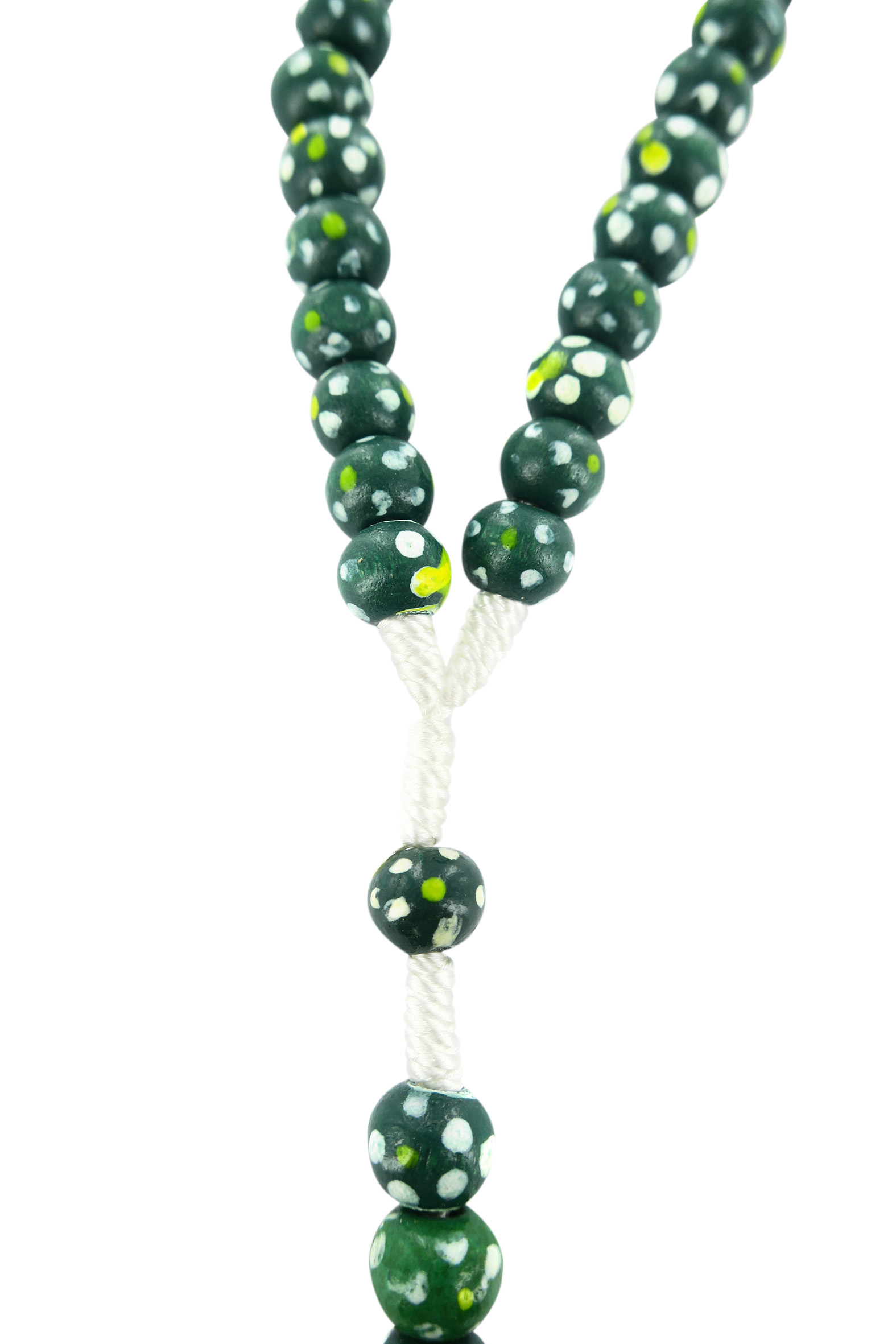 Rosario con grani tondi in legno verde con fiore bianco e giallo e legatura a mano con filo bianco.