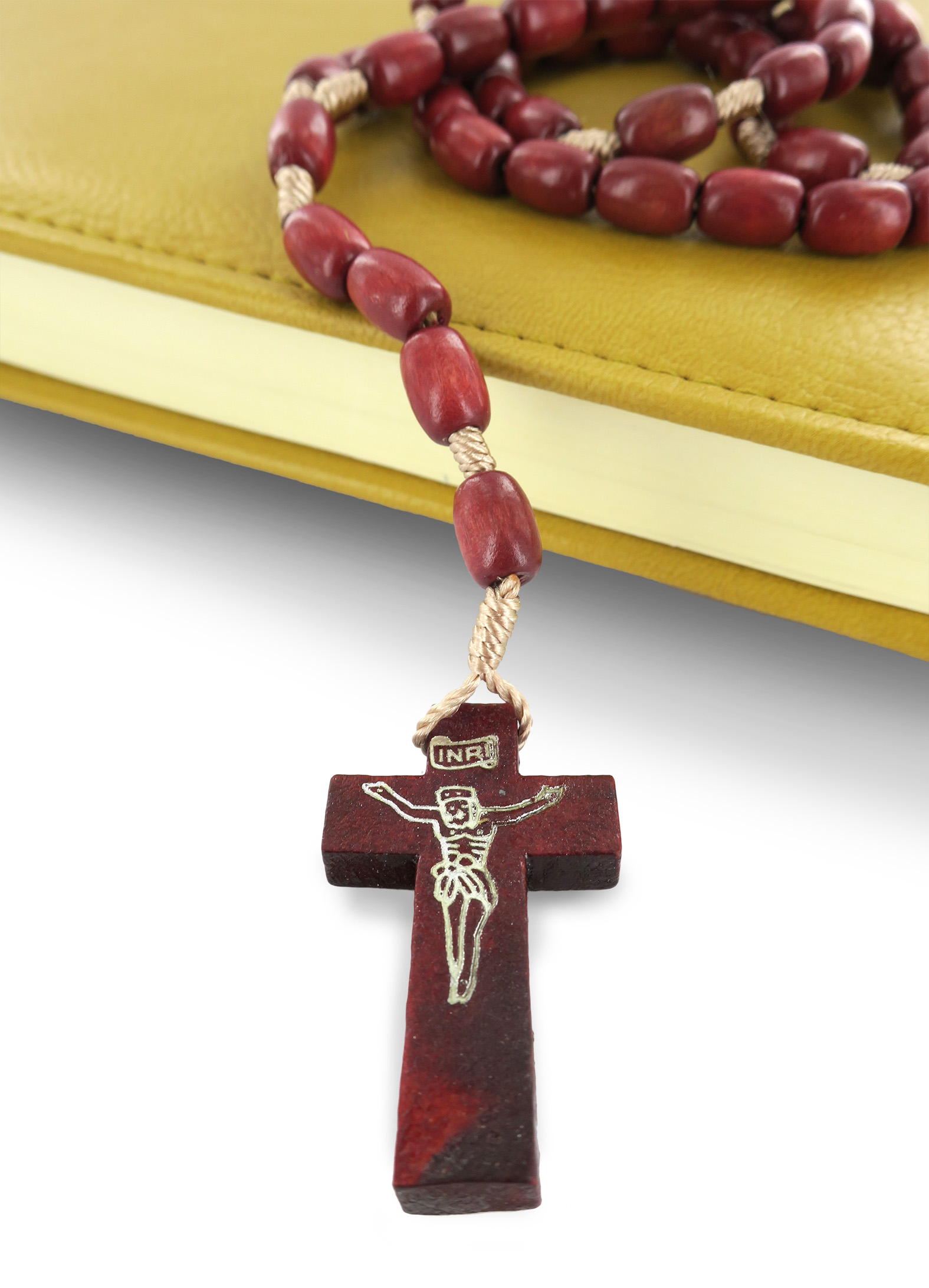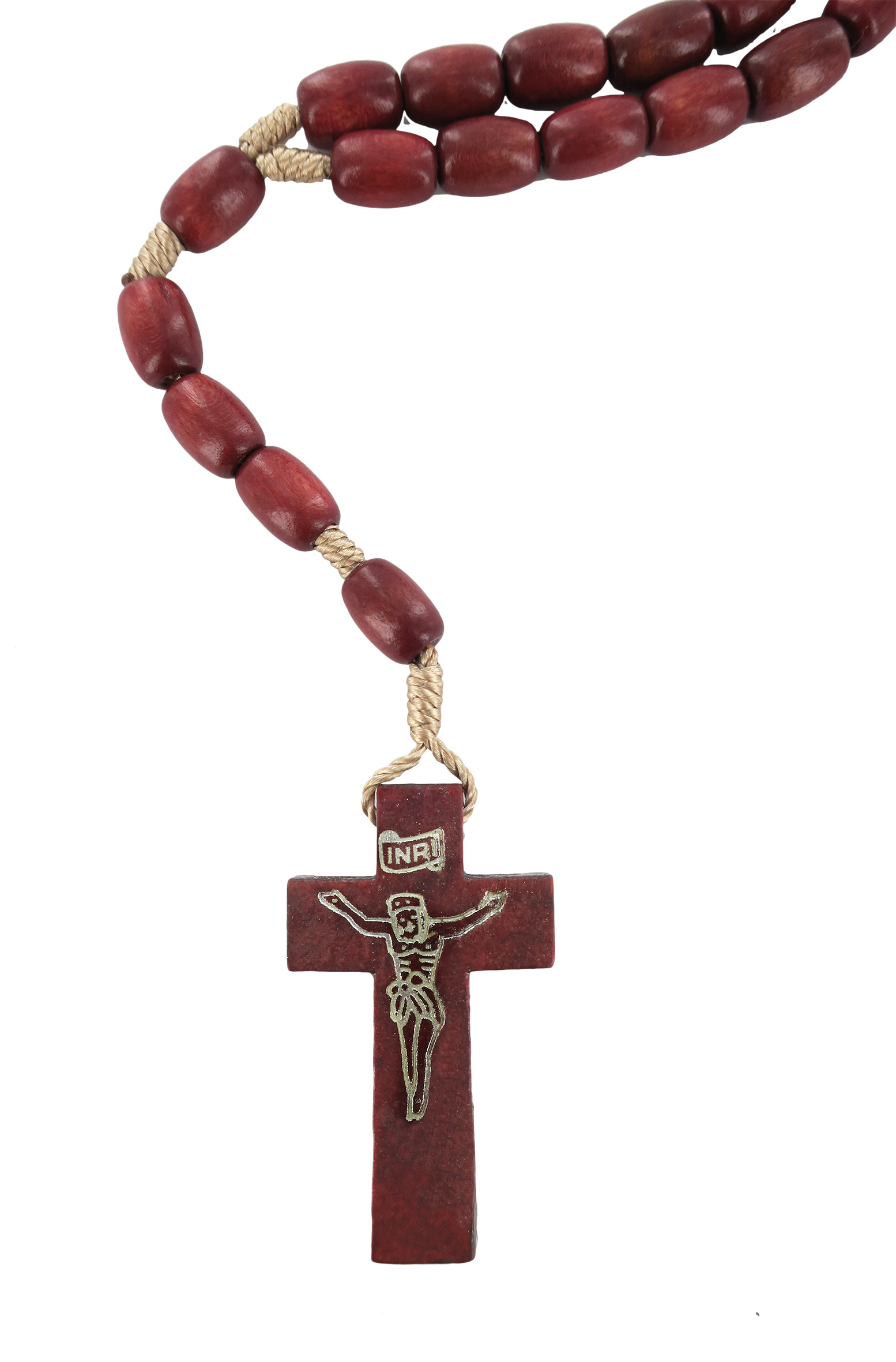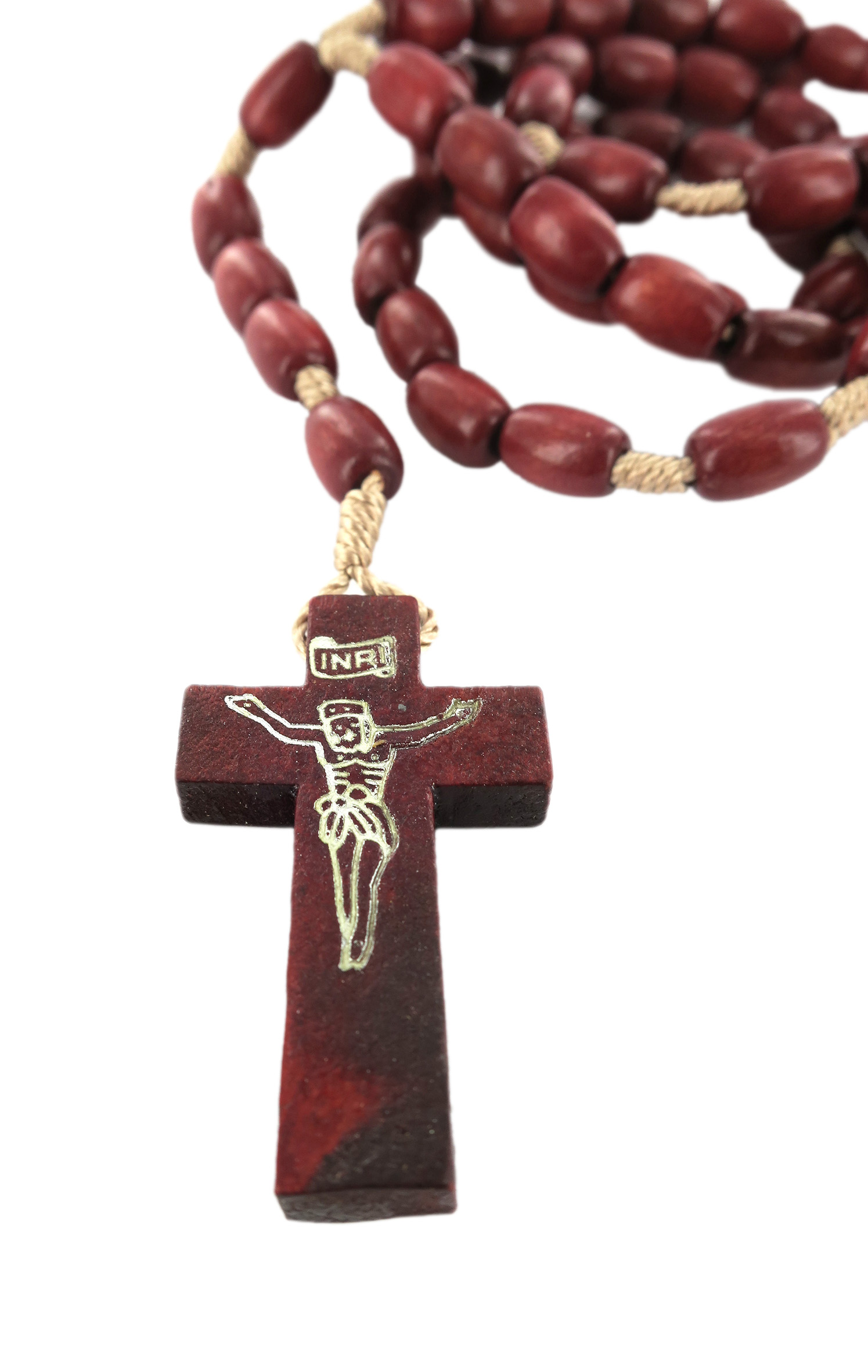 Ogni grano è di millimetri 7 e sulla croce in legno è impresso il corpo di Cristo.