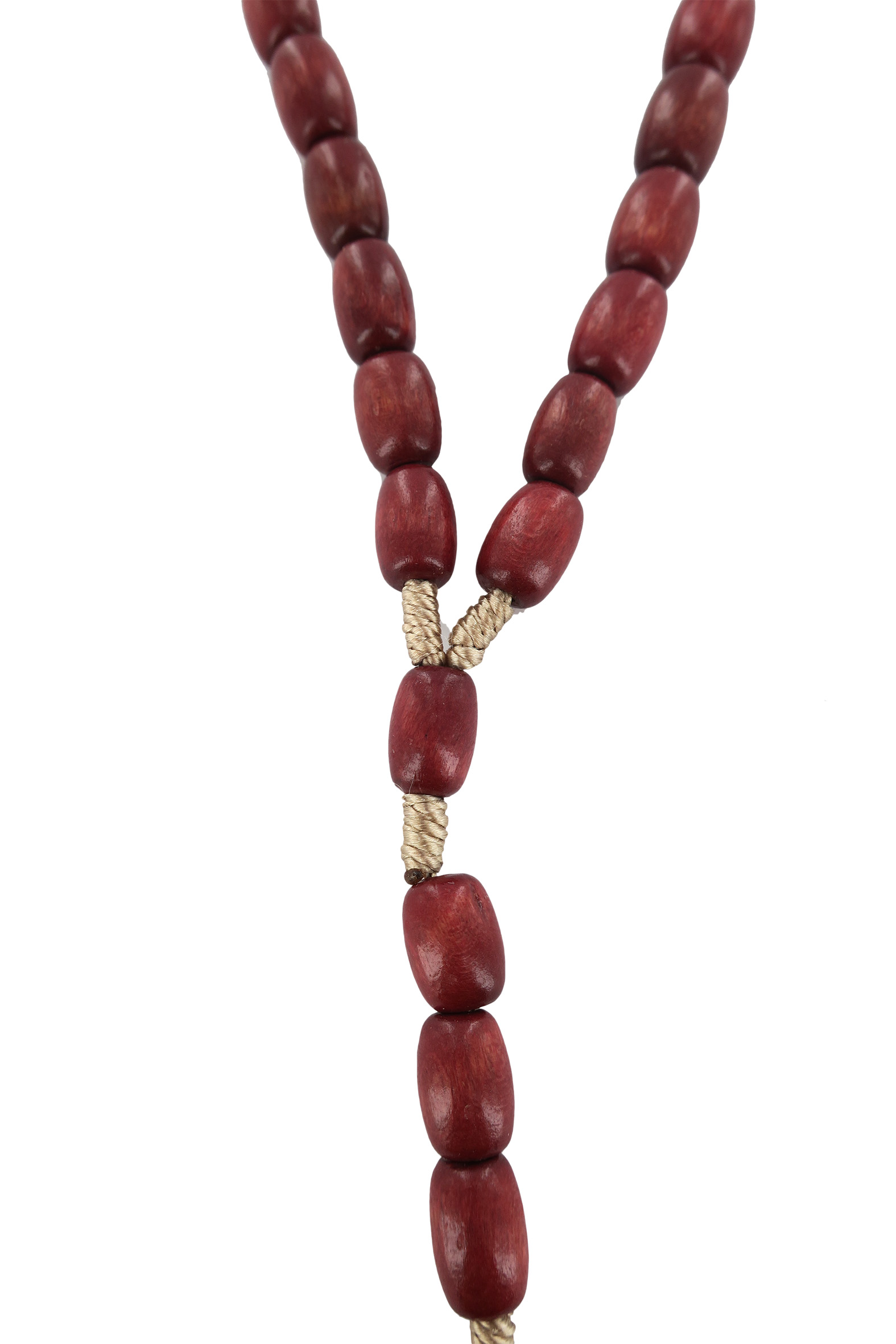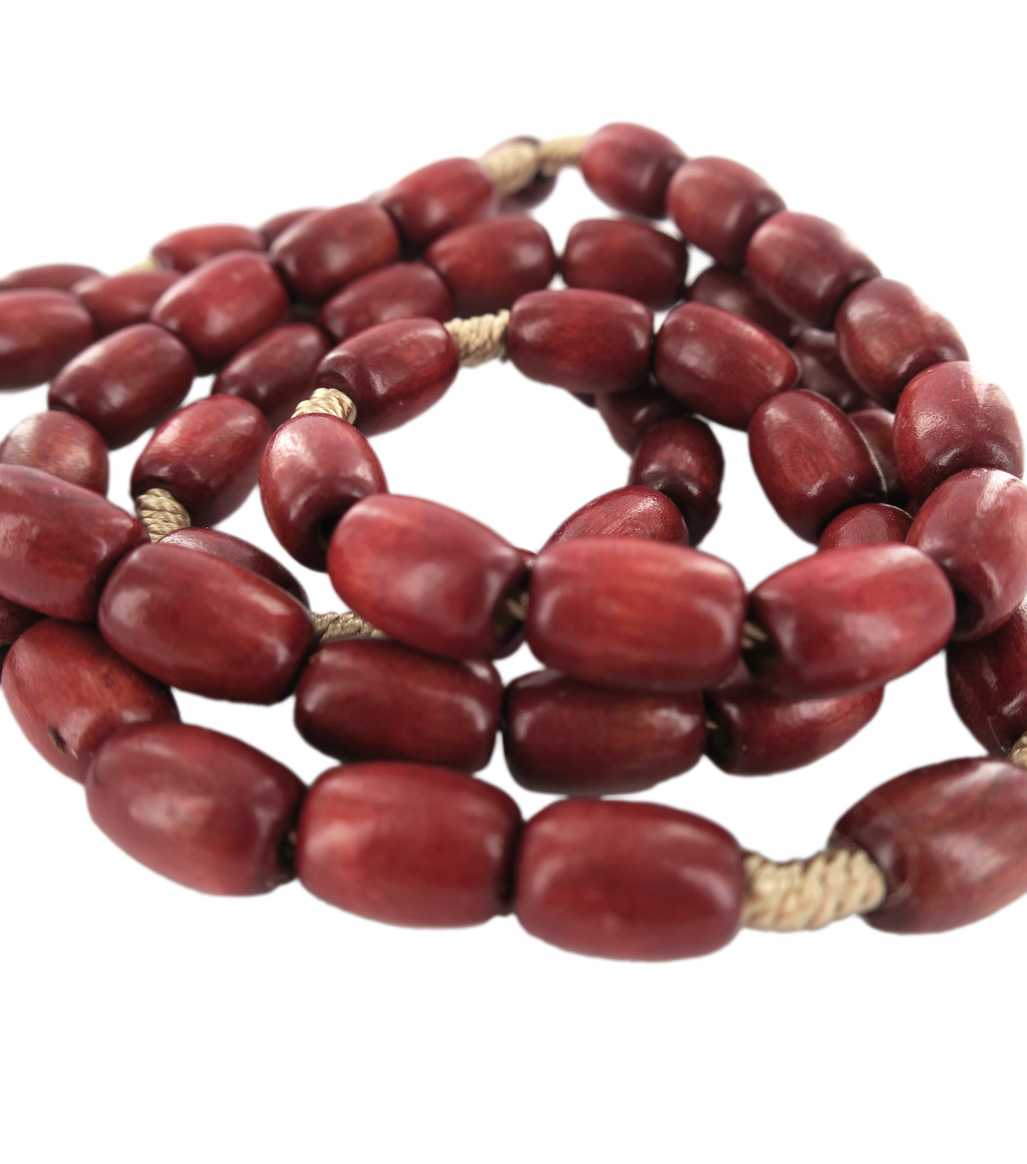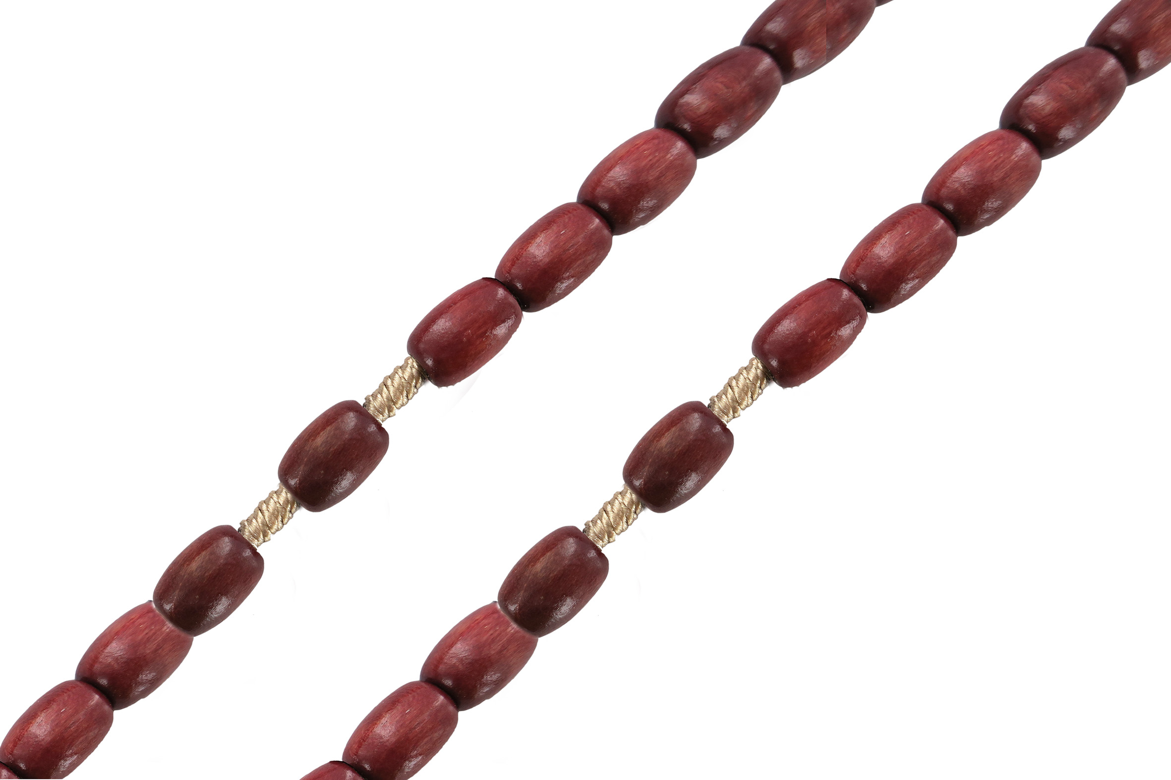 Ogni grano è di millimetri 7 e sulla croce in legno è impresso il corpo di Cristo.