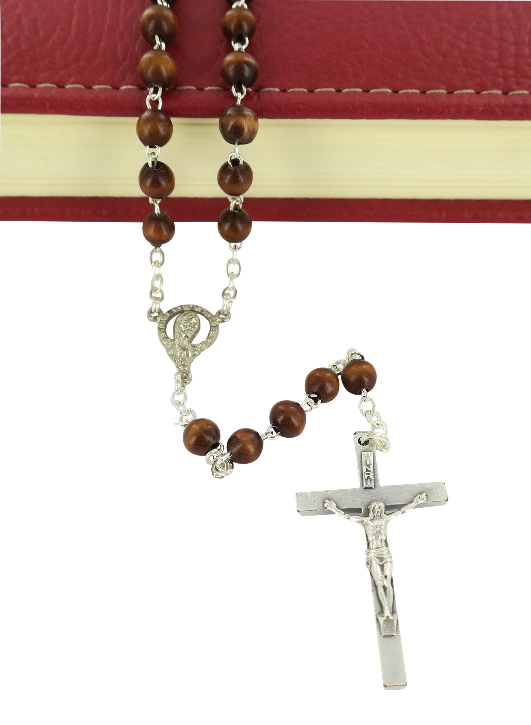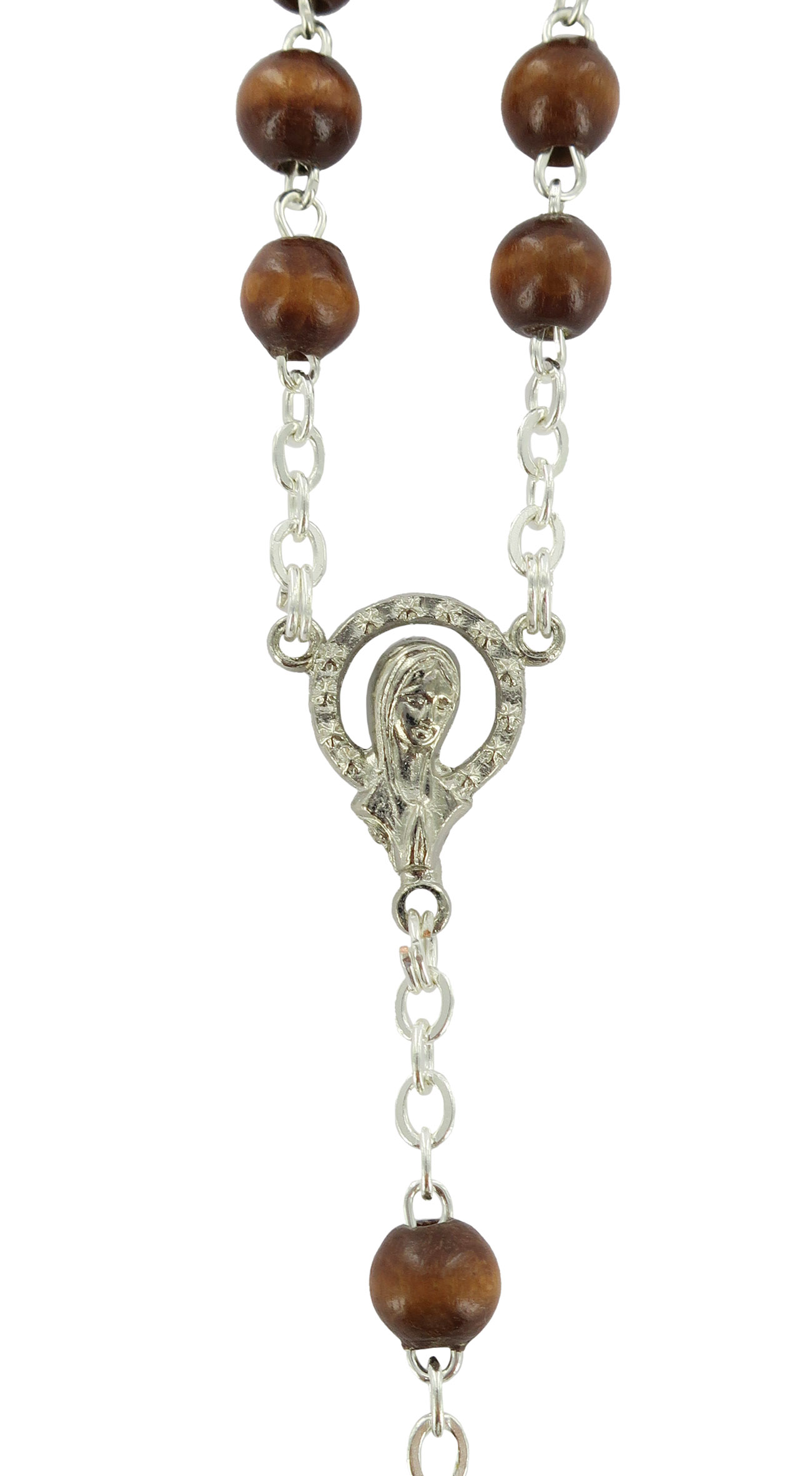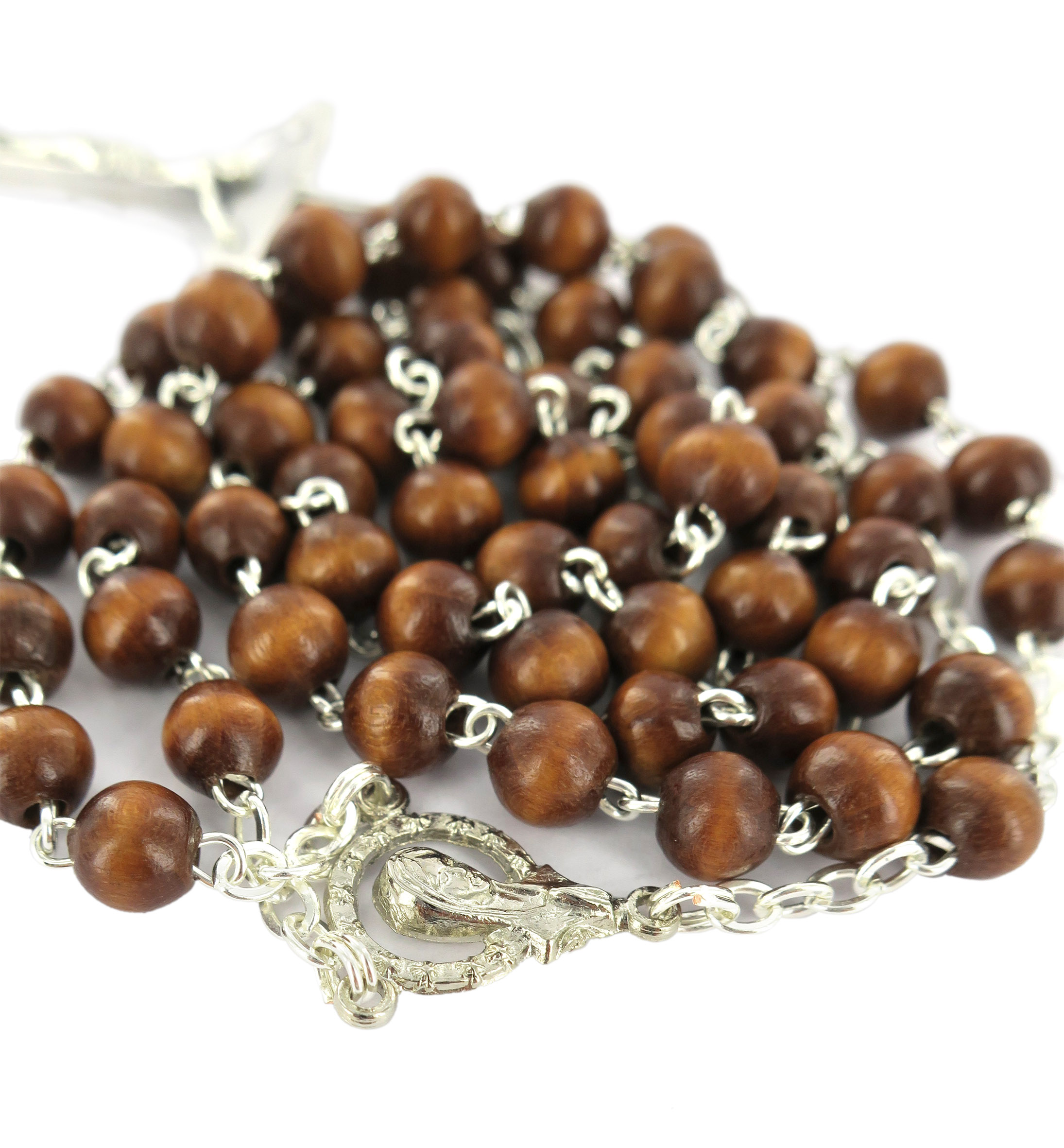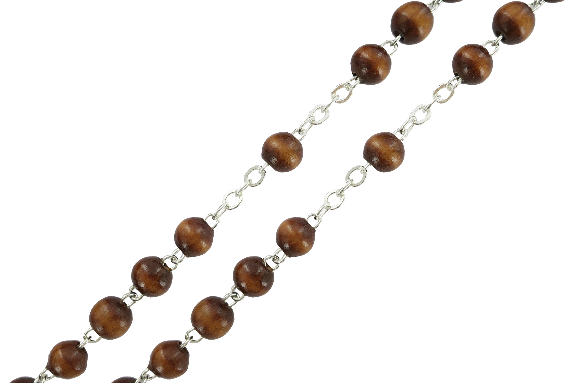 Rosario con legatura fatta a mano in ottone argentato con grani rotondi in legno naturale.