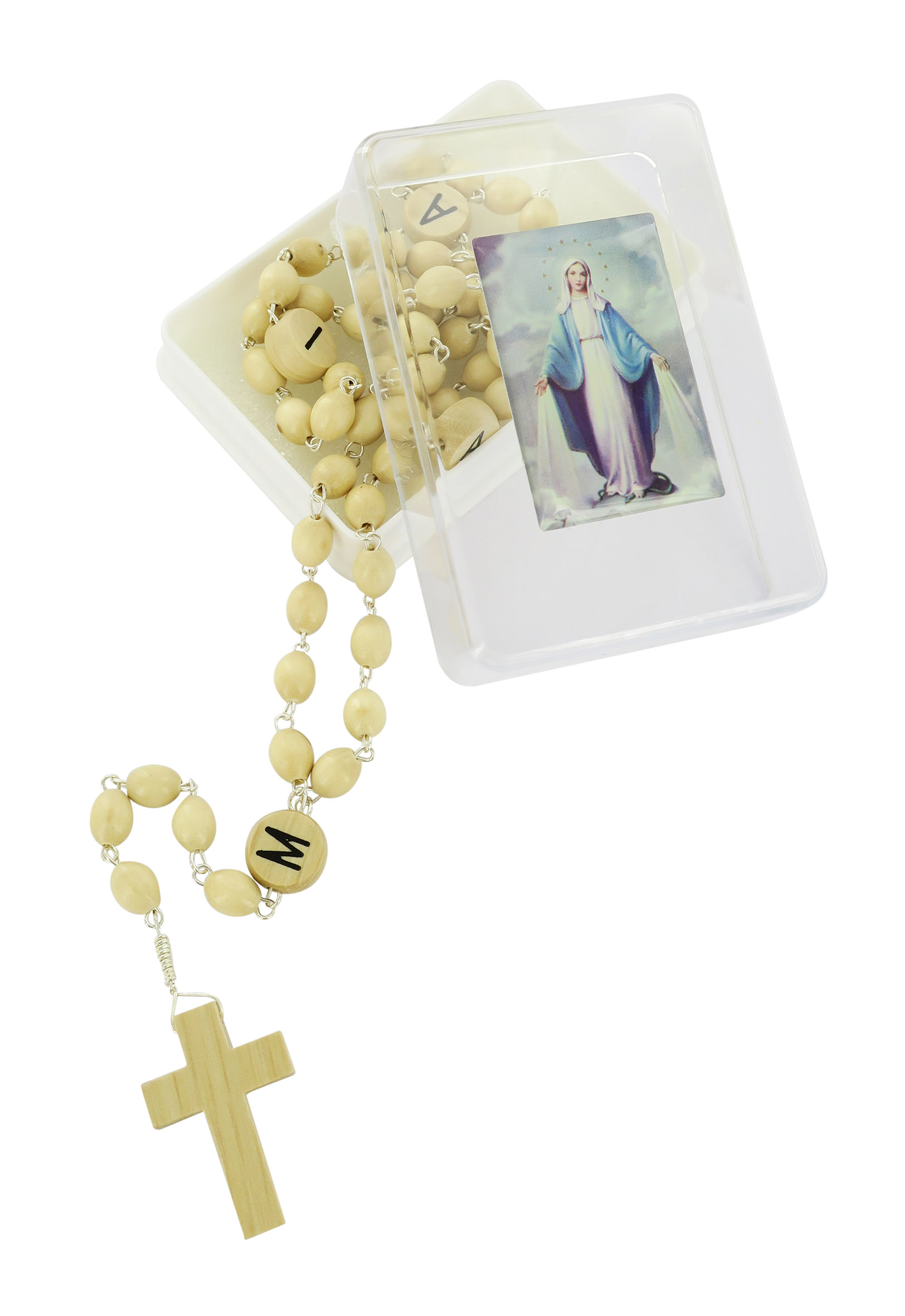 Il rosario si presenta in una scatolina trasparente con l'immagine della Madonna Miracolosa in resina colorata.