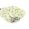 Il rosario in vera madreperla ovale, è legato a mano con filo di metallo argentato, croce con Cristo riportato e crociera ovale con Madonnina pregante.
