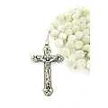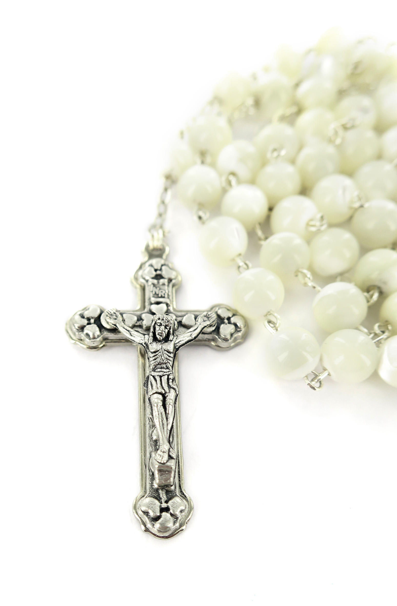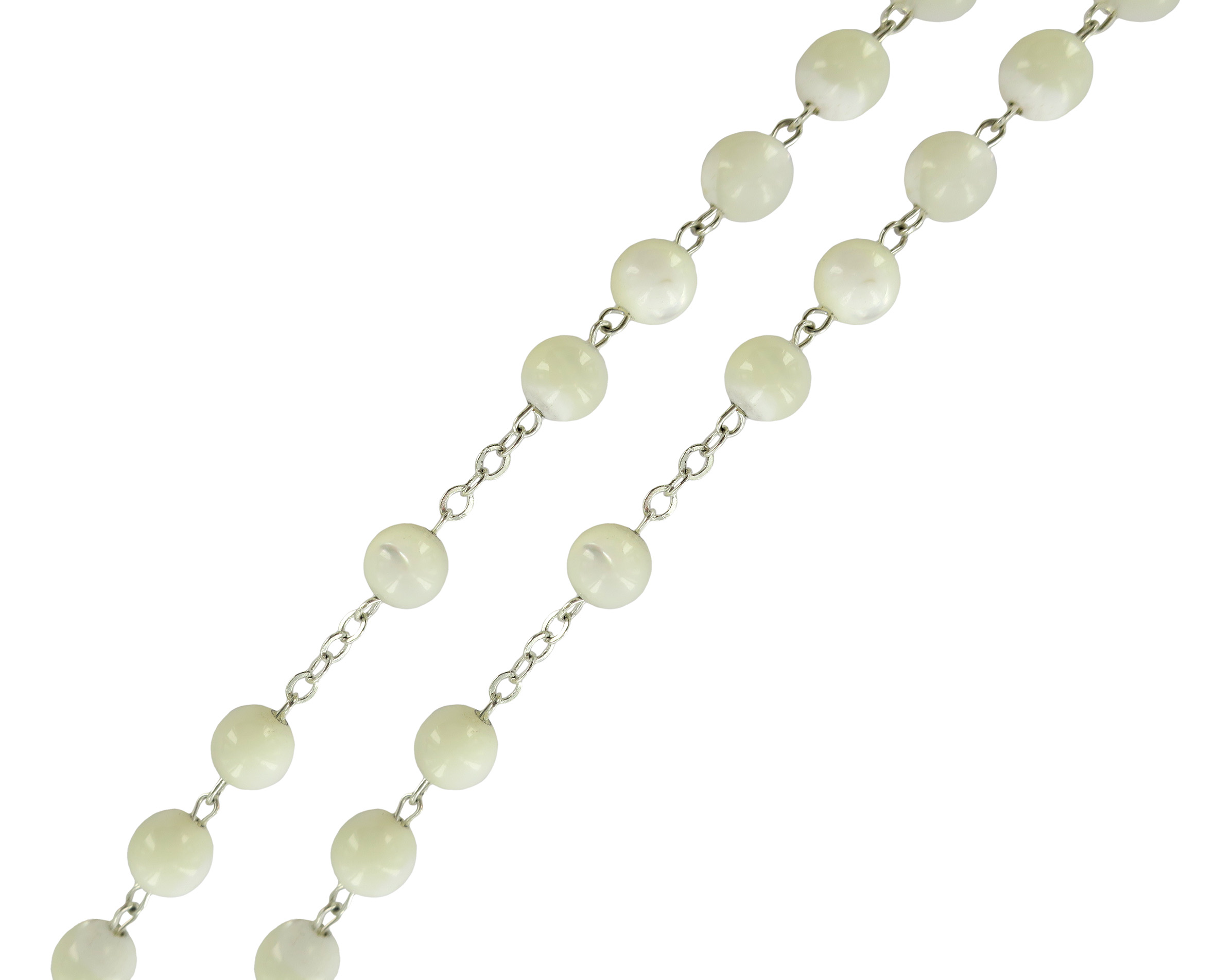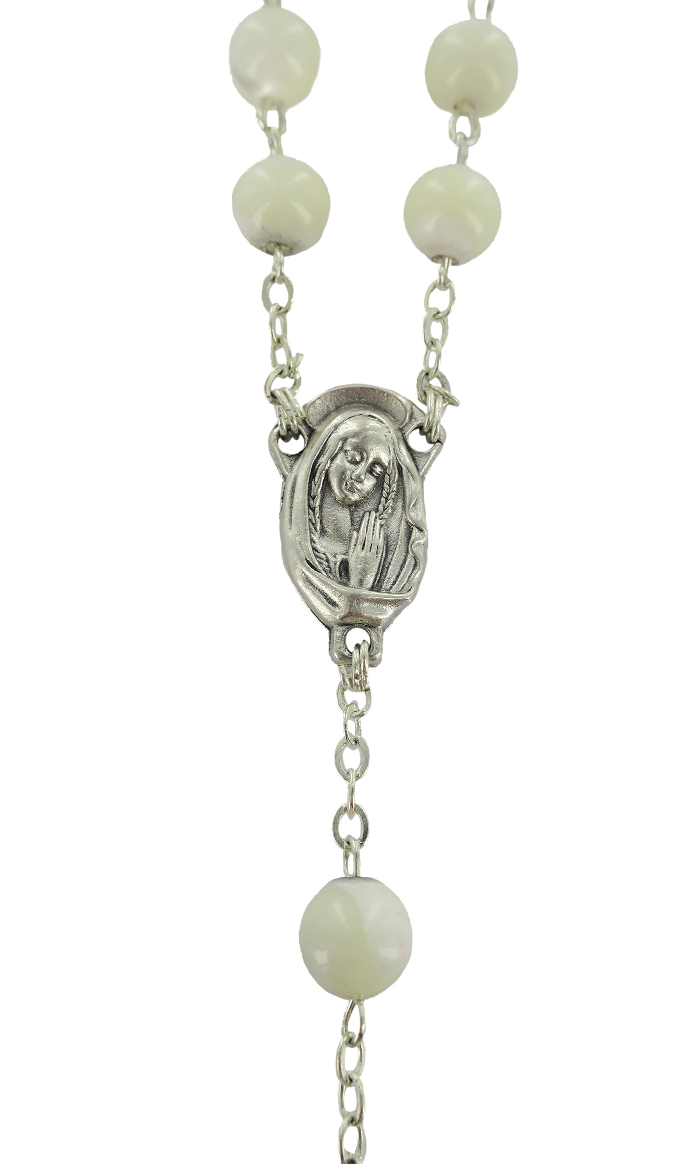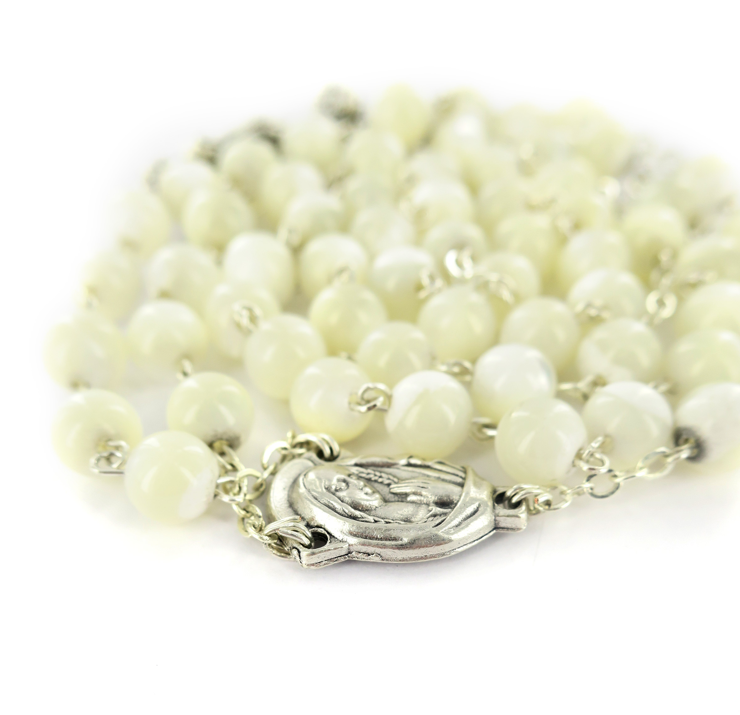 Il rosario si presenta con i grani di madreperla tondi del diametro 6. Il tutto rilegato a mano con filo di metallo argentato. Croce con Cristo riportato, crociera ovale con Madonnina pregante.