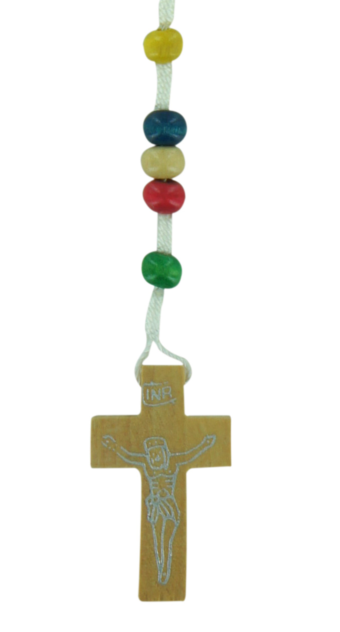 Rosario missionario con grani in legno diametro 7 mm legatura seta Il Rosario missionario ha lo scopo di far pregare per la pace nel mondo e per la conversione di tutti gli uomini. I cinque colori diversi rappresentano i cinque continenti e richiamano l'intenzione secondo la quale si deve pregare. La decina del Rosario, quella bianca è per la vecchia EUROPA, perche' sia capace di riappropriarsi della forza evangelizzatrice che ha generato tante Chiese; la decina gialla è per l'ASIA, che esplode di vita e di giovinezza; la decina verde è per l'AFRICA, provata dalla sofferenza, ma disponibile all'annuncio; la decina rossa è per l'AMERICA, vivaio di nuove forze missionarie; la decina azzurra è per il continente dell'OCEANIA e dell'Australia che attende una più capillare diffusione del Vangelo.