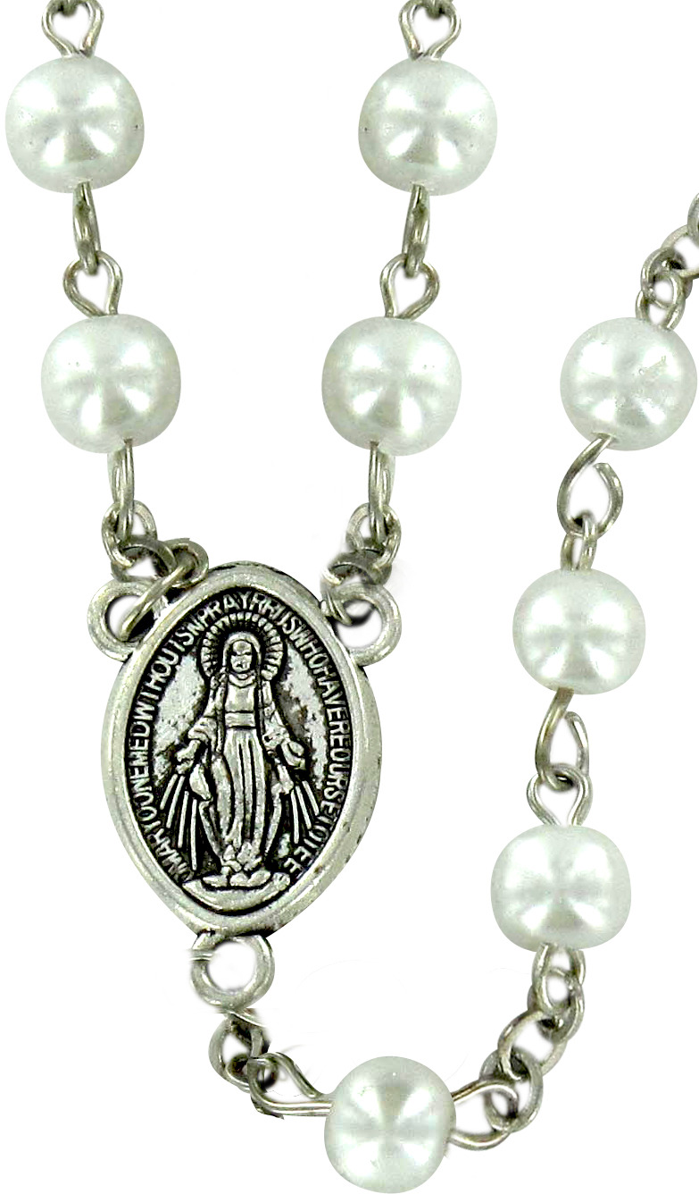Rosario con imitazione perla da mm 5 legatura ottone argentato