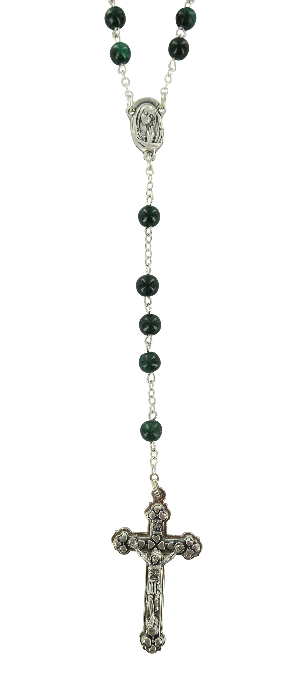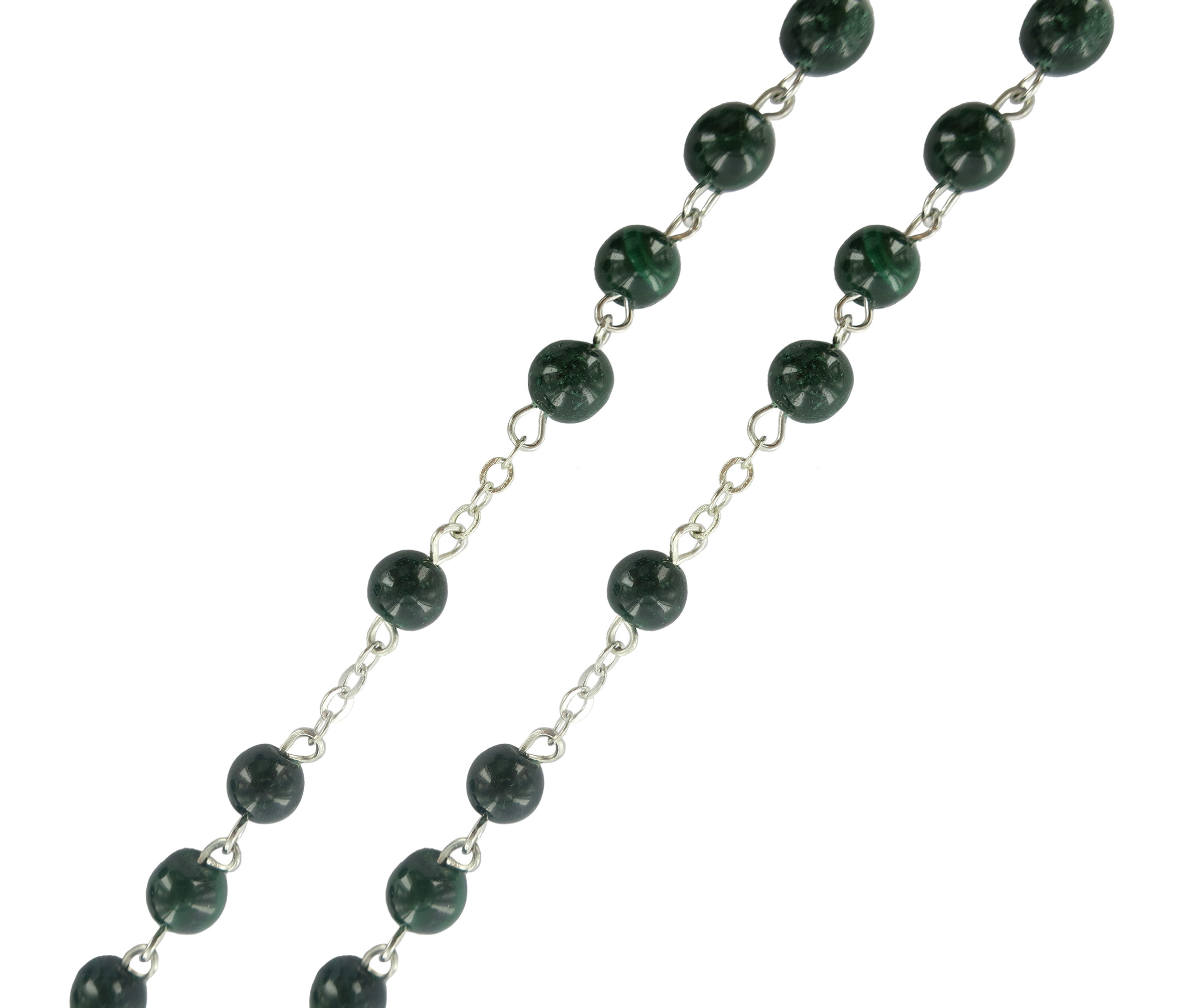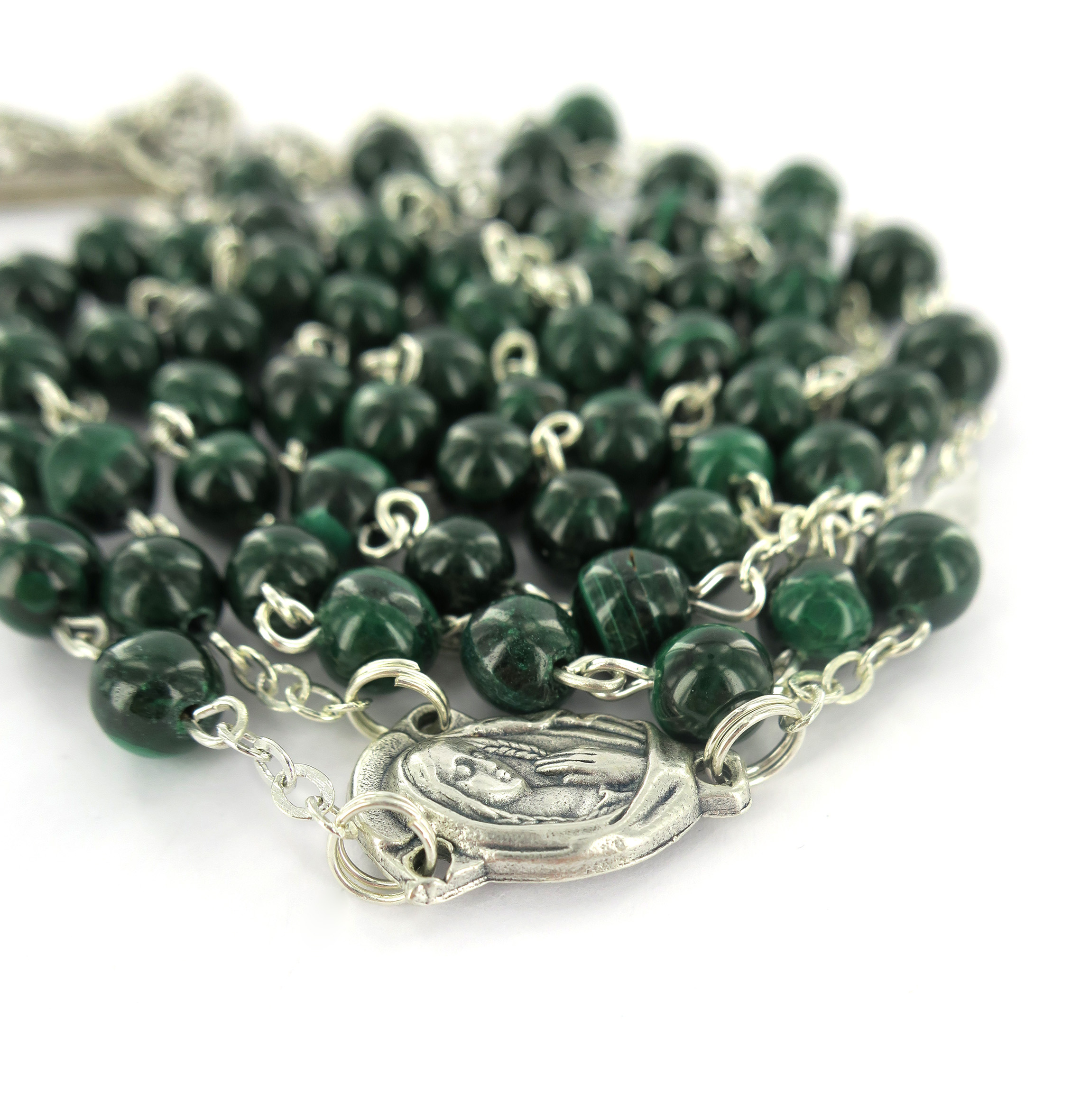 Il rosario è in legatura a mano con filo di metallo argentato, e i grani di mm 6 sono in vera malachite. Croce con Cristo riportato e crociera ovale con Madonnina pregante e su retro di essa vi è il Sacro Cuore di Gesù.