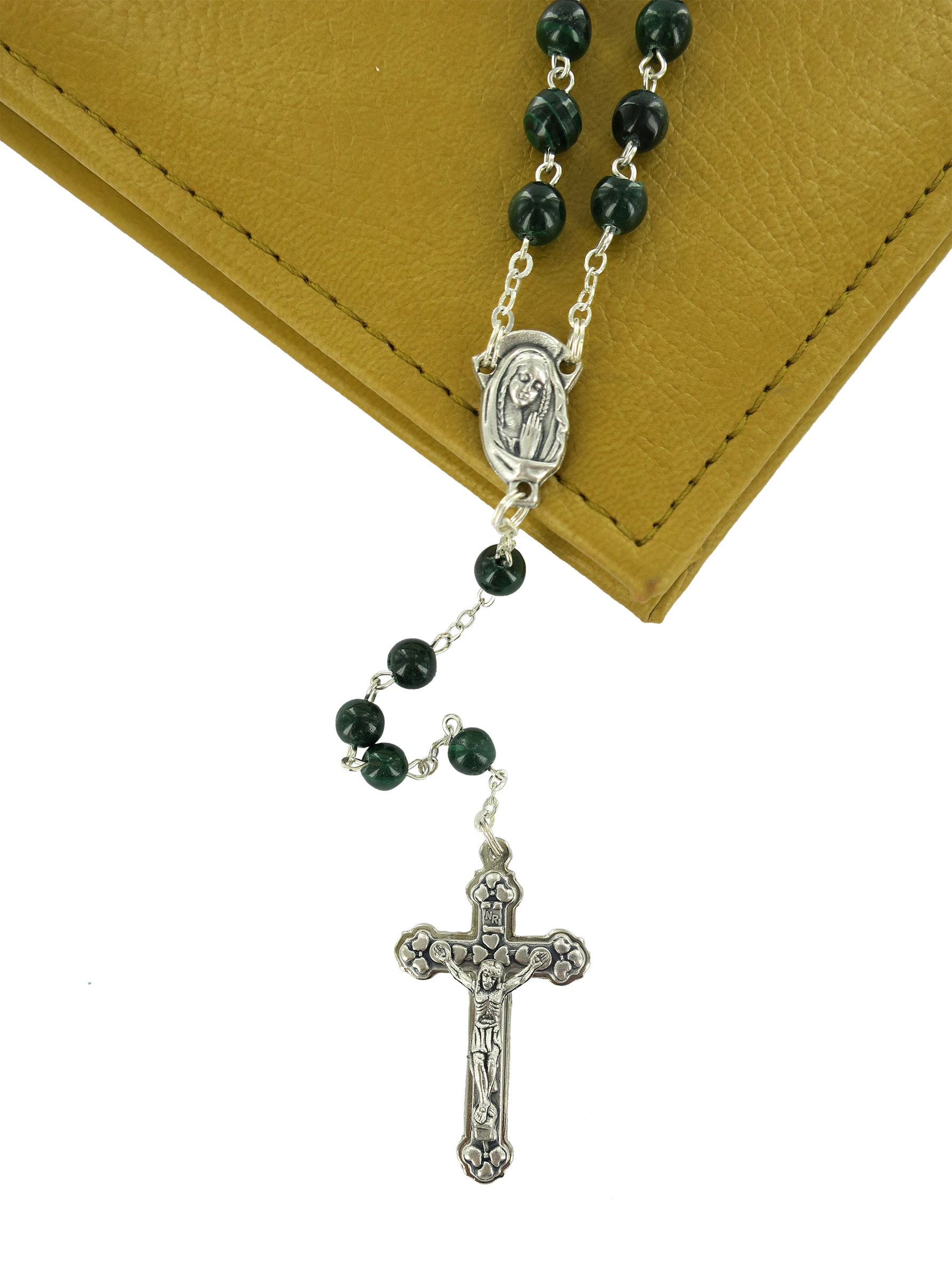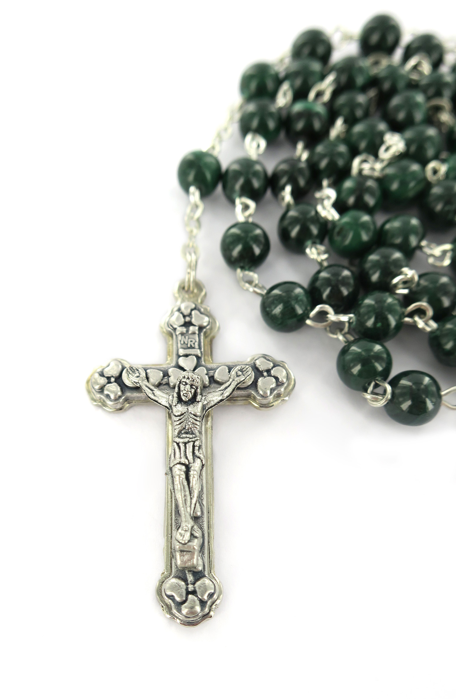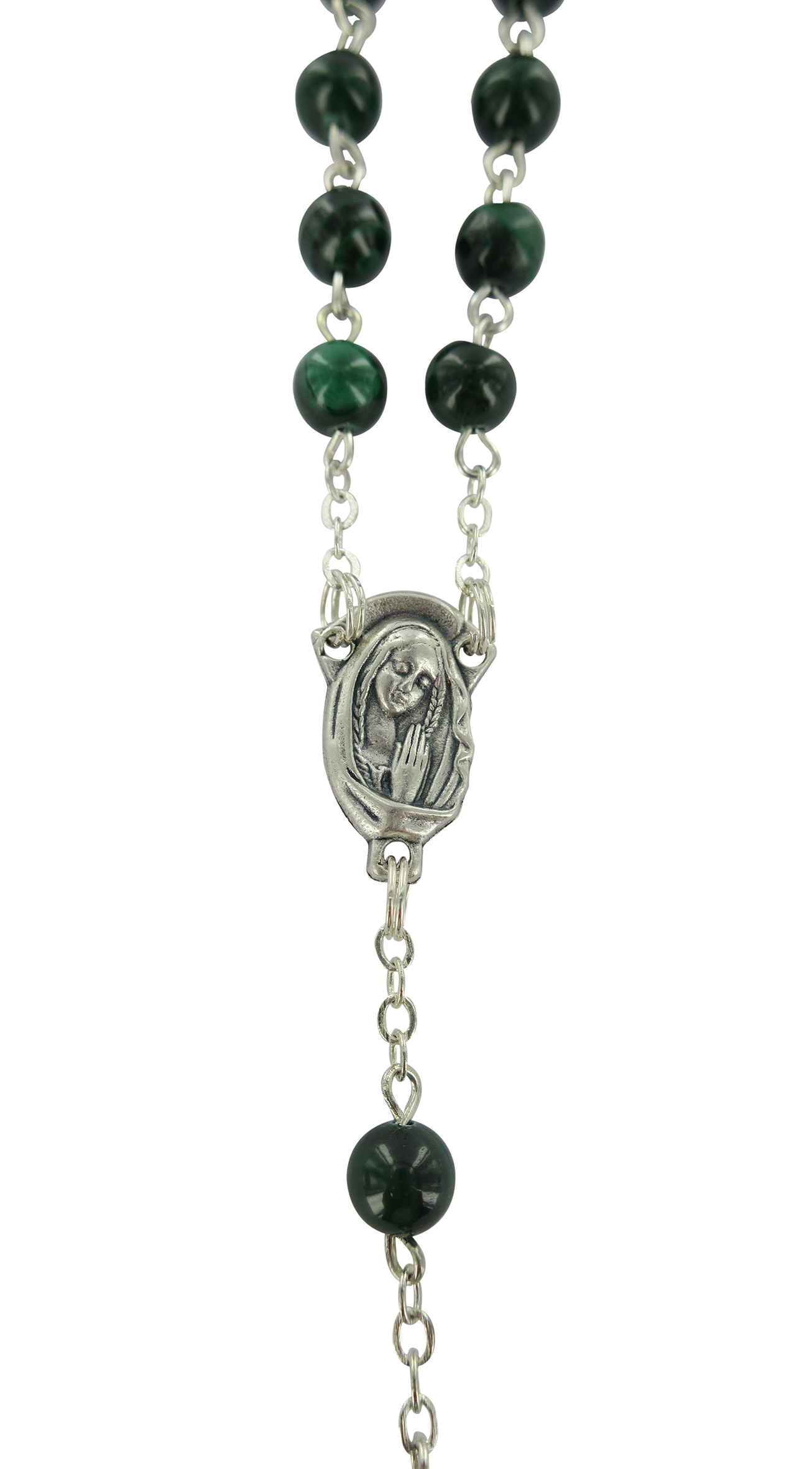 Il rosario è in legatura a mano con filo di metallo argentato, e i grani di mm 6 sono in vera malachite. Croce con Cristo riportato e crociera ovale con Madonnina pregante e su retro di essa vi è il Sacro Cuore di Gesù.