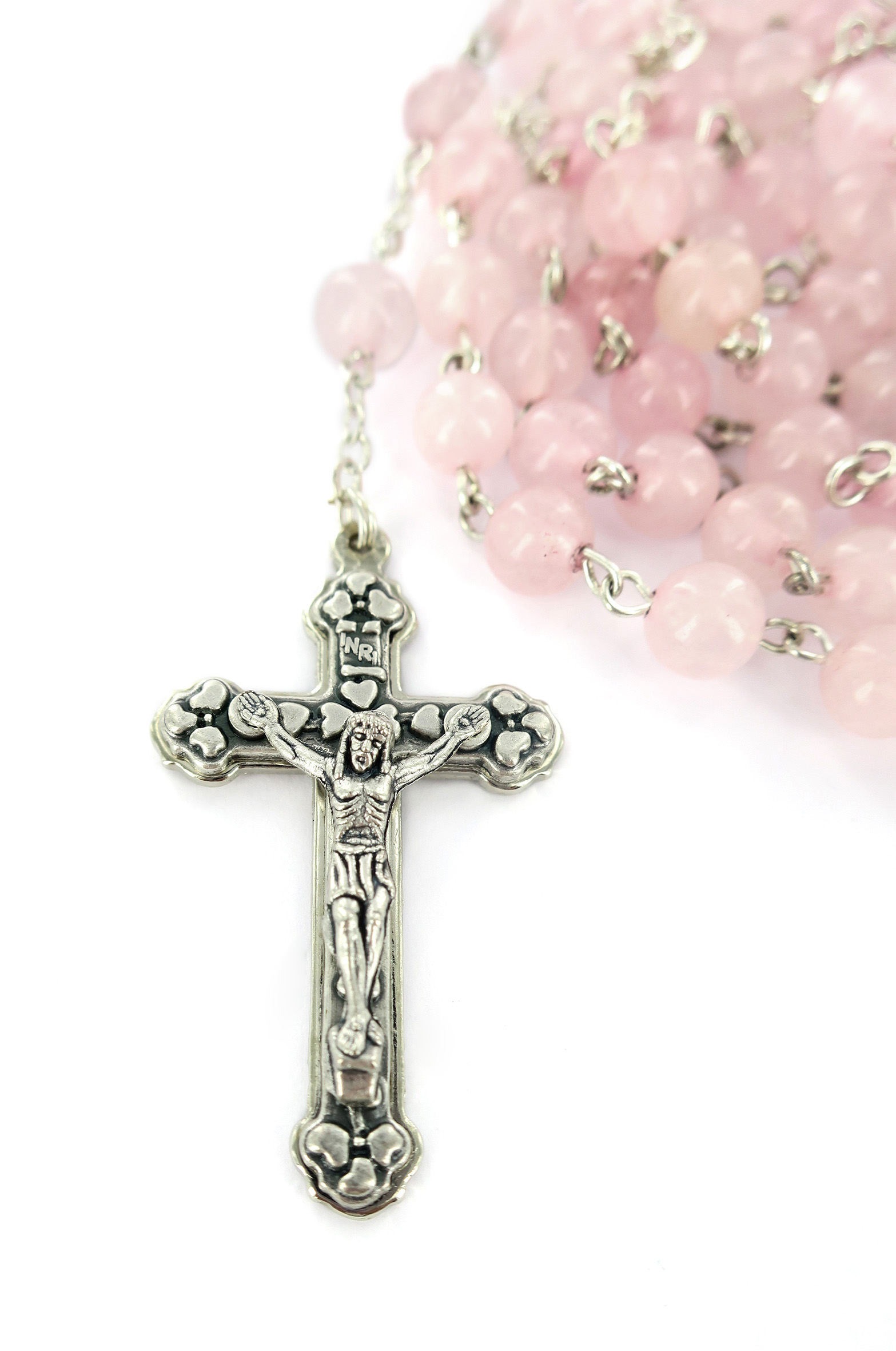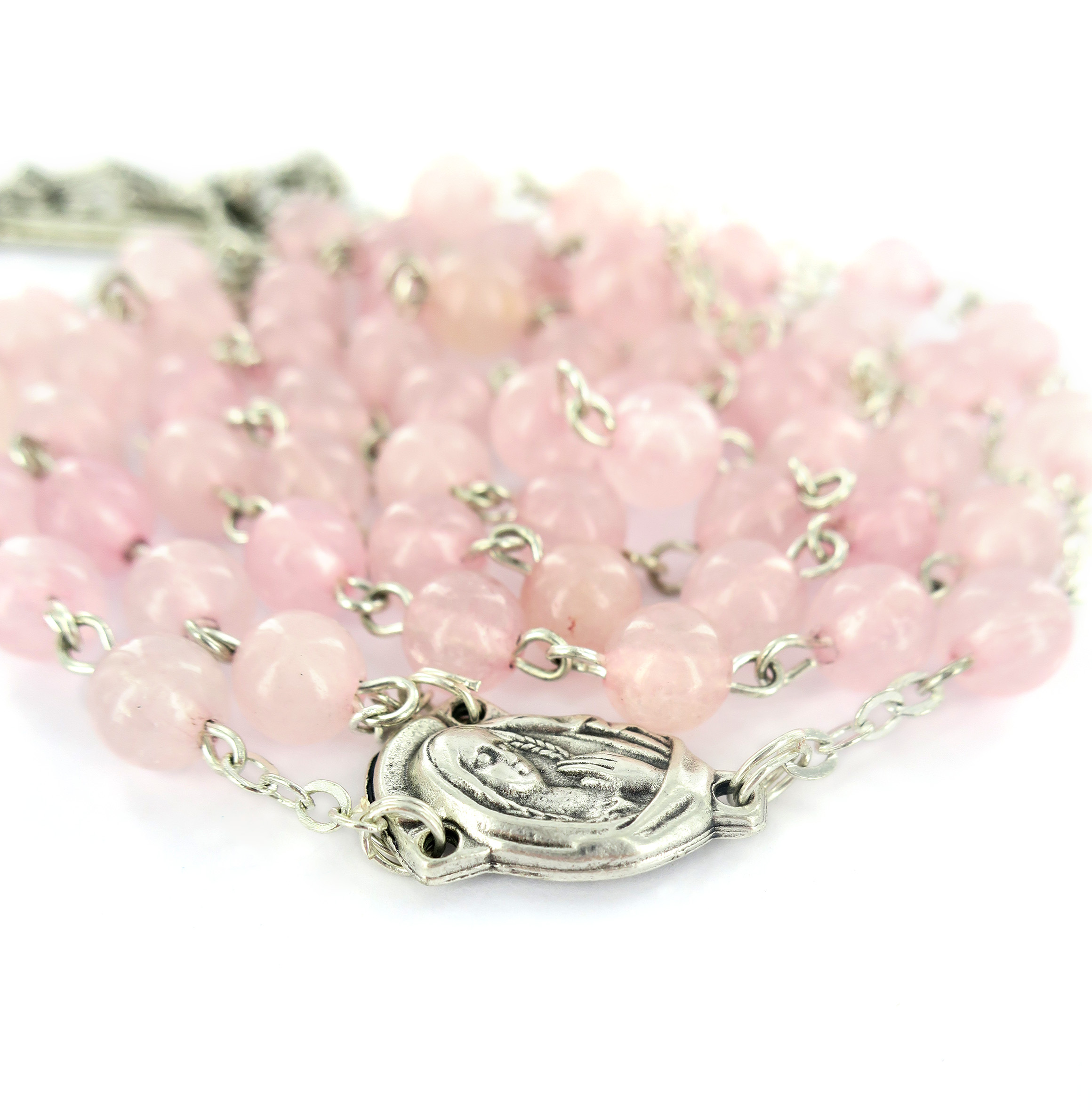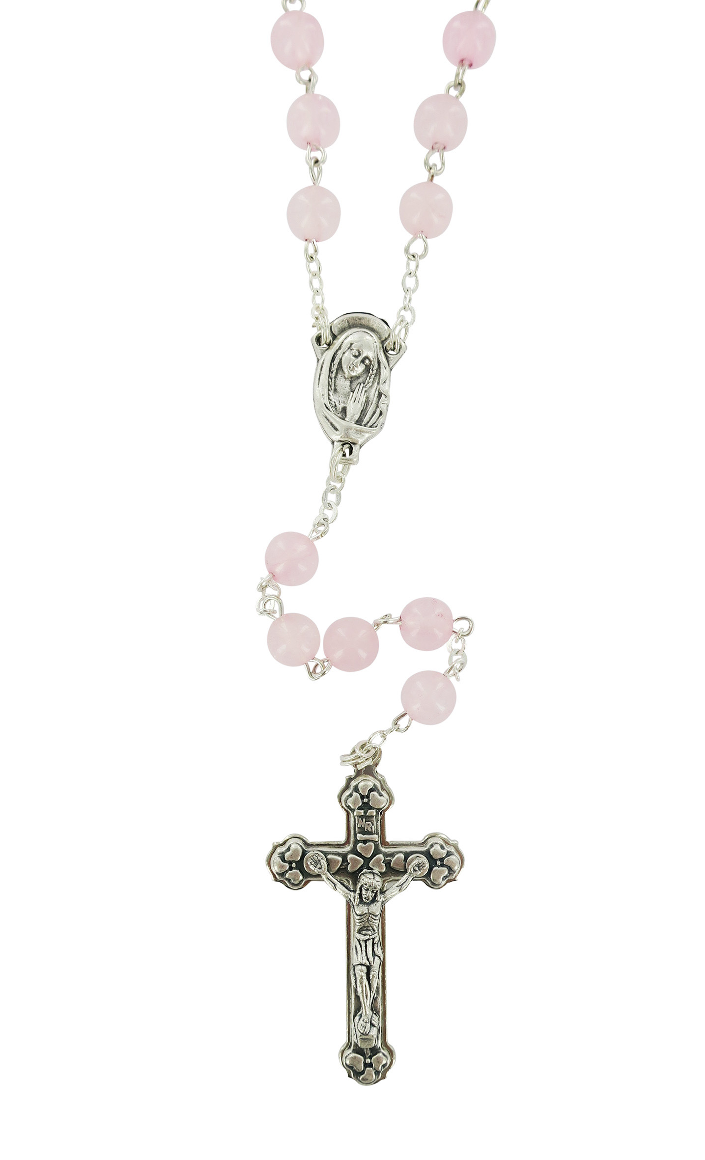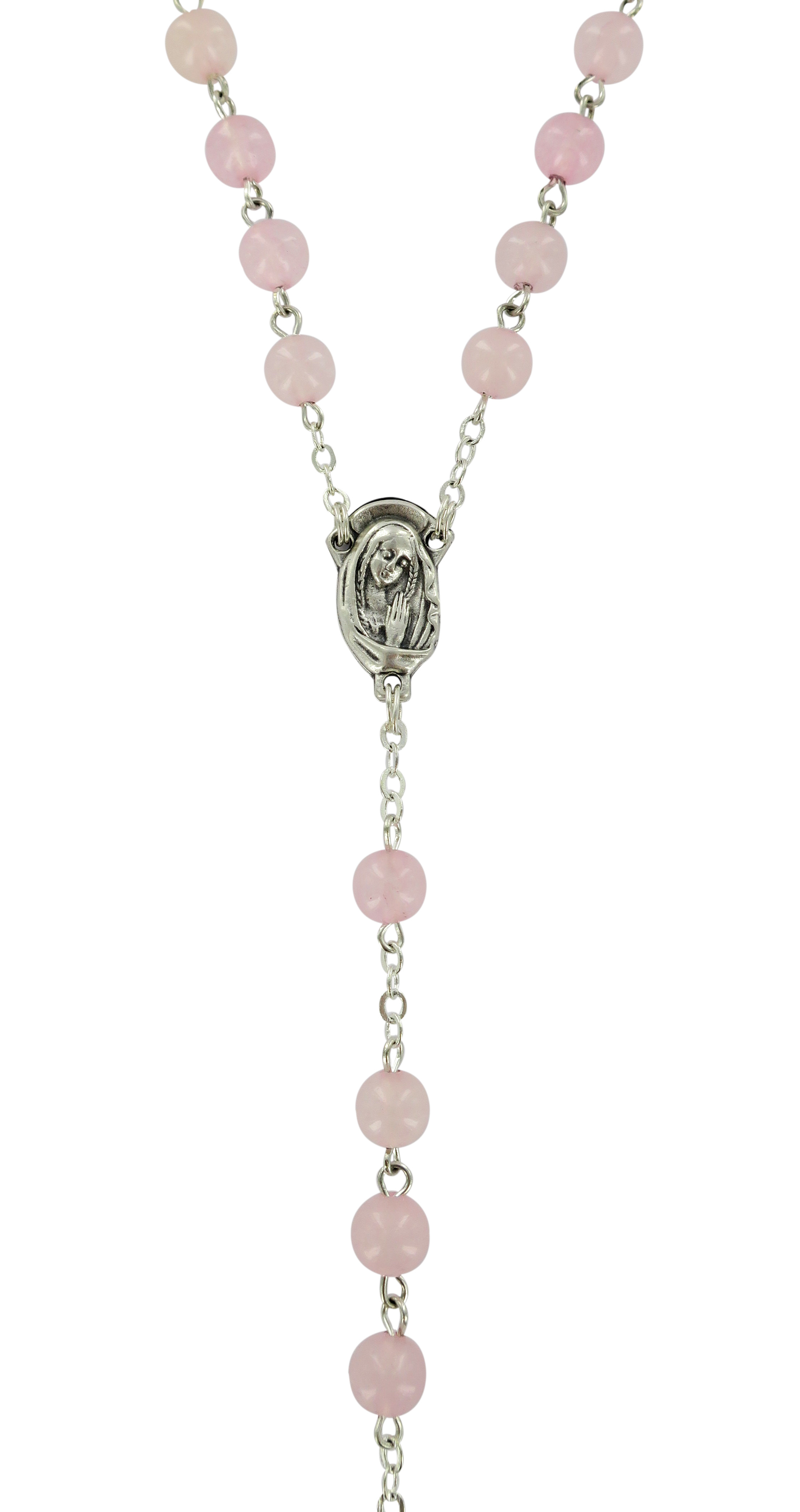 Il rosario è in legatura a mano con filo di metallo argentato, e i grani di mm 6 sono in vero quarzo rosa. Croce con Cristo riportato e crociera ovale con Madonnina pregante e su retro di essa vi è il Sacro Cuore di Gesù.
