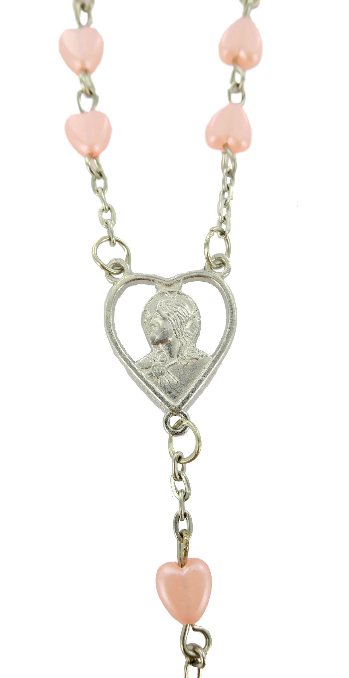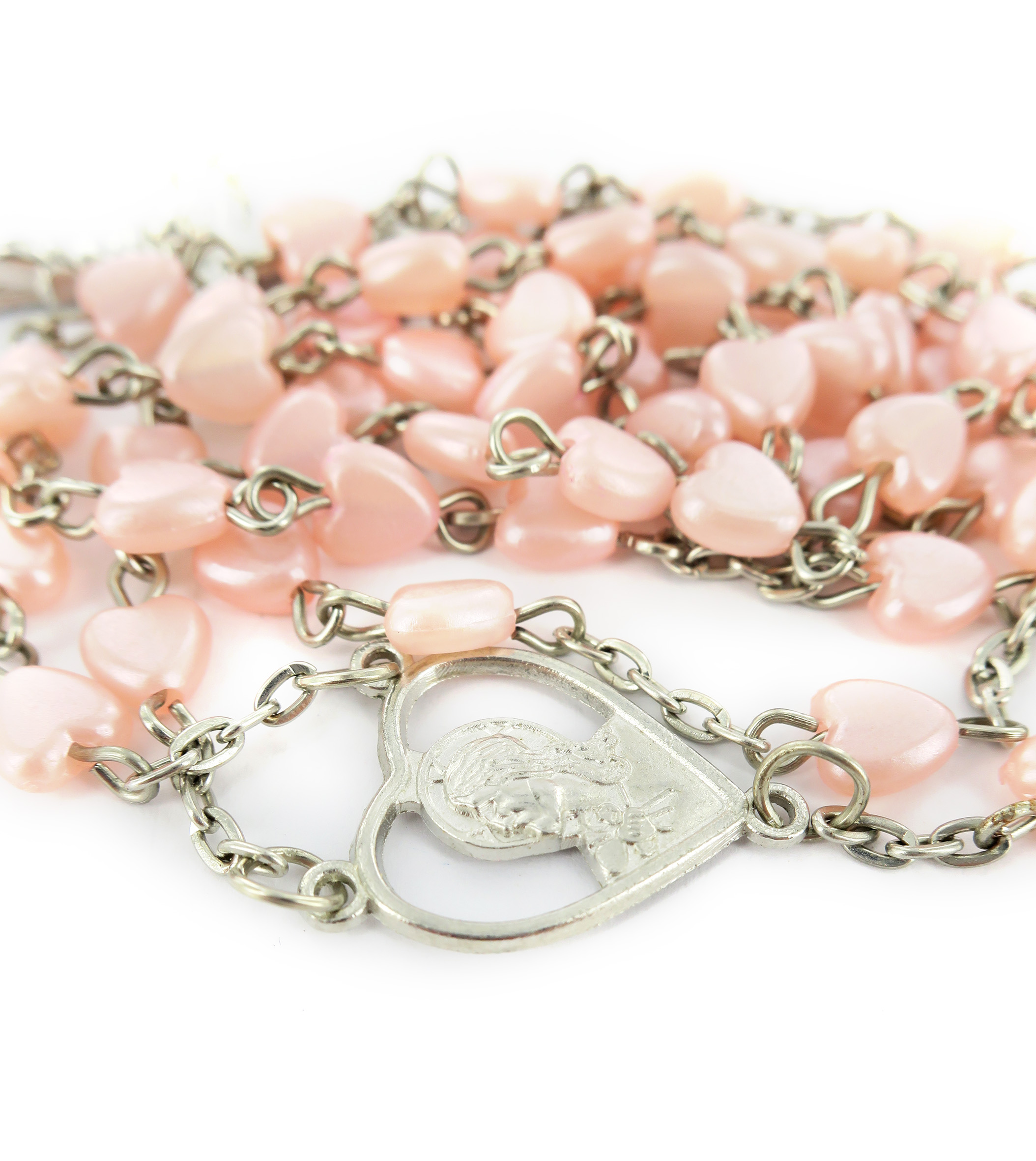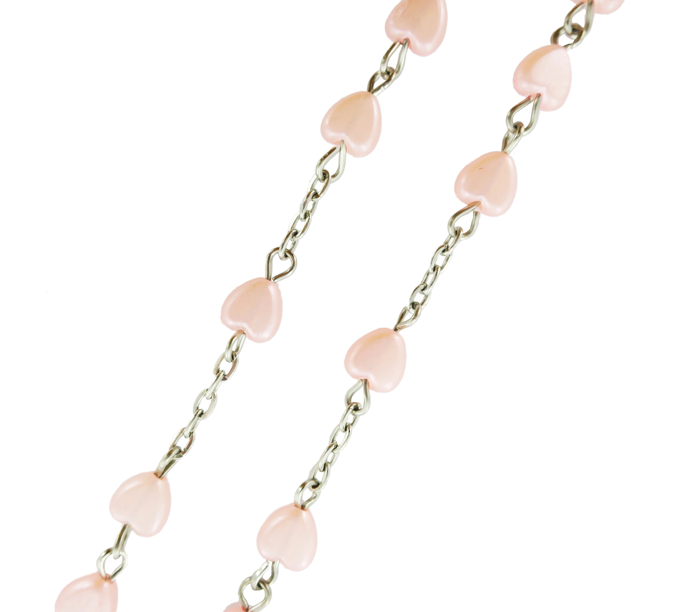 Rosario in plastica con grani a forma di cuore di colore rosa e legatura in metallo argentato
