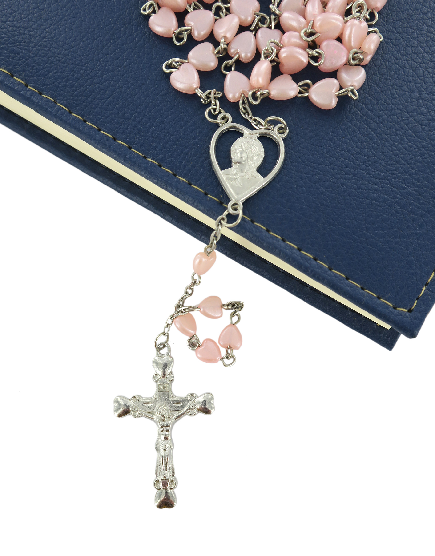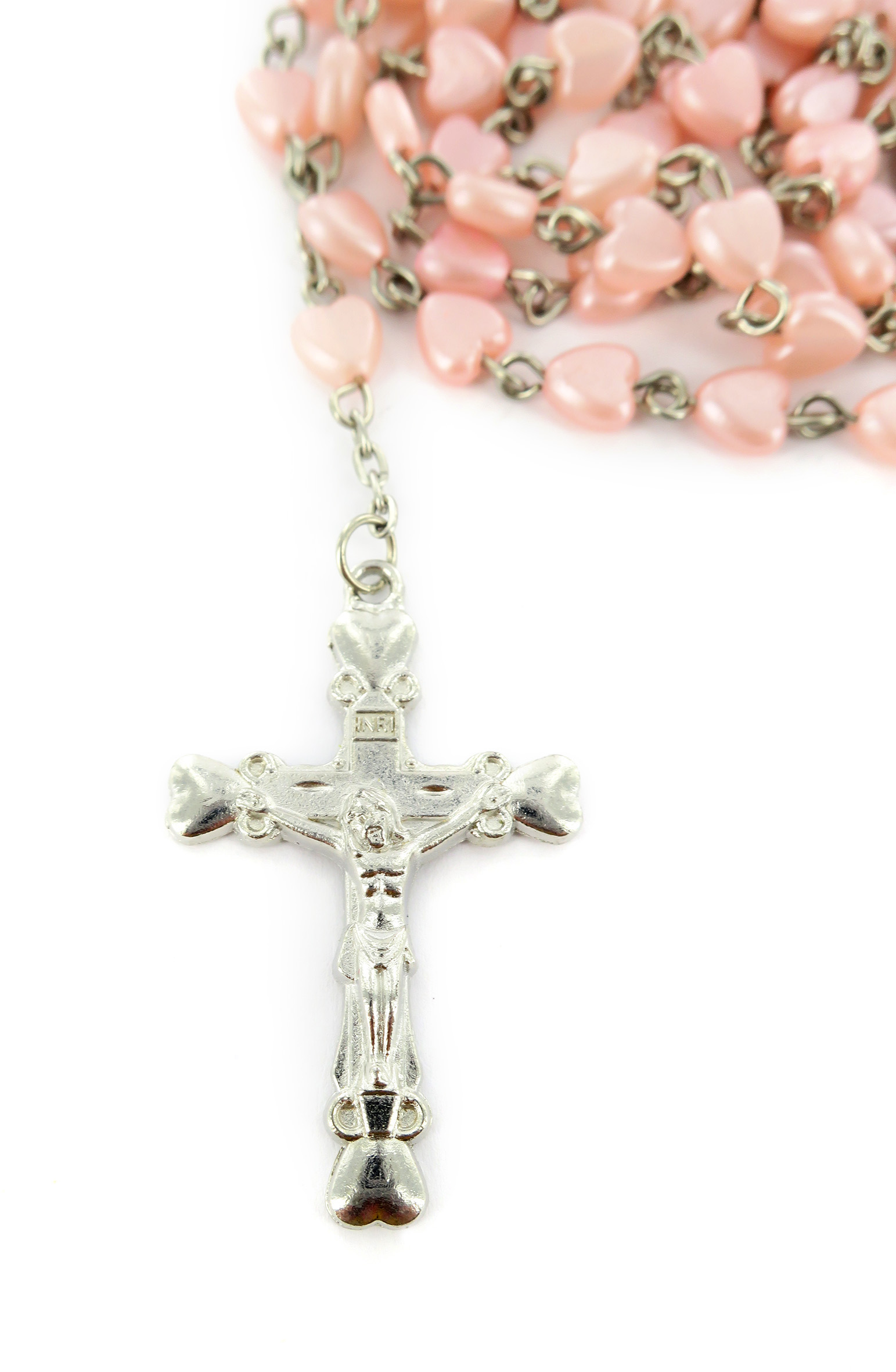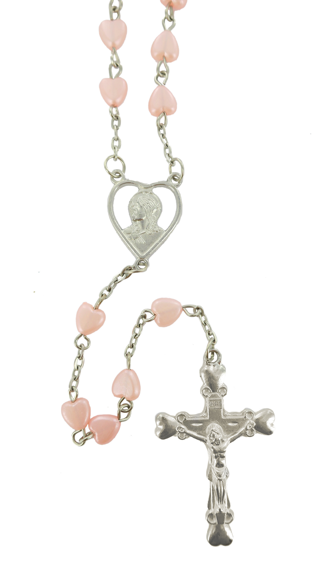 Rosario in plastica con grani a forma di cuore di colore rosa e legatura in metallo argentato
