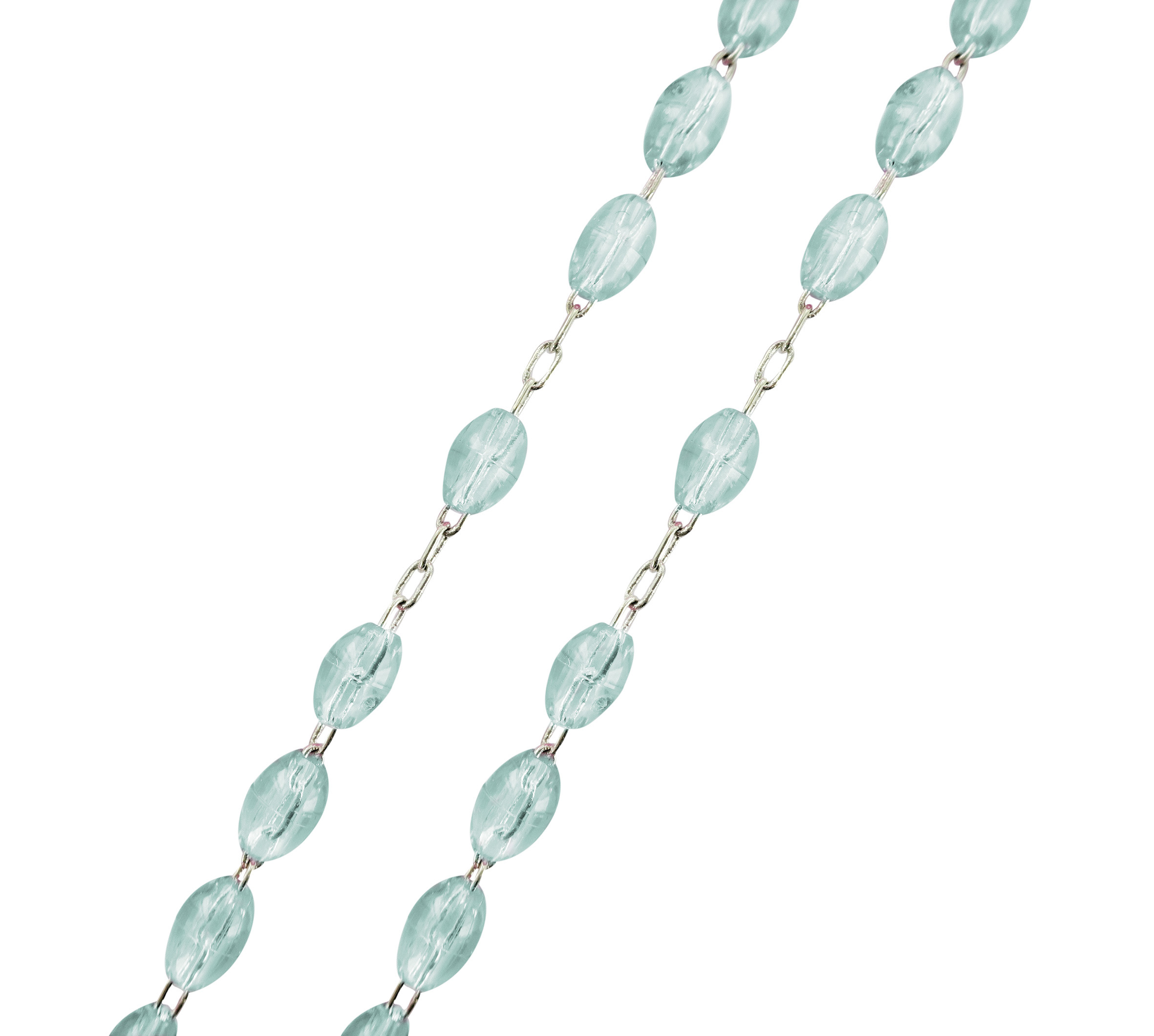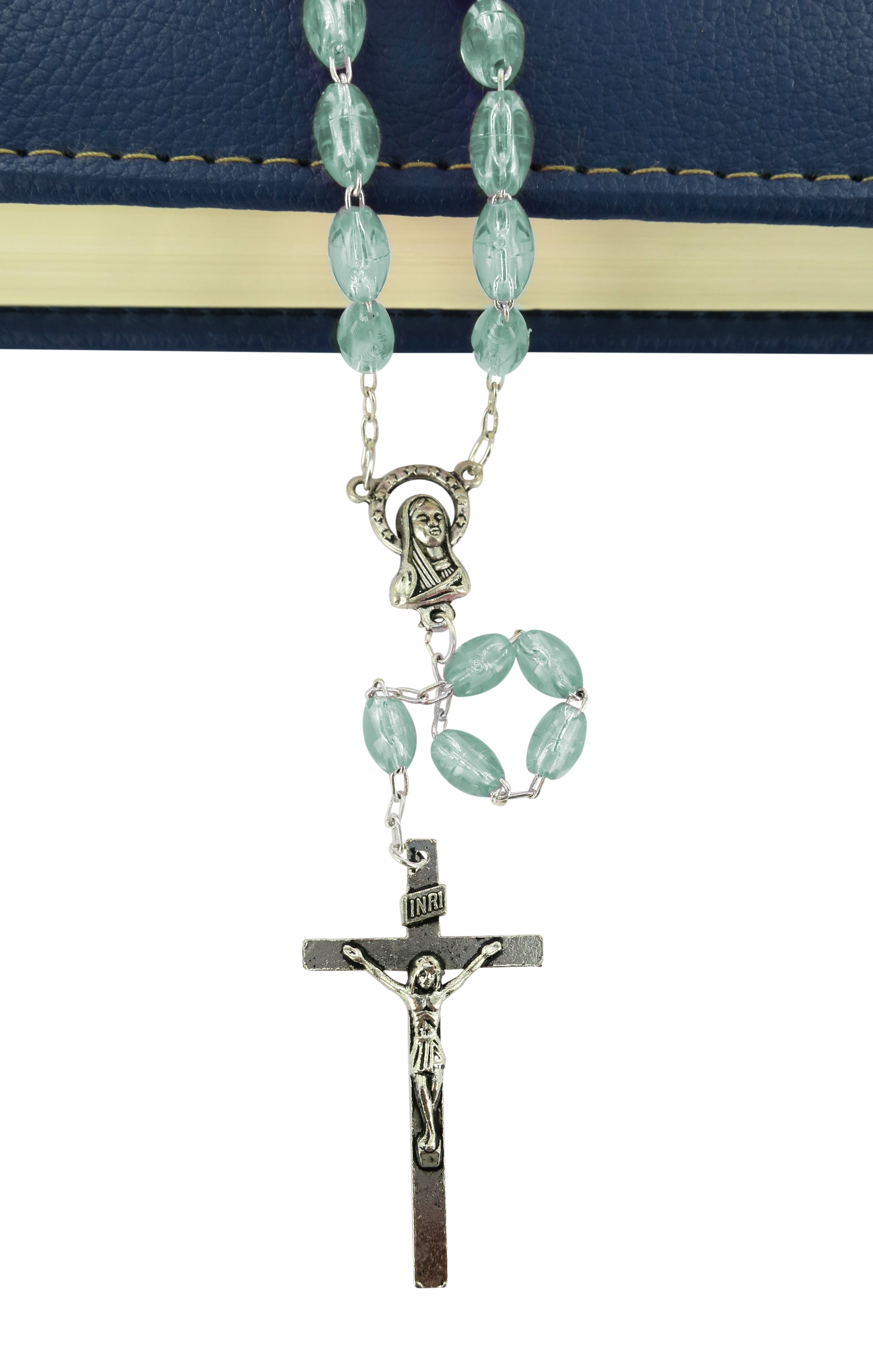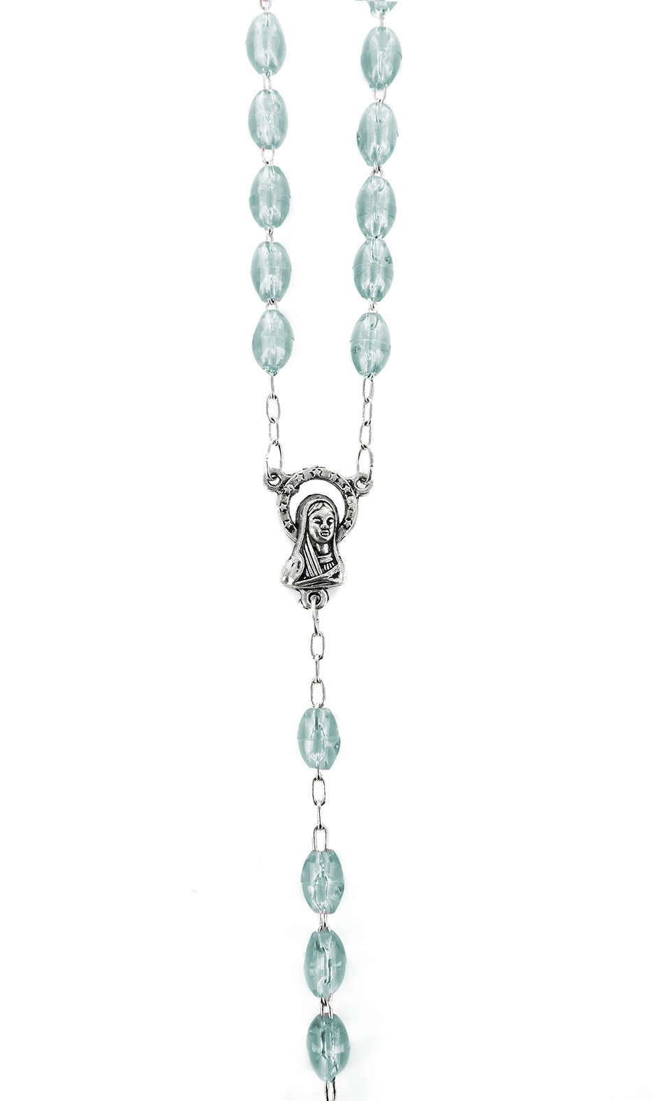Rosario con legatura a macchina con grani ovali in plastica di colore azzurro. Sulla Crociera è visibile da un lato l'immagine della Madonna e dall'altro l'immagine del Sacro cuore di Gesù. Il prodotto è completamente realizzato in Italia. Il Santo Rosario è stato l'oggetto delle più vigile attenzione e premurosa sollecitudine da parte di tutti i Pontefici, che hanno visto il Rosario come una preghiera contemplativa che è insieme di lode e di supplica, efficace nel promuovere la vita cristiana e l'impegno apostolico. Anche Paolo VI e Giovanni Paolo II più volte hanno rivolto ai cristiani un appello perchè fossero innalzate supplici preghiere alla Beata Vergine del Rosario, per implorare da Dio il bene supremo della pace e il risveglio della vita cristiana.
