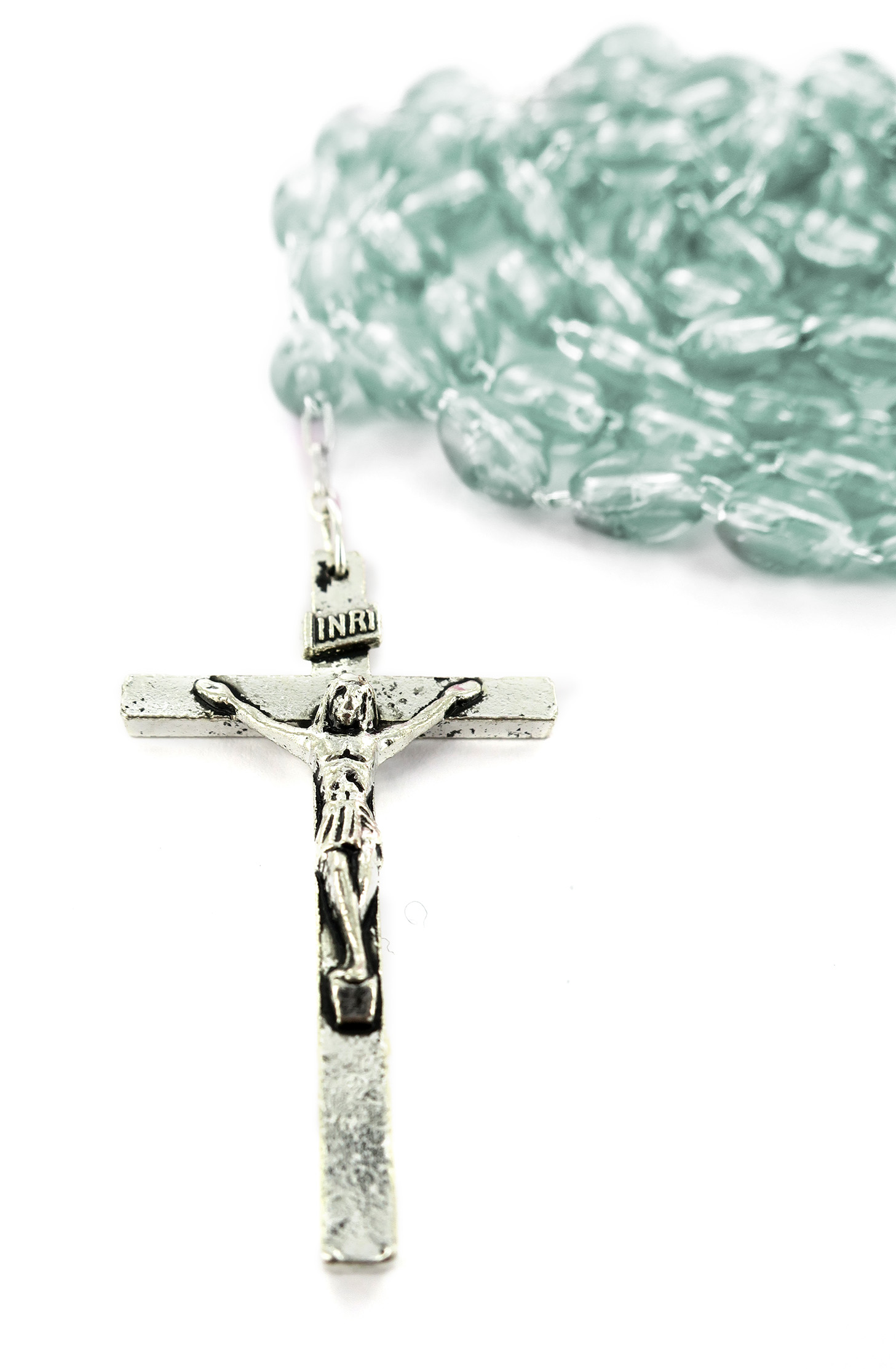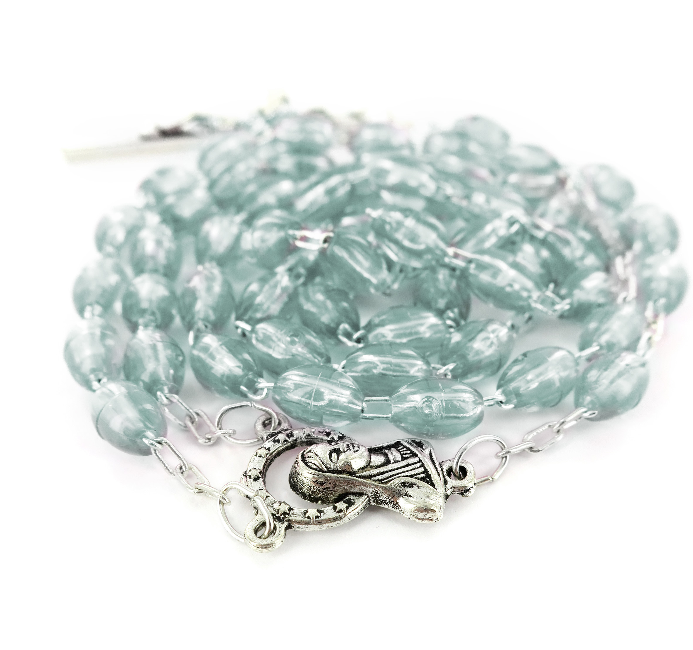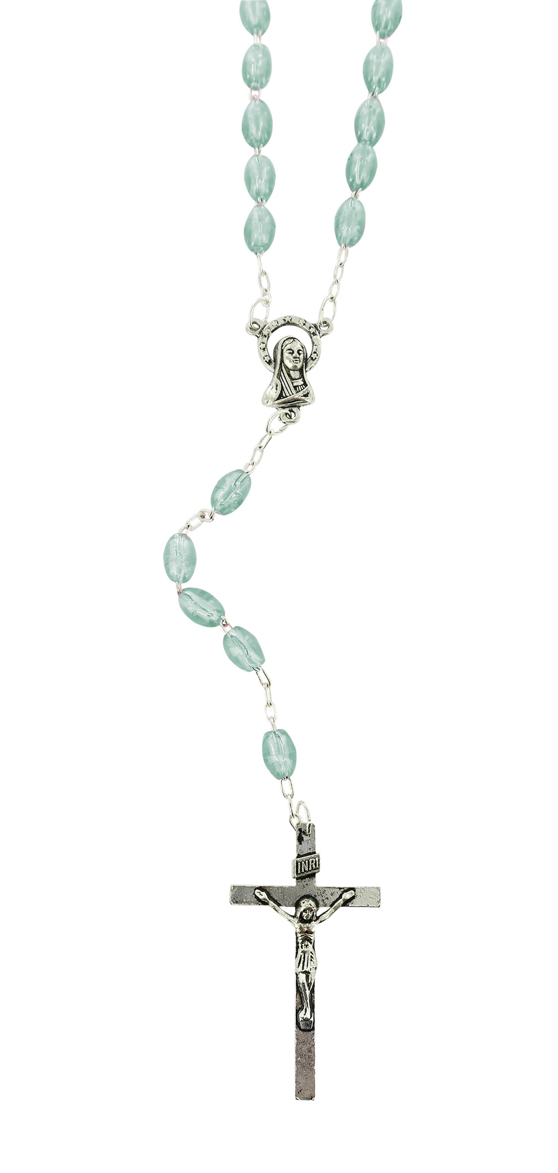 Rosario con legatura a macchina con grani ovali in plastica di colore azzurro. Sulla Crociera è visibile da un lato l'immagine della Madonna e dall'altro l'immagine del Sacro cuore di Gesù. Il prodotto è completamente realizzato in Italia. Il Santo Rosario è stato l'oggetto delle più vigile attenzione e premurosa sollecitudine da parte di tutti i Pontefici, che hanno visto il Rosario come una preghiera contemplativa che è insieme di lode e di supplica, efficace nel promuovere la vita cristiana e l'impegno apostolico. Anche Paolo VI e Giovanni Paolo II più volte hanno rivolto ai cristiani un appello perchè fossero innalzate supplici preghiere alla Beata Vergine del Rosario, per implorare da Dio il bene supremo della pace e il risveglio della vita cristiana.