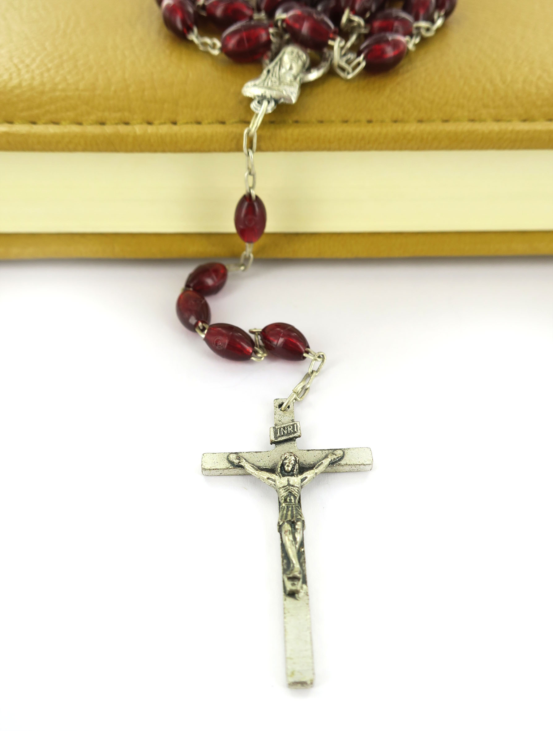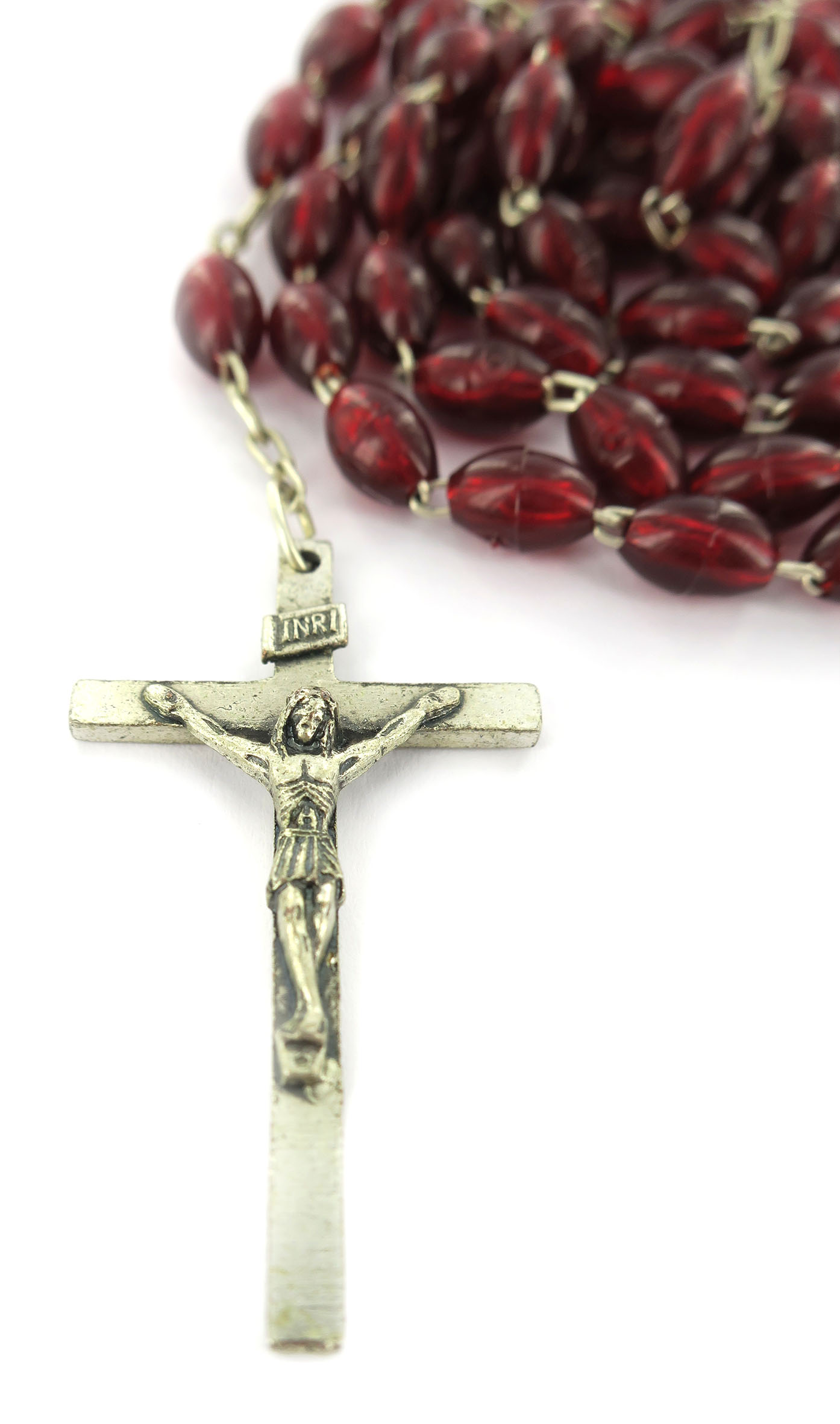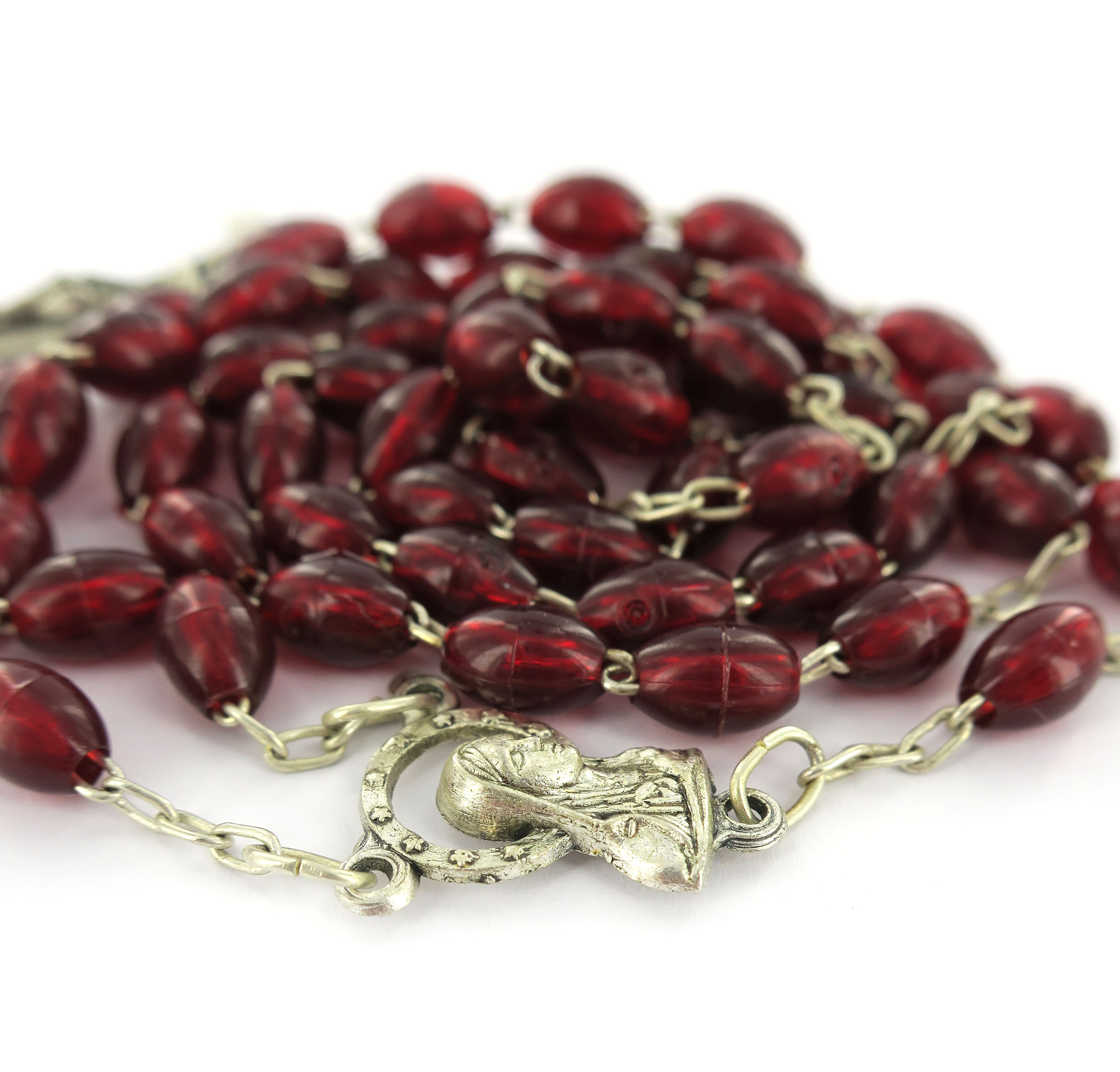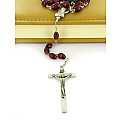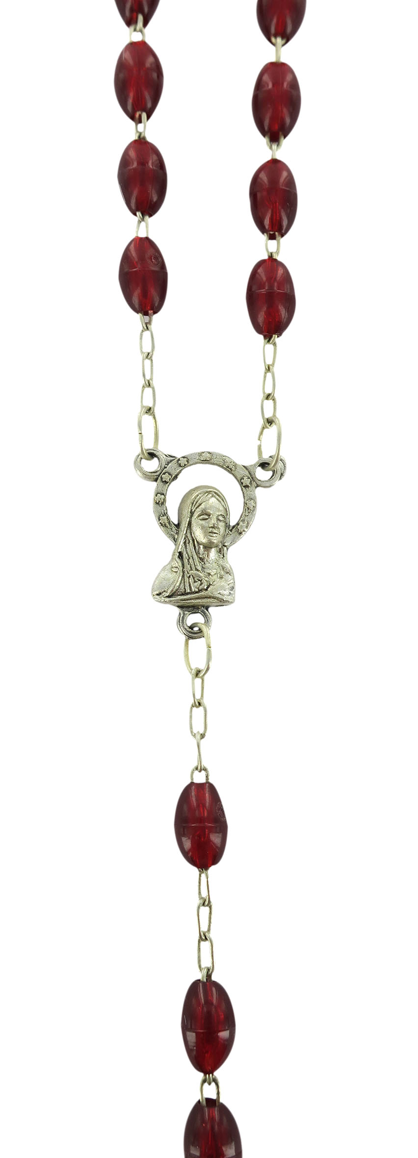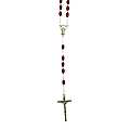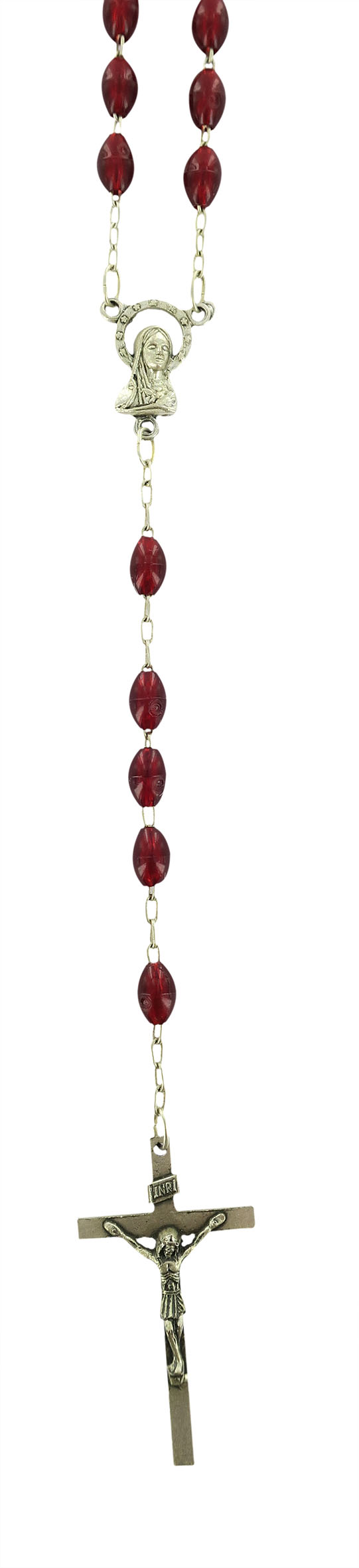 Rosario con legatura a macchina con grani ovali in plastica di colore rosso granato. Sulla Crociera è visibile da un lato l'immagine della Madonna e dall'altro l'immagine del Sacro cuore di Gesù. Il prodotto è completamente realizzato in Italia. Il Santo Rosario è stato l'oggetto delle più vigile attenzione e premurosa sollecitudine da parte di tutti i Pontefici, che hanno visto il Rosario come una preghiera contemplativa che è insieme di lode e di supplica, efficace nel promuovere la vita cristiana e l'impegno apostolico. Anche Paolo VI e Giovanni Paolo II più volte hanno rivolto ai cristiani un appello perchè fossero innalzate supplici preghiere alla Beata Vergine del Rosario, per implorare da Dio il bene supremo della pace e il risveglio della vita cristiana.