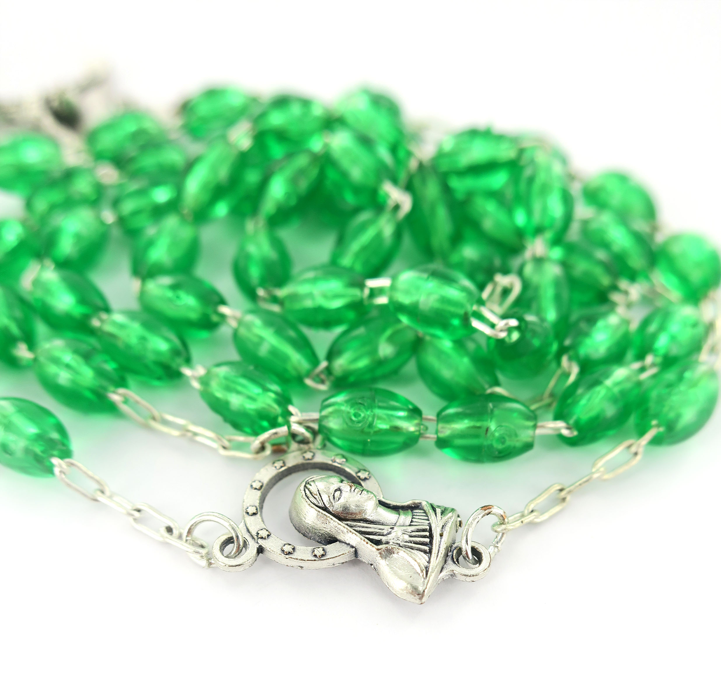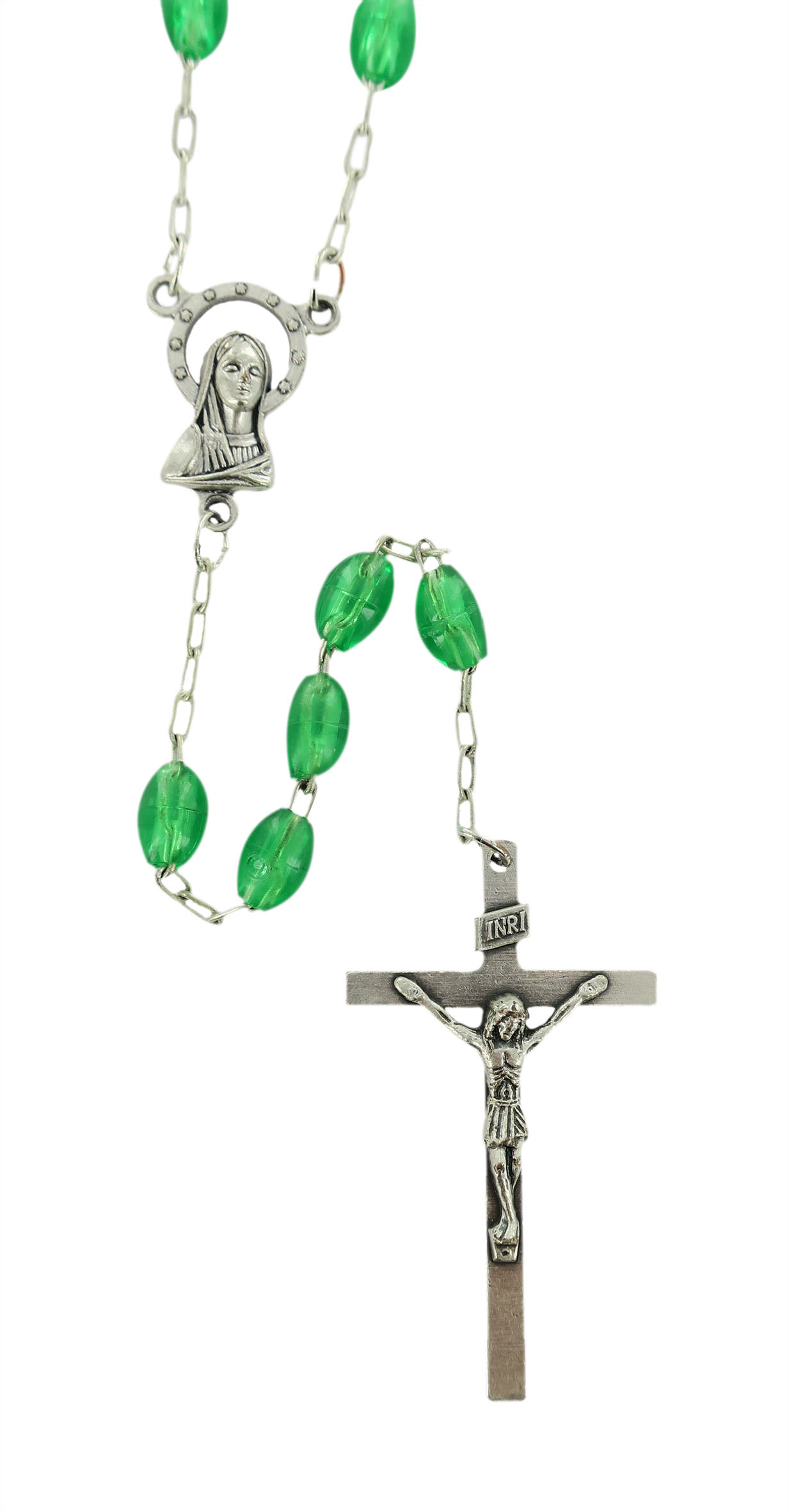 Rosario con legatura a macchina con grani ovali in plastica di colore verde. Sulla Crociera è visibile da un lato l'immagine della Madonna e dall'altro l'immagine del Sacro cuore di Gesù. Il prodotto è completamente realizzato in Italia. Il Santo Rosario è stato l'oggetto delle più vigile attenzione e premurosa sollecitudine da parte di tutti i Pontefici, che hanno visto il Rosario come una preghiera contemplativa che è insieme di lode e di supplica, efficace nel promuovere la vita cristiana e l'impegno apostolico. Anche Paolo VI e Giovanni Paolo II più volte hanno rivolto ai cristiani un appello perchè fossero innalzate supplici preghiere alla Beata Vergine del Rosario, per implorare da Dio il bene supremo della pace e il risveglio della vita cristiana.