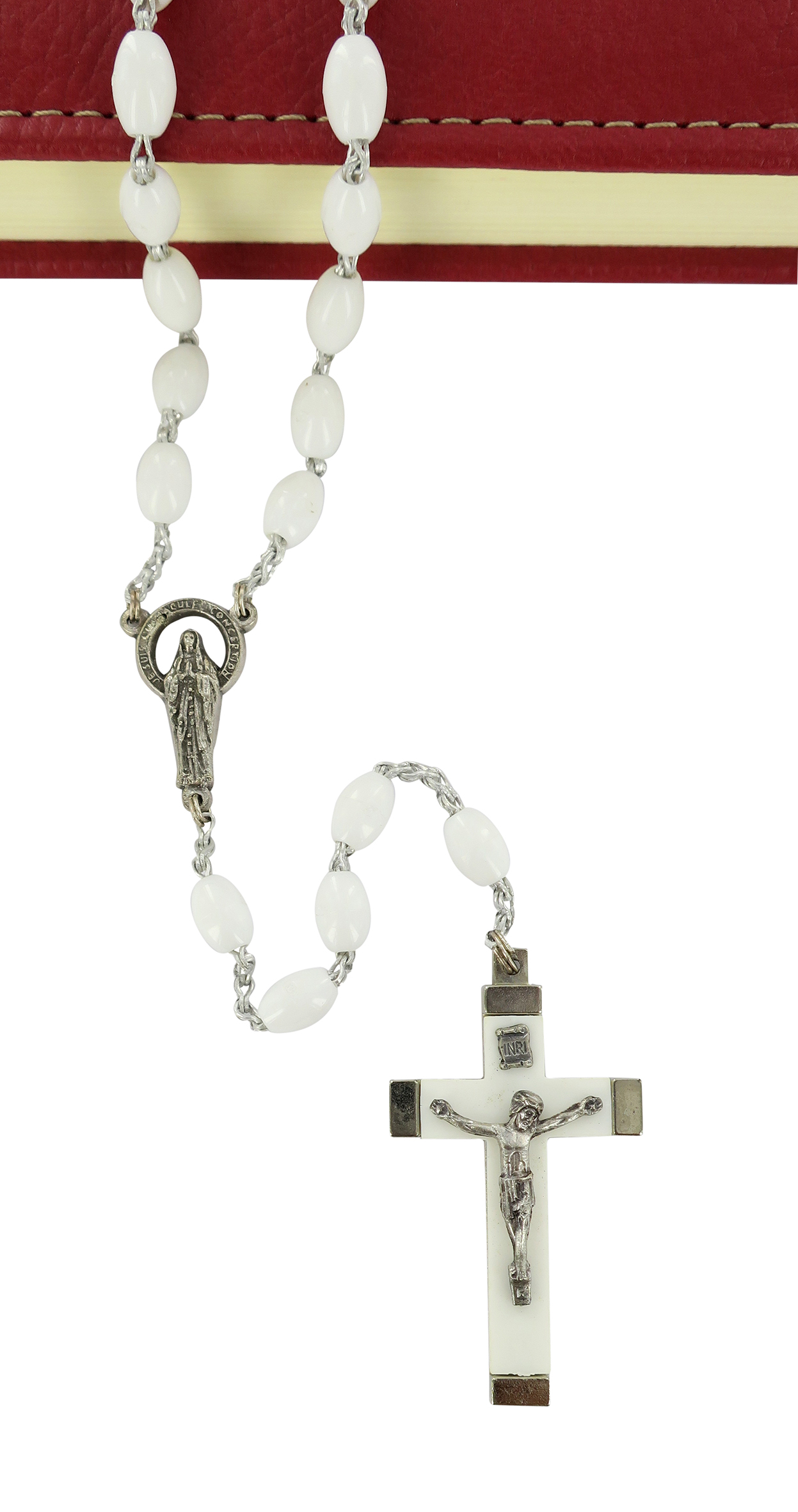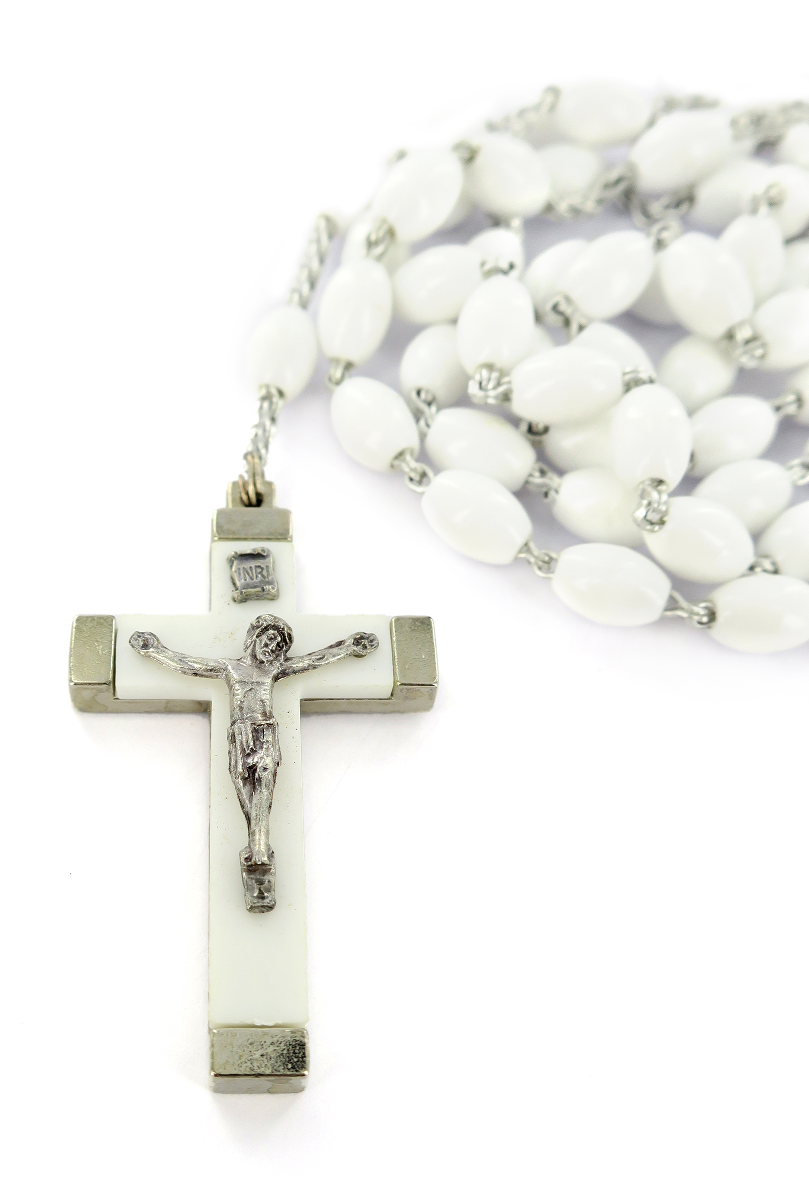 Rosario con legatura a macchina con grani ovali in plastica di colore bianco. Sulla Crociera è visibile l'immagine della Madonna di Lourdes. Il prodotto è completamente realizzato in Italia. Il Santo Rosario è stato l'oggetto delle più vigile attenzione e premurosa sollecitudine da parte di tutti i Pontefici, che hanno visto il Rosario come una preghiera contemplativa che è insieme di lode e di supplica, efficace nel promuovere la vita cristiana e l'impegno apostolico. Anche Paolo VI e Giovanni Paolo II più volte hanno rivolto ai cristiani un appello perchè fossero innalzate supplici preghiere alla Beata Vergine del Rosario, per implorare da Dio il bene supremo della pace e il risveglio della vita cristiana.
