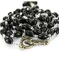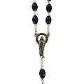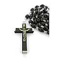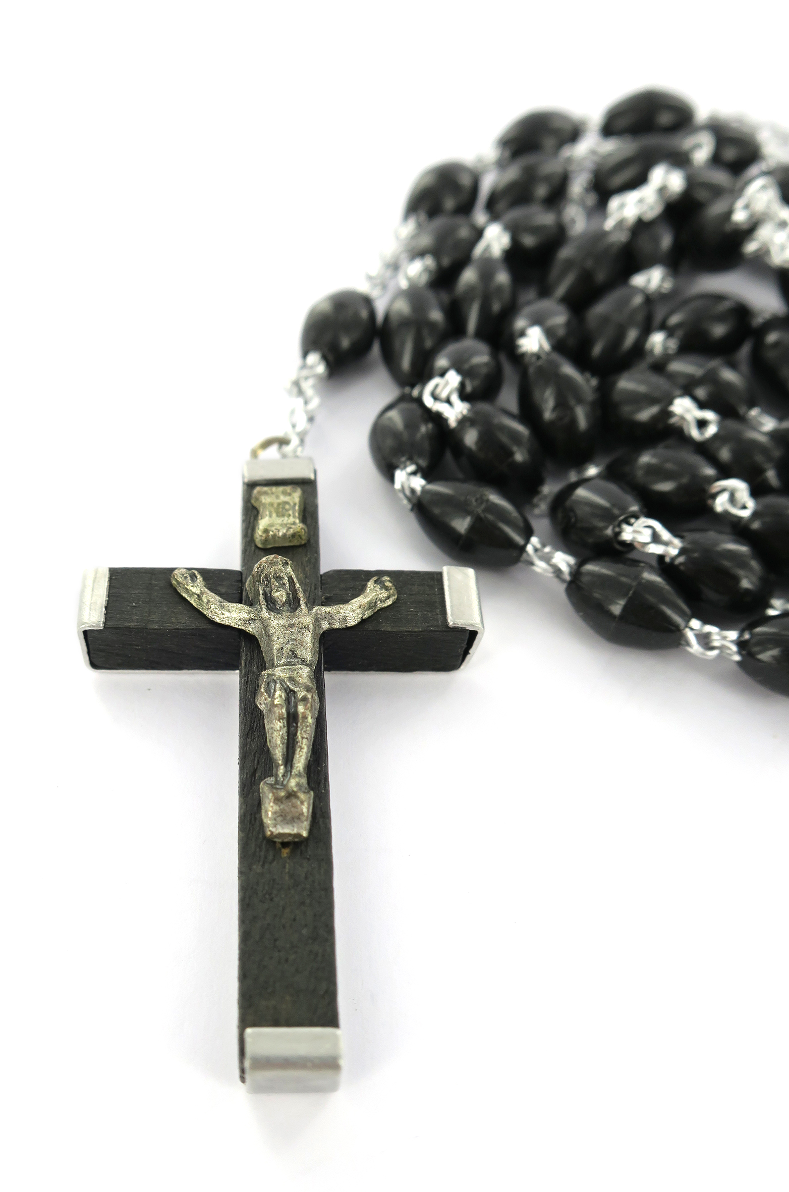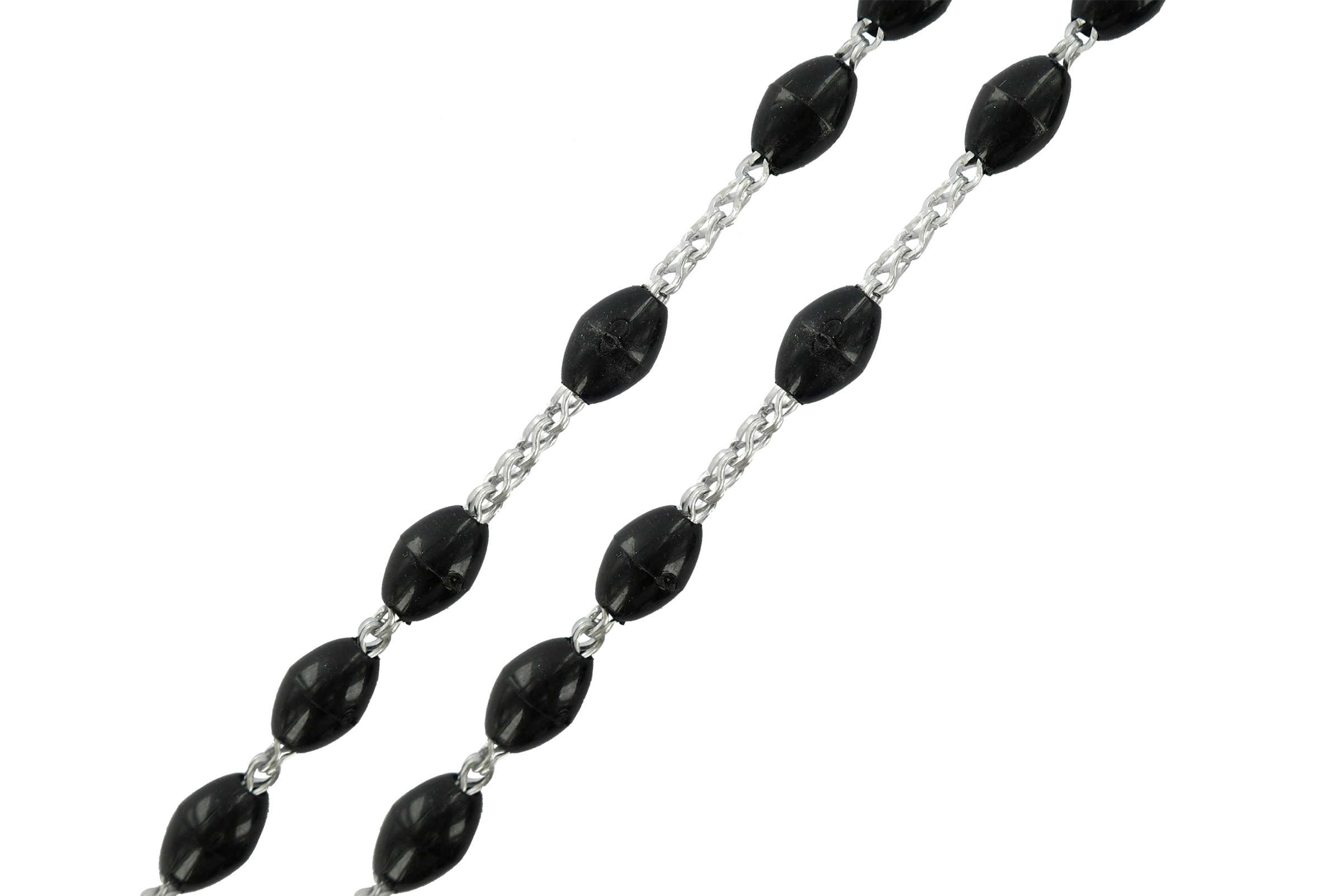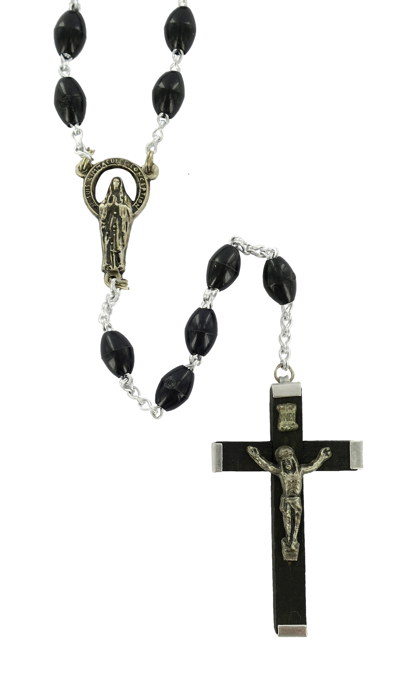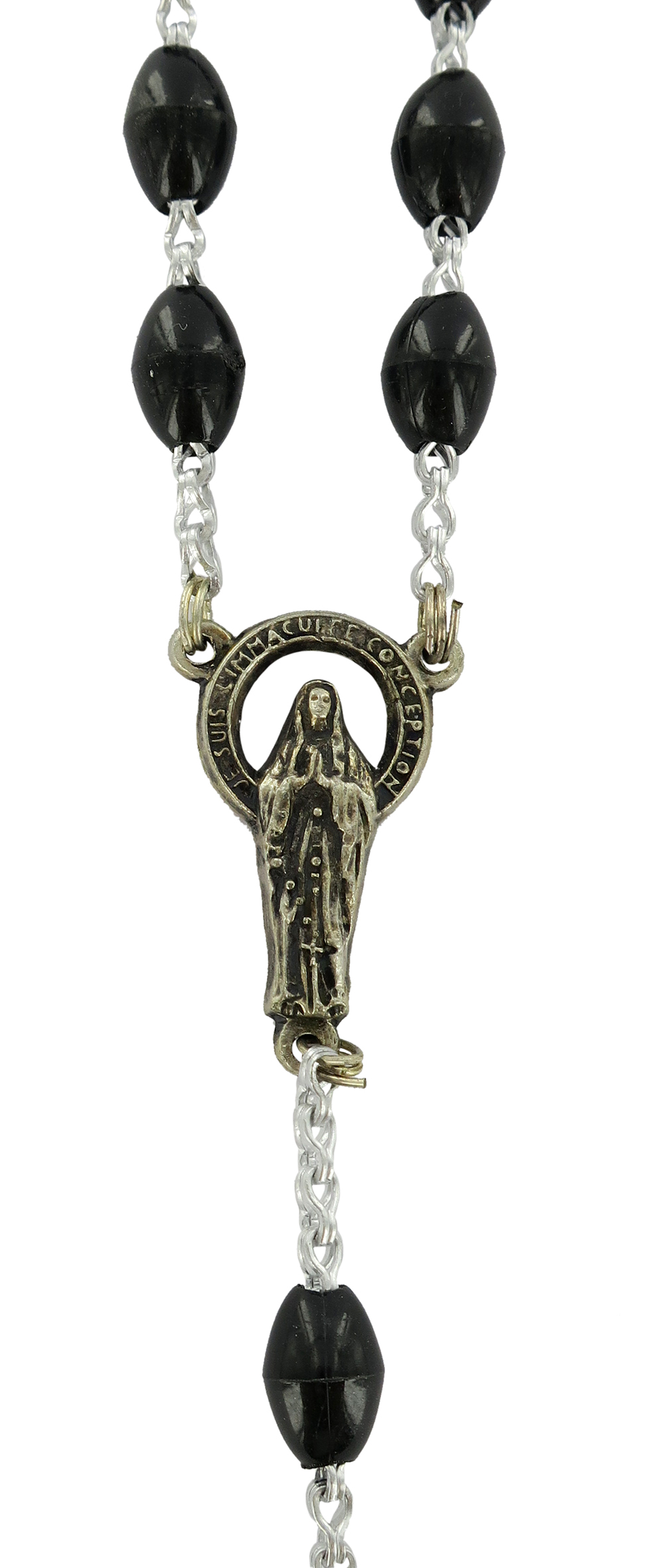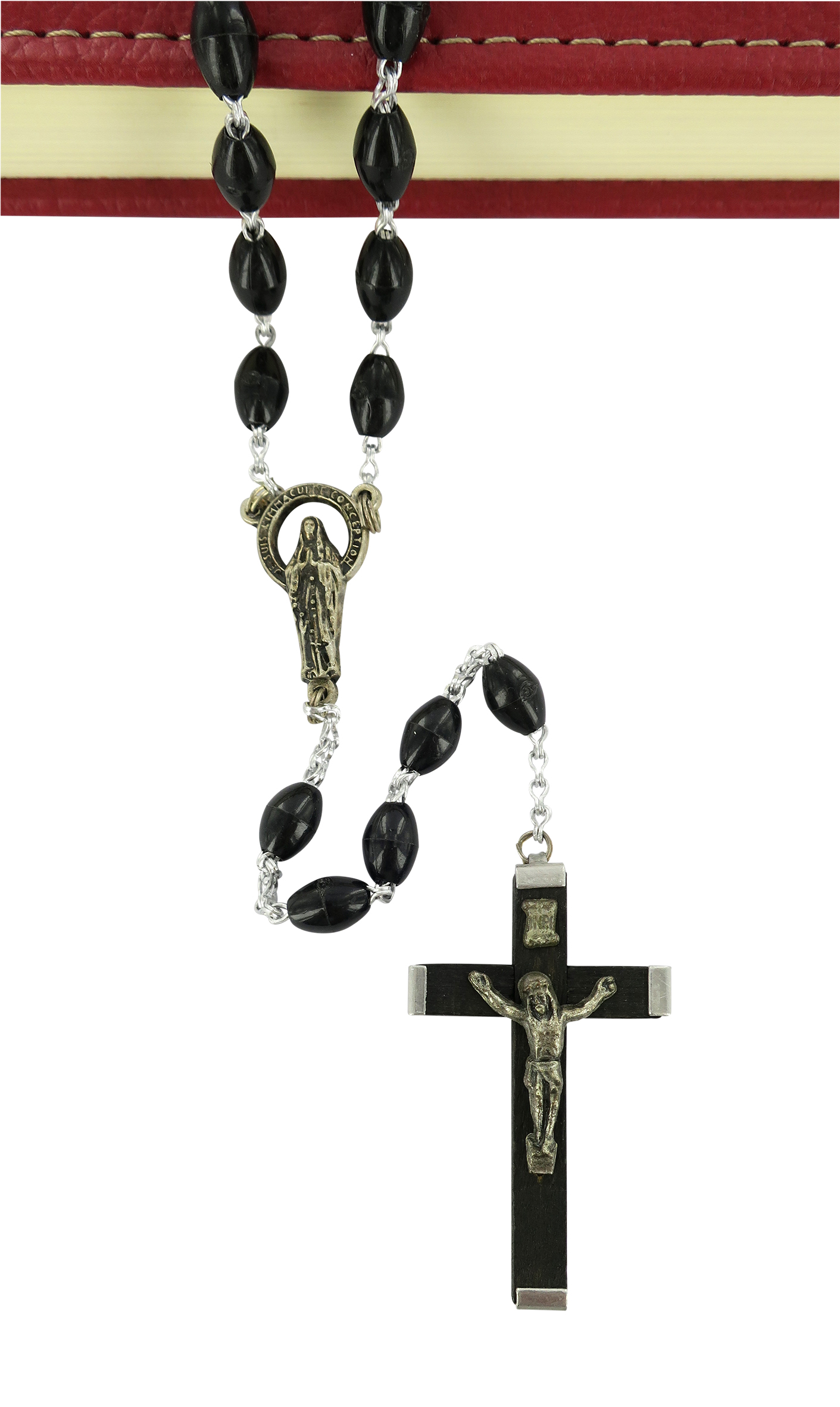 Rosario con legatura a macchina con grani ovali in plastica di colore nero. Sulla Crociera è visibile l'immagine della Madonna di Lourdes. Il prodotto è completamente realizzato in Italia. Il Santo Rosario è stato l'oggetto delle più vigile attenzione e premurosa sollecitudine da parte di tutti i Pontefici, che hanno visto il Rosario come una preghiera contemplativa che è insieme di lode e di supplica, efficace nel promuovere la vita cristiana e l'impegno apostolico. Anche Paolo VI e Giovanni Paolo II più volte hanno rivolto ai cristiani un appello perchè fossero innalzate supplici preghiere alla Beata Vergine del Rosario, per implorare da Dio il bene supremo della pace e il risveglio della vita cristiana.