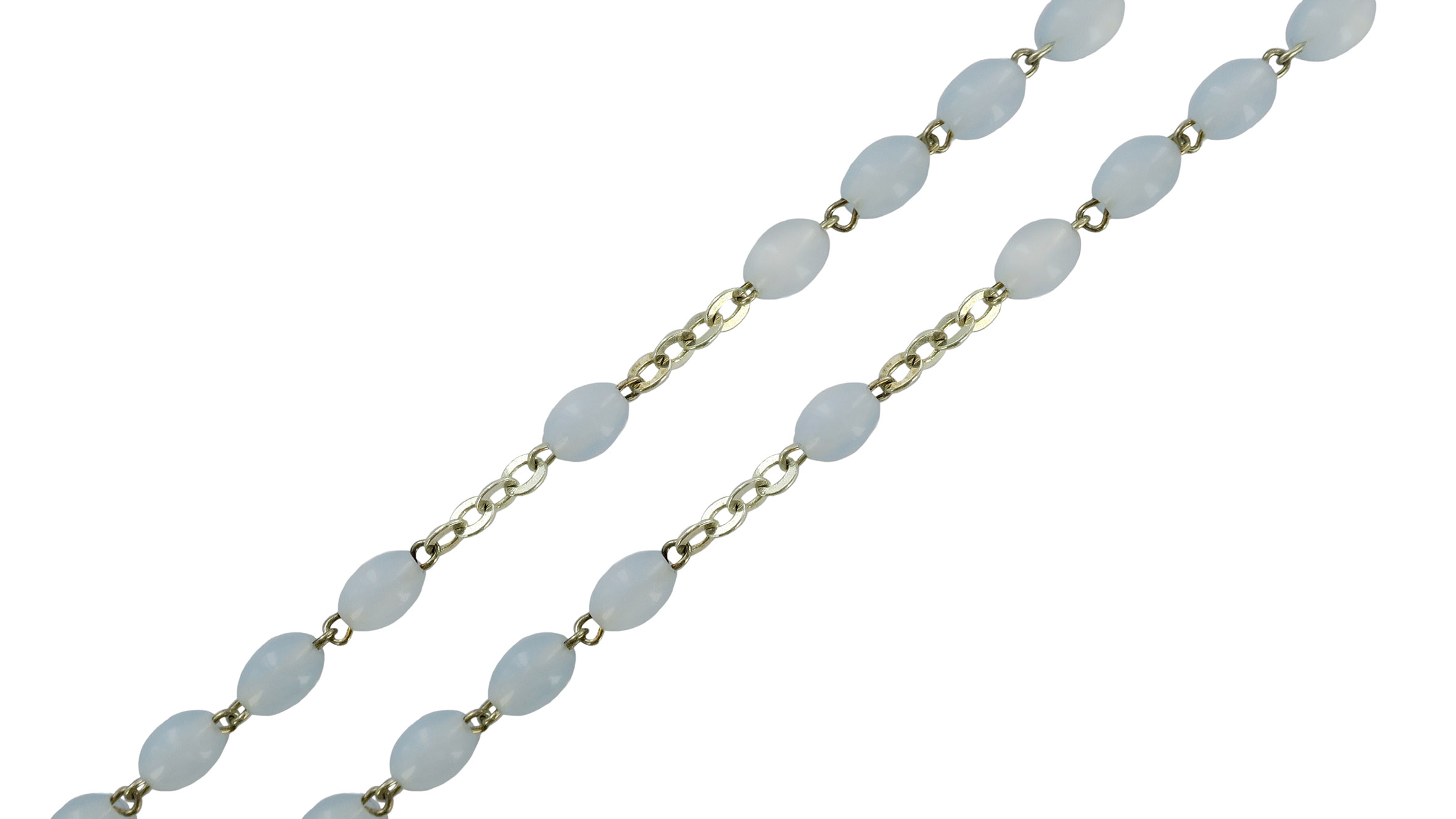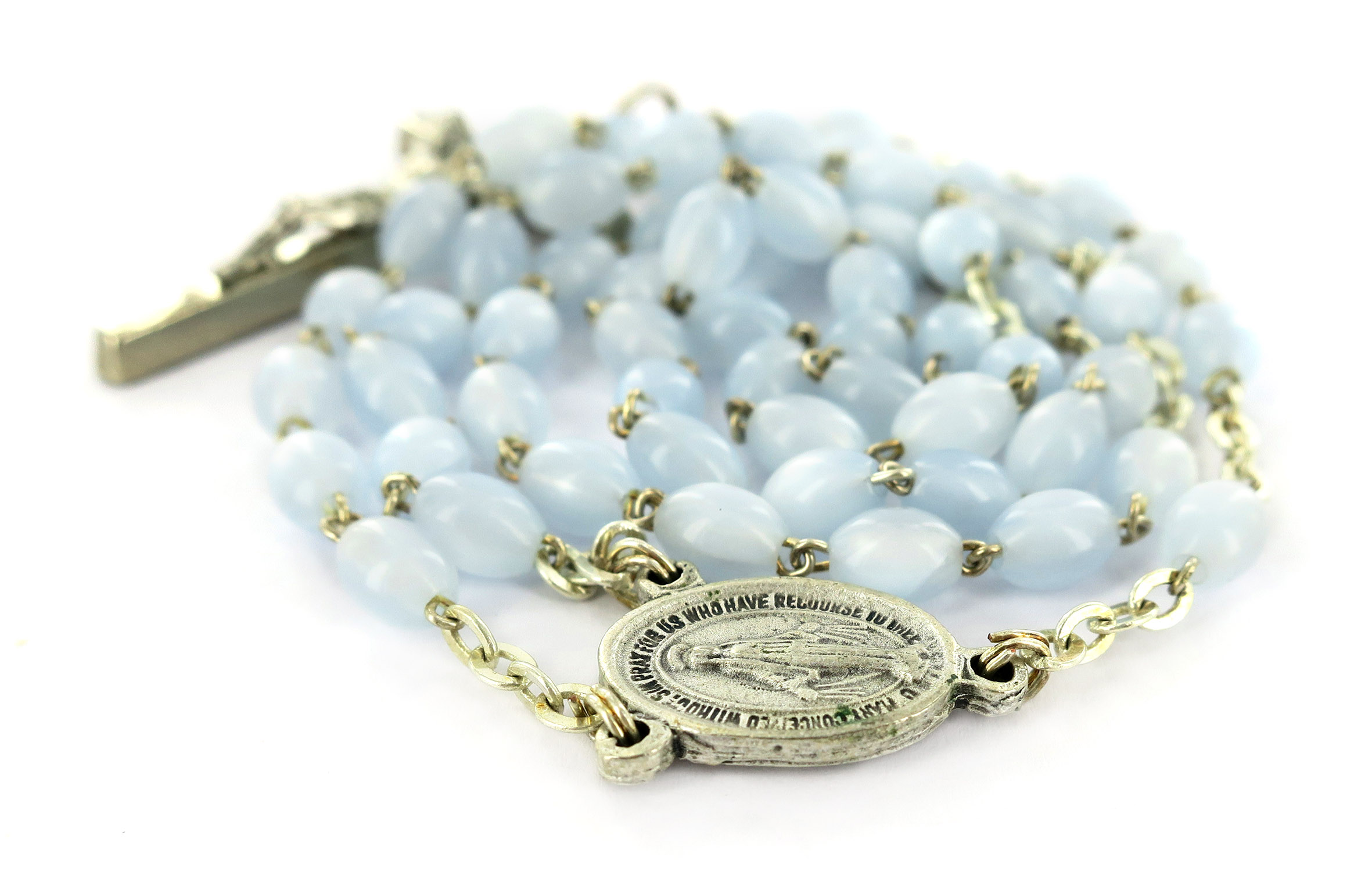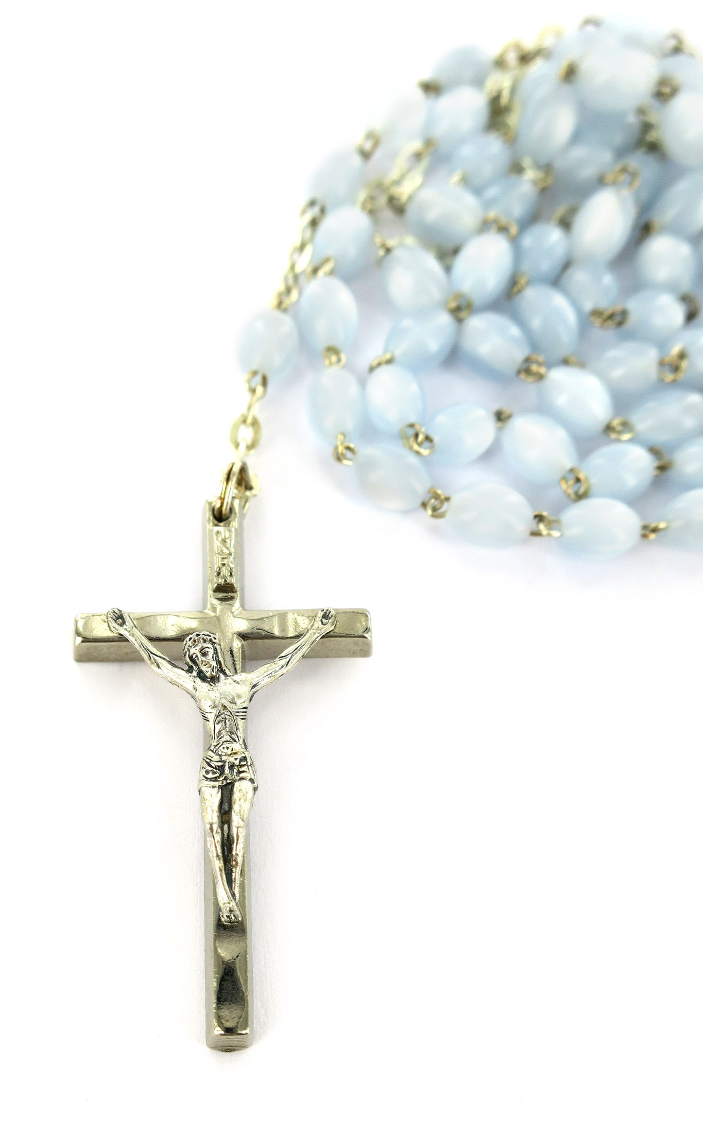 Rosario imitazione madreperla mm 4 legatura ottone argentato azzurro