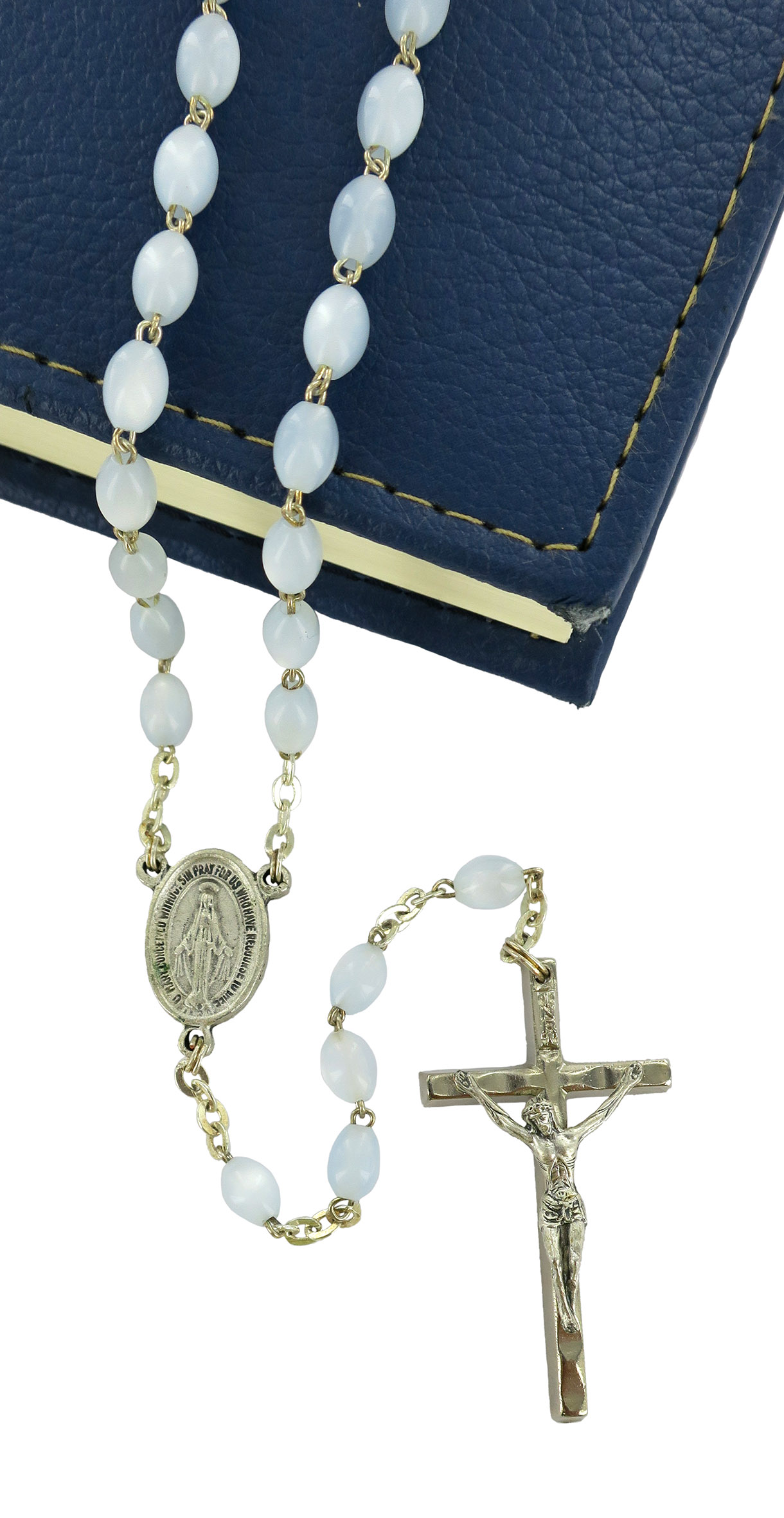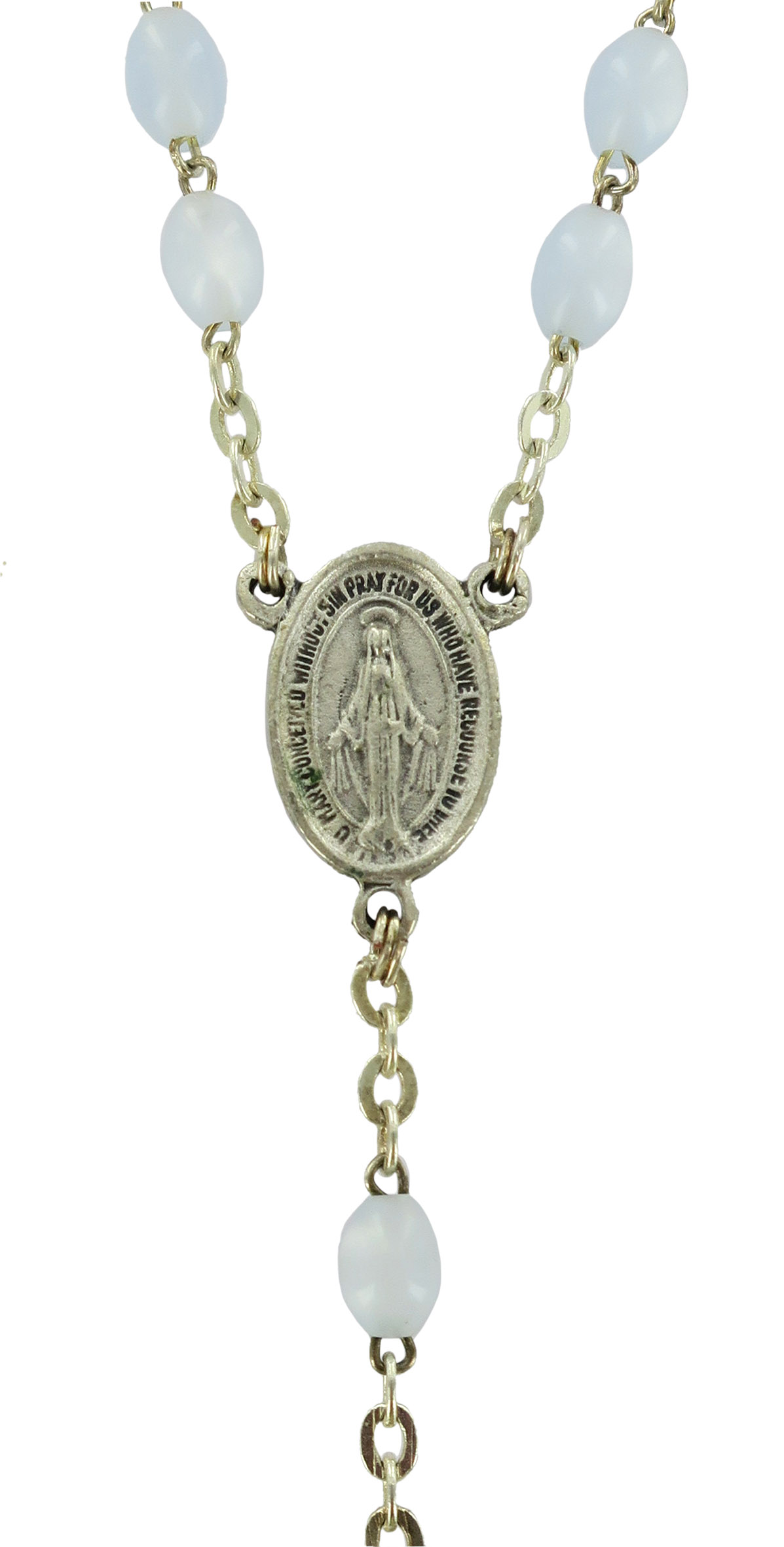 Rosario imitazione madreperla mm. 4 con legatura in ottone argentato - azzurro