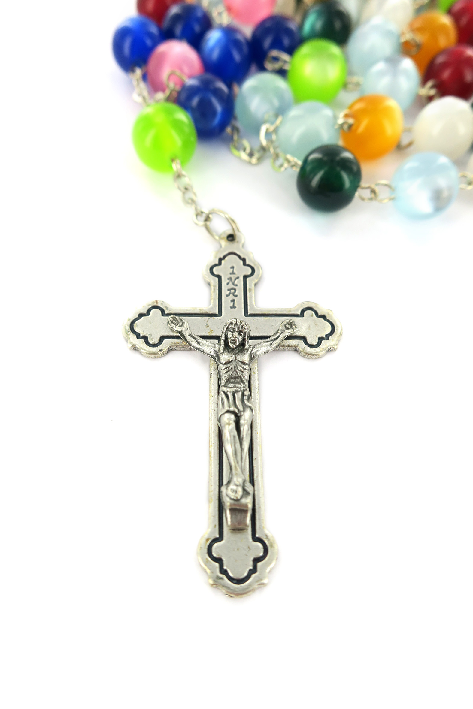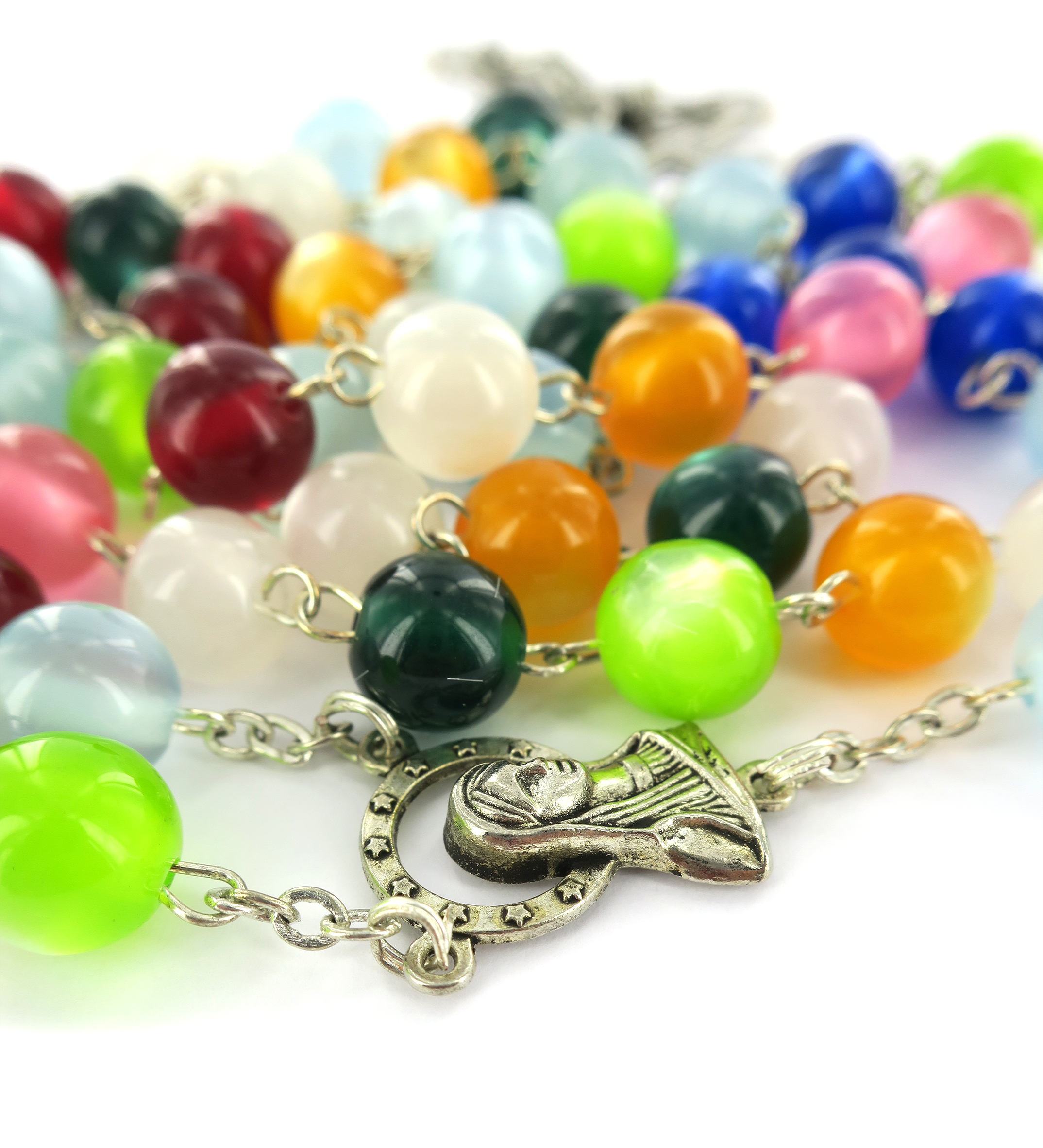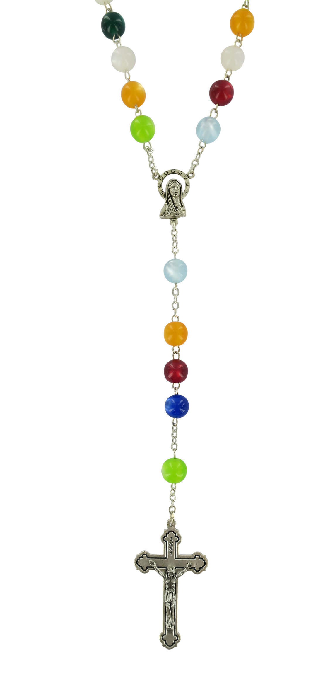 Rosario imitazione madreperla realizzato con grani tondi multicolori da mm 10 e rilegato in metallo argentato.