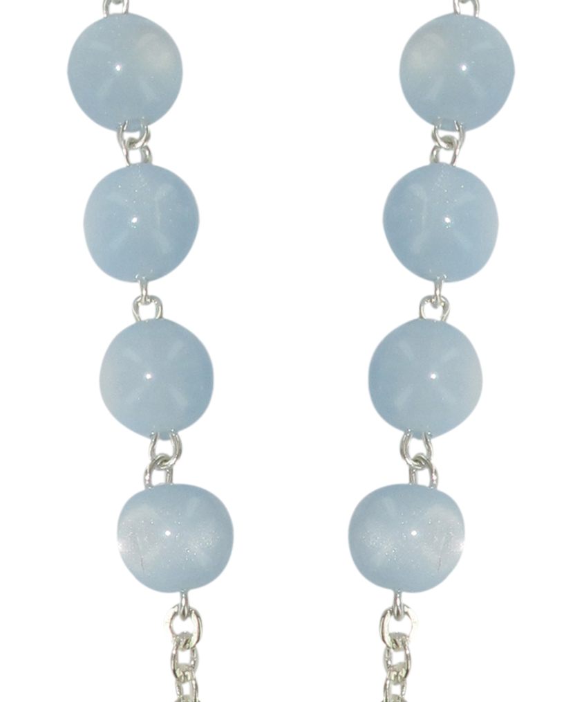 Rosario imitazione madreperla tondo diametro 7 azzurro mm con legatura a mano in ottone argentato