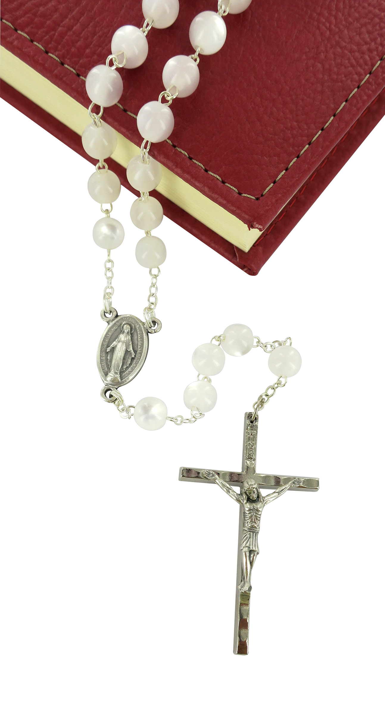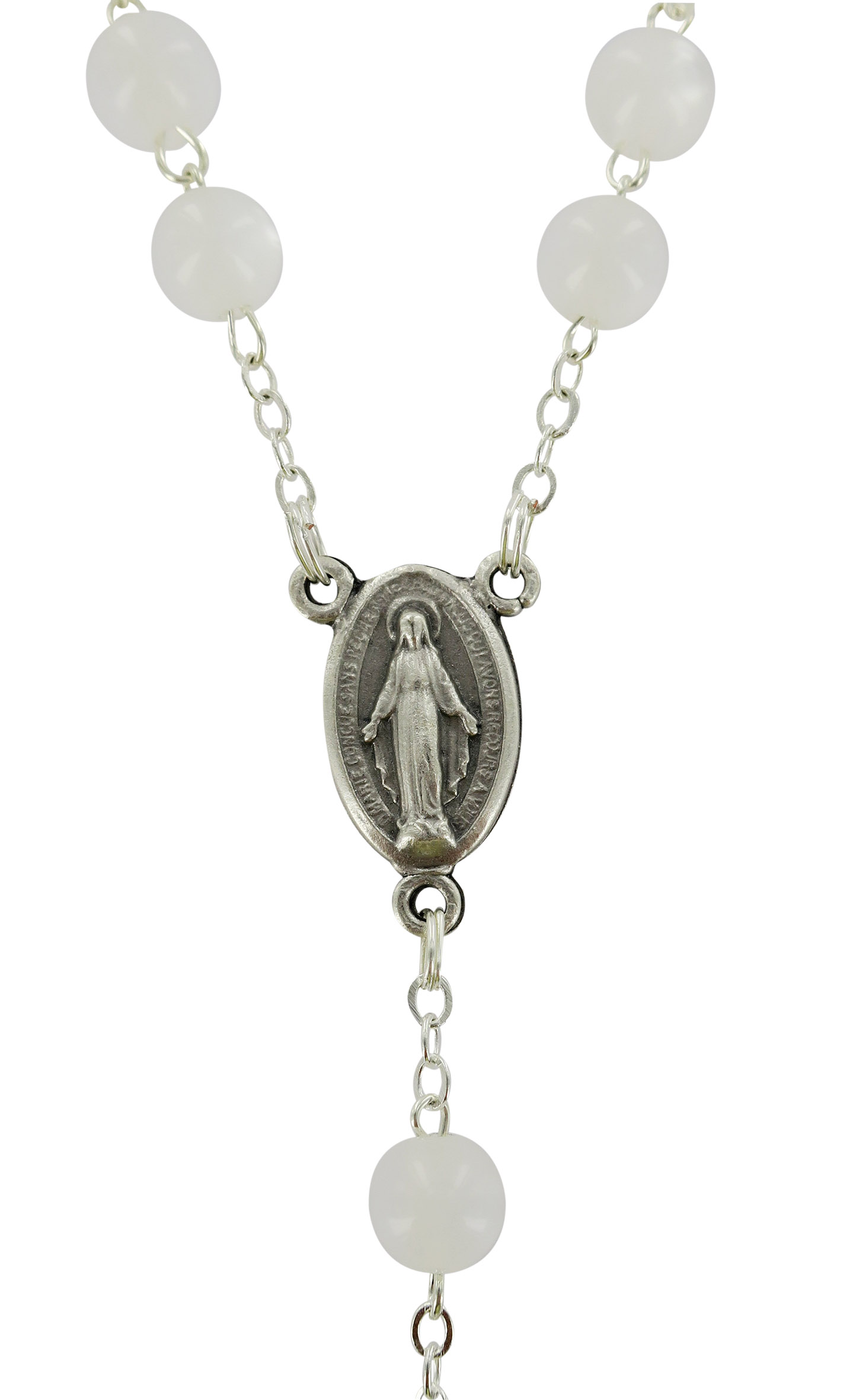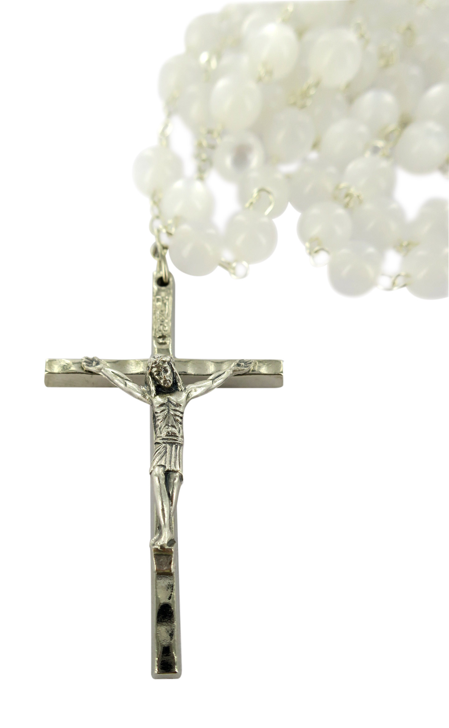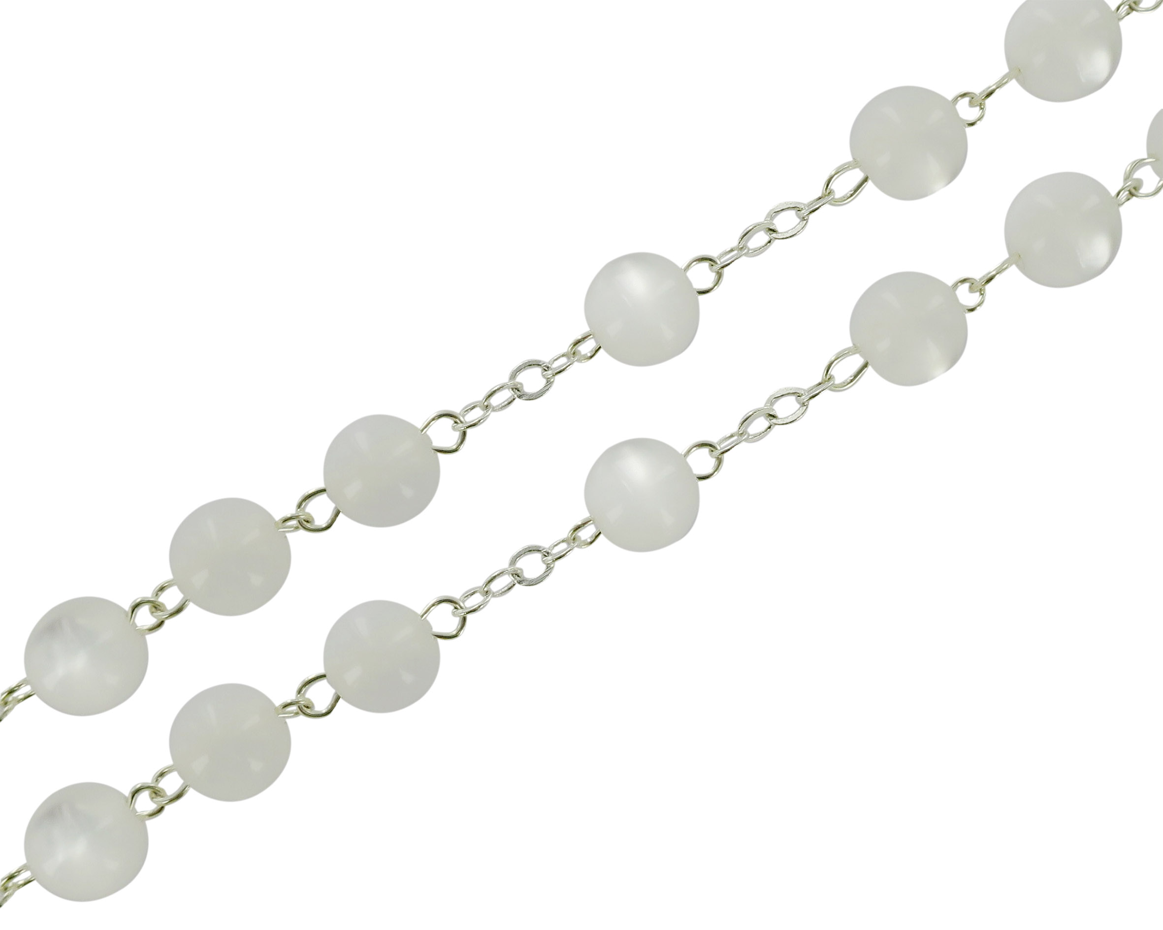 Rosario imitazione madreperla tondo diametro 7 mm bianco con legatura a mano in ottone argentato
