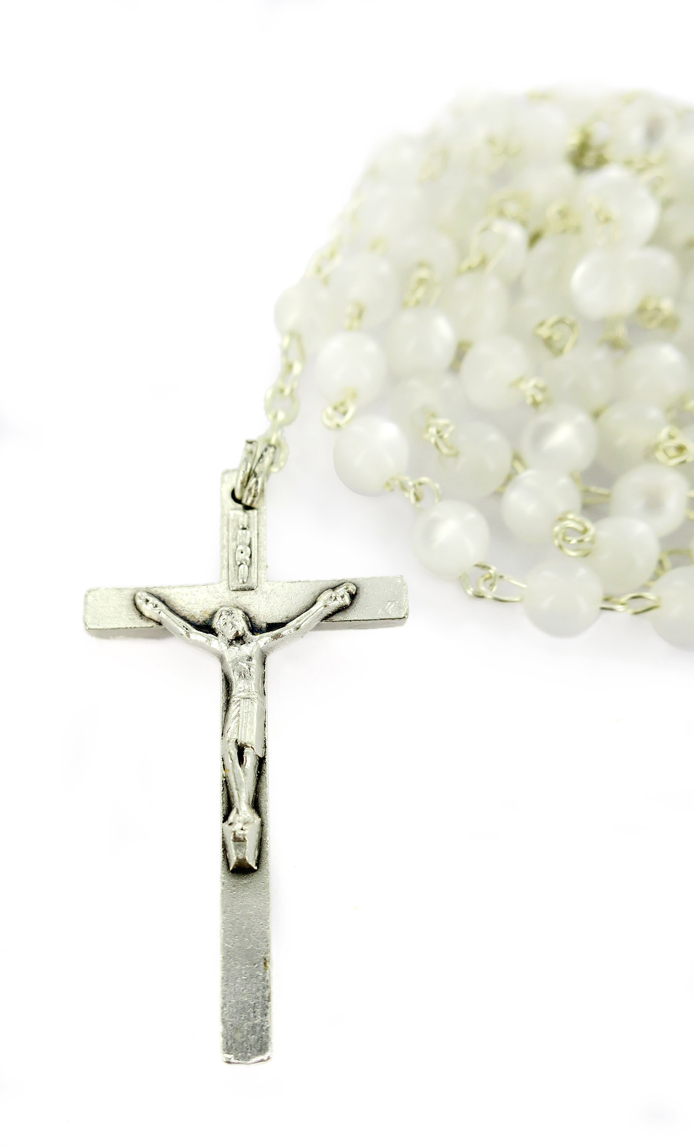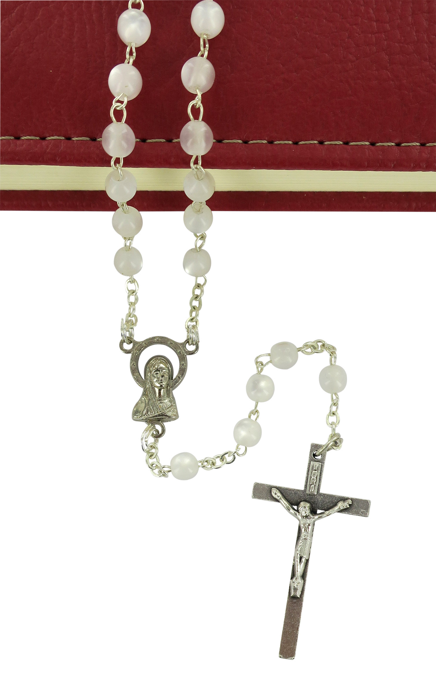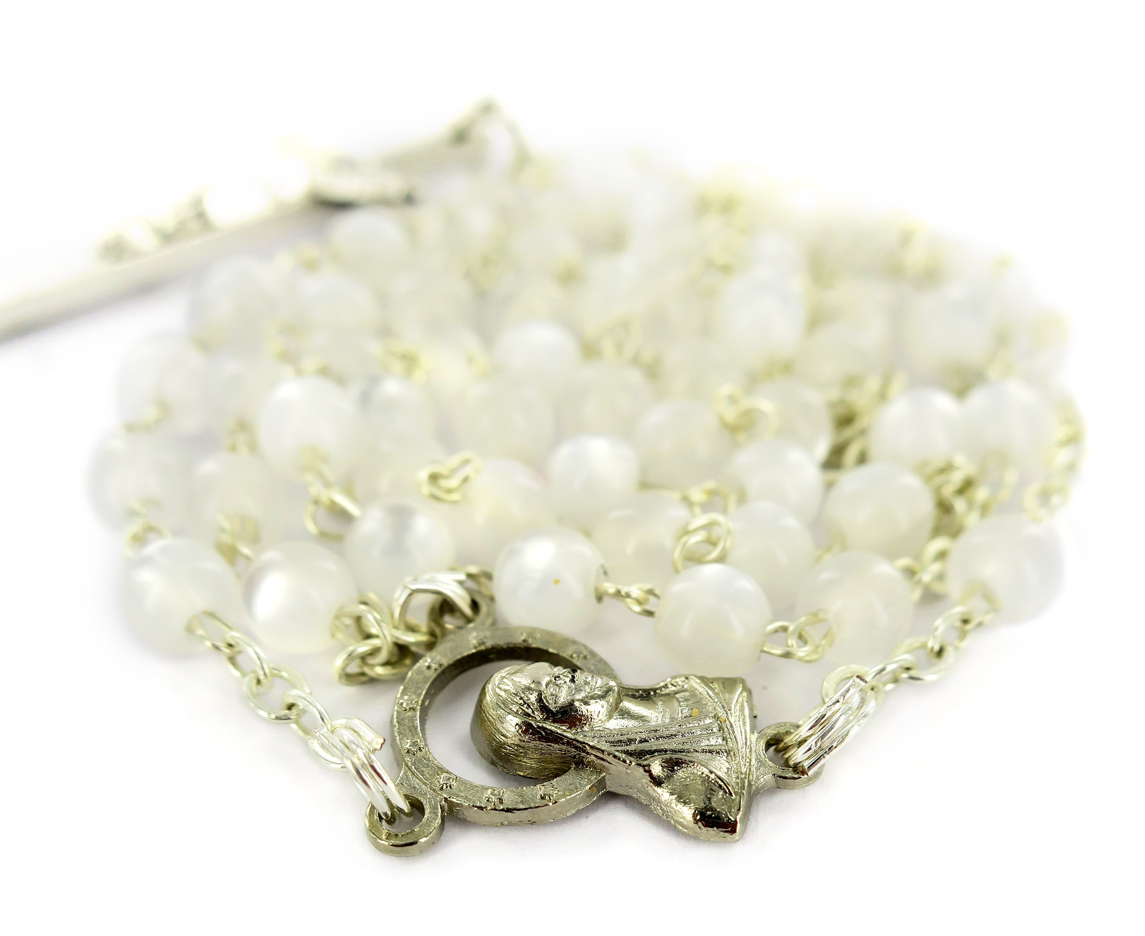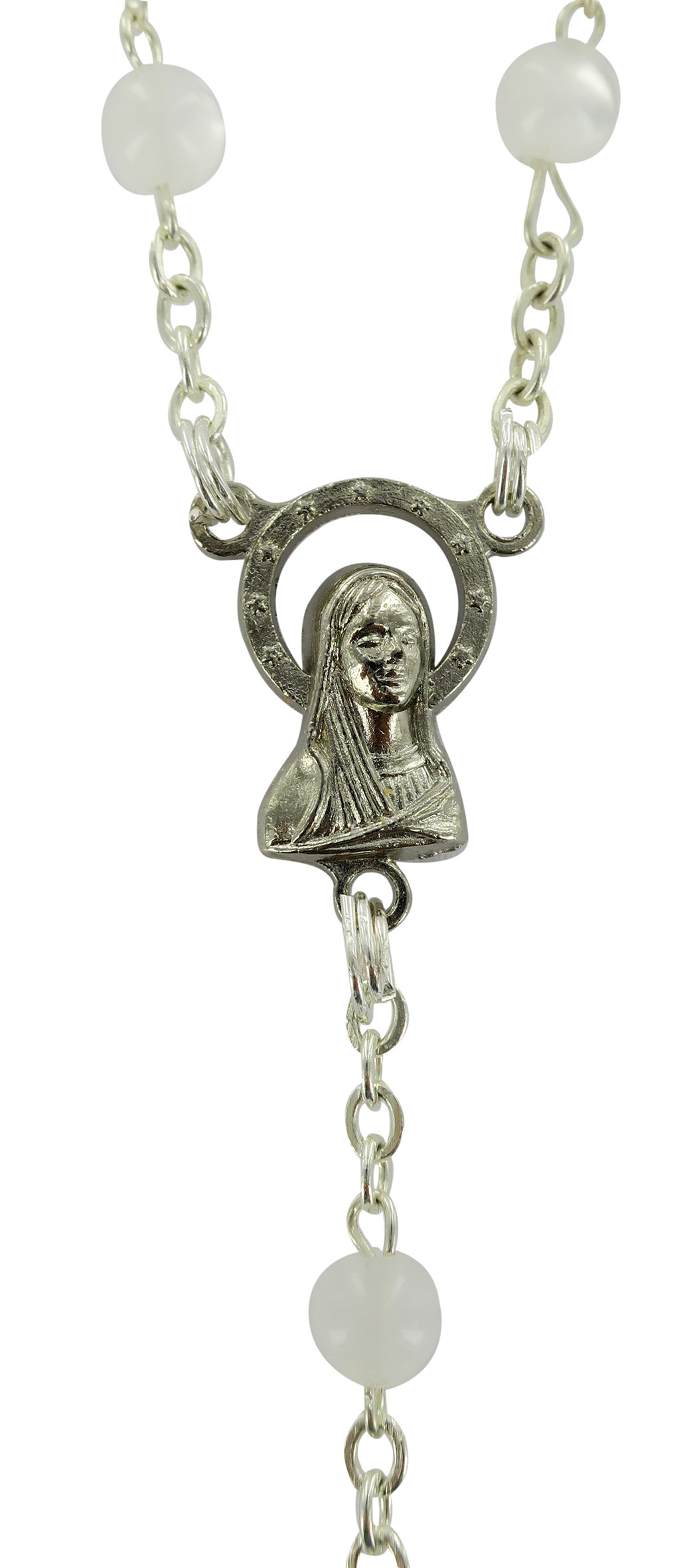 Rosario imitazione madreperla tondo mm. 4 con legatura in ottone argentato - bianco