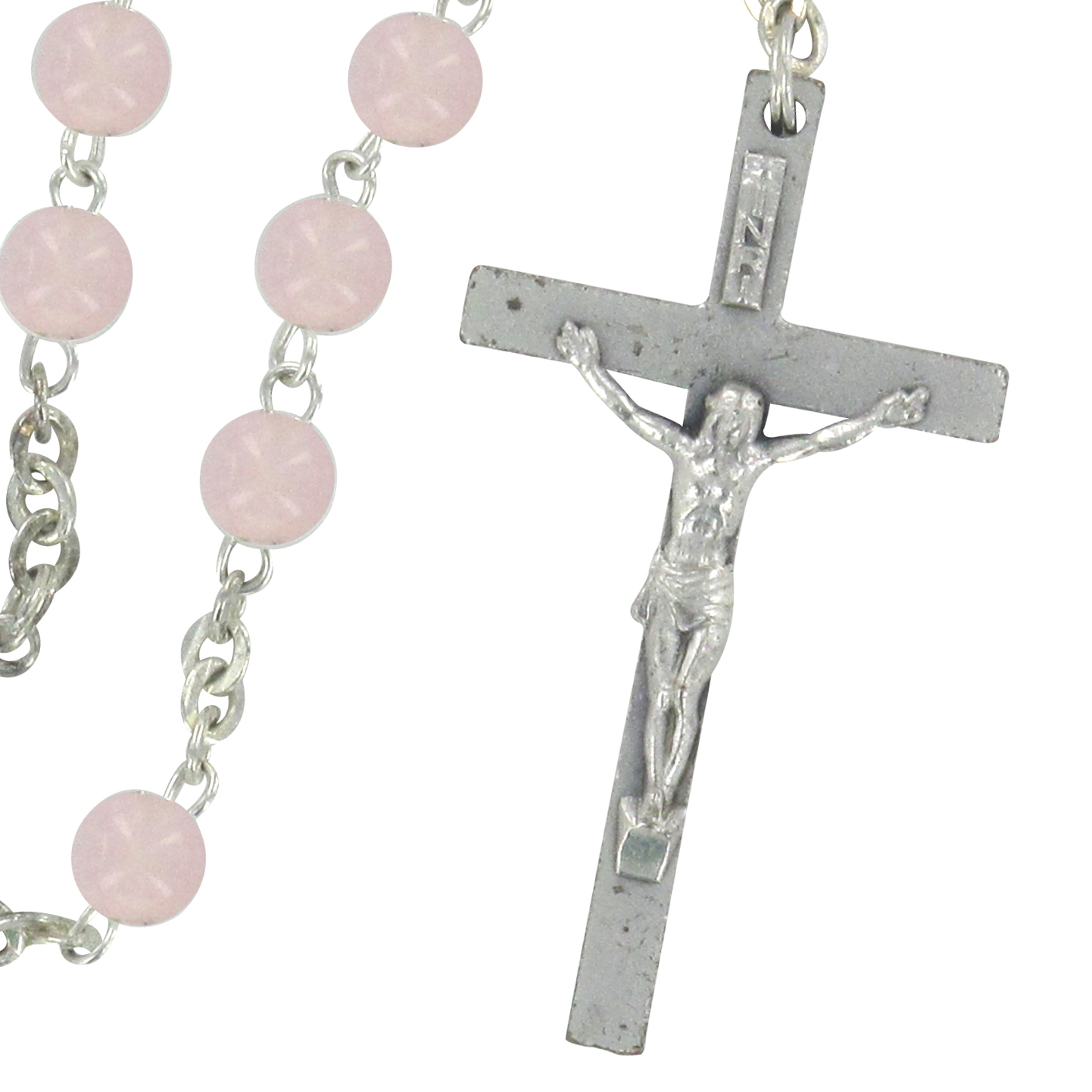 Rosario imitazione madreperla tondo mm. 4 con legatura in ottone argentato - rosa