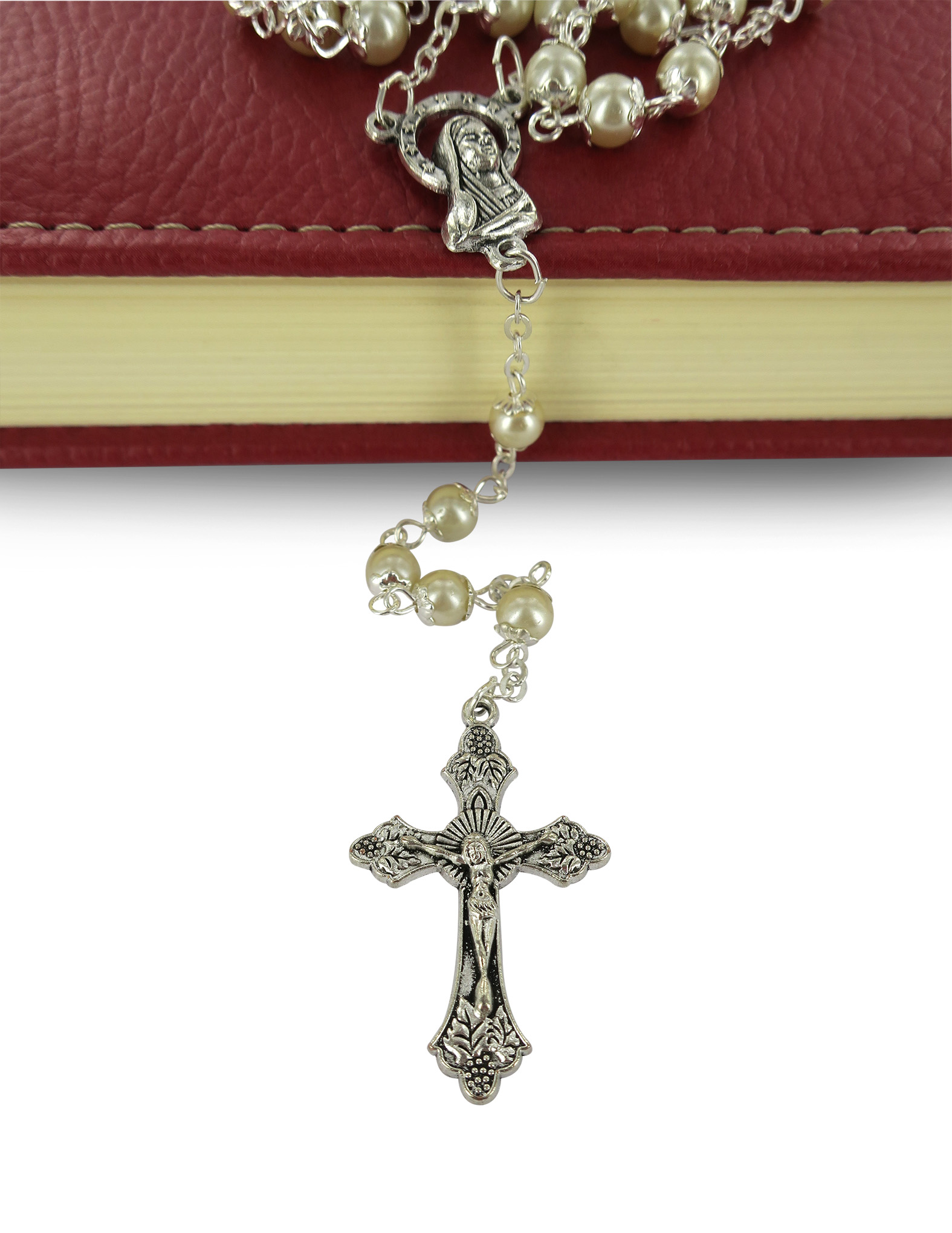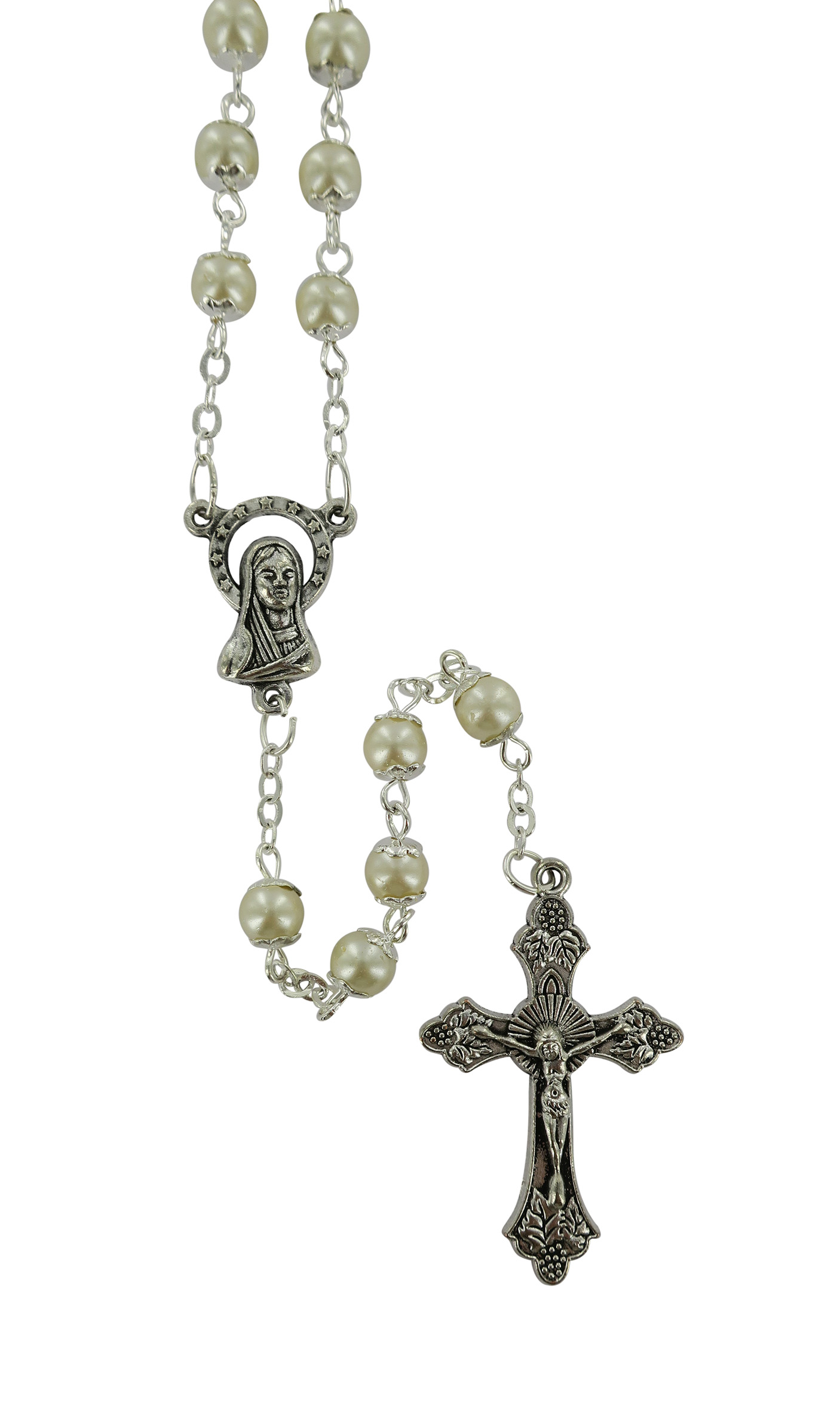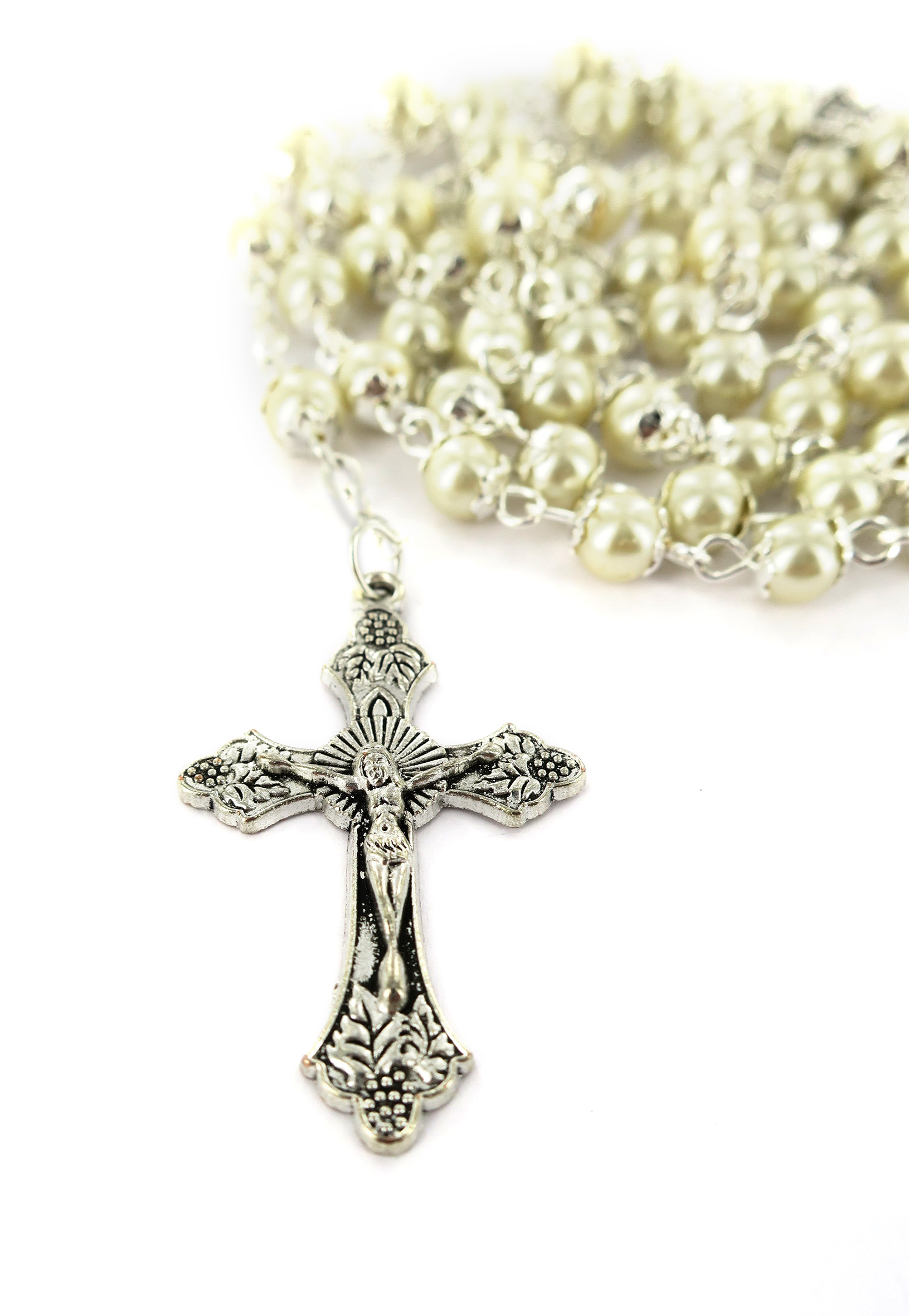 Rosario con grani tondi imitazione perla di colore bianco con coppiglie.I grani del rosario sono di mm 5.