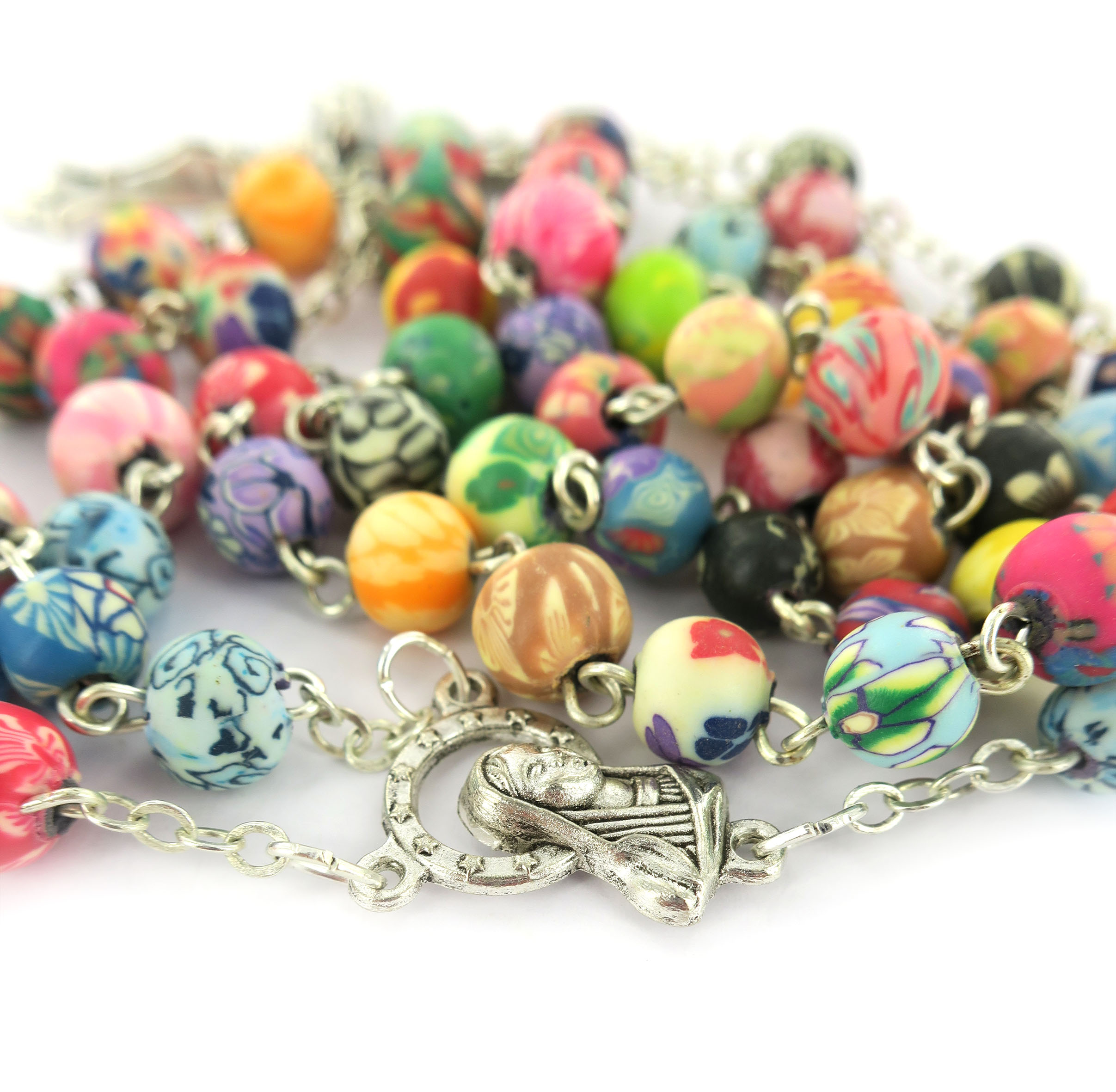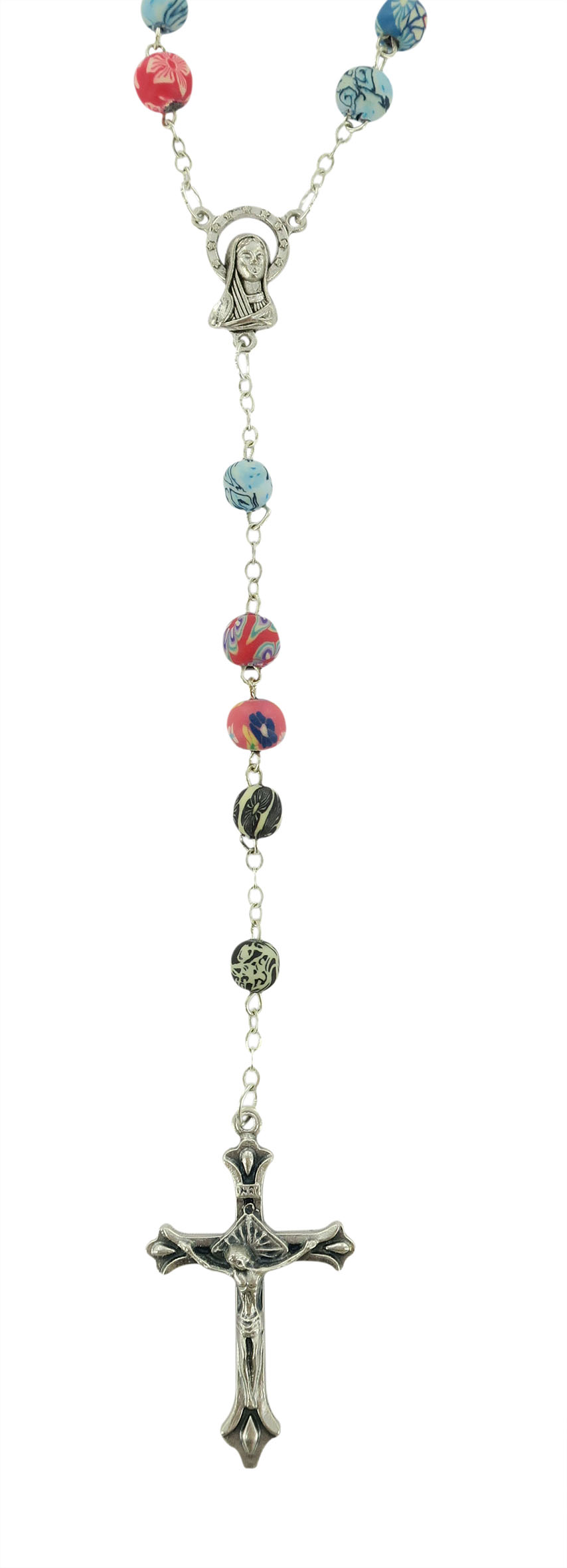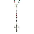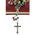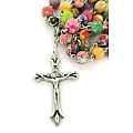 La particolarità di questo rosario è rappresentata dai grani tondi,di mm 8, in vetro satinato ognuno con colori e fantasie diverse.