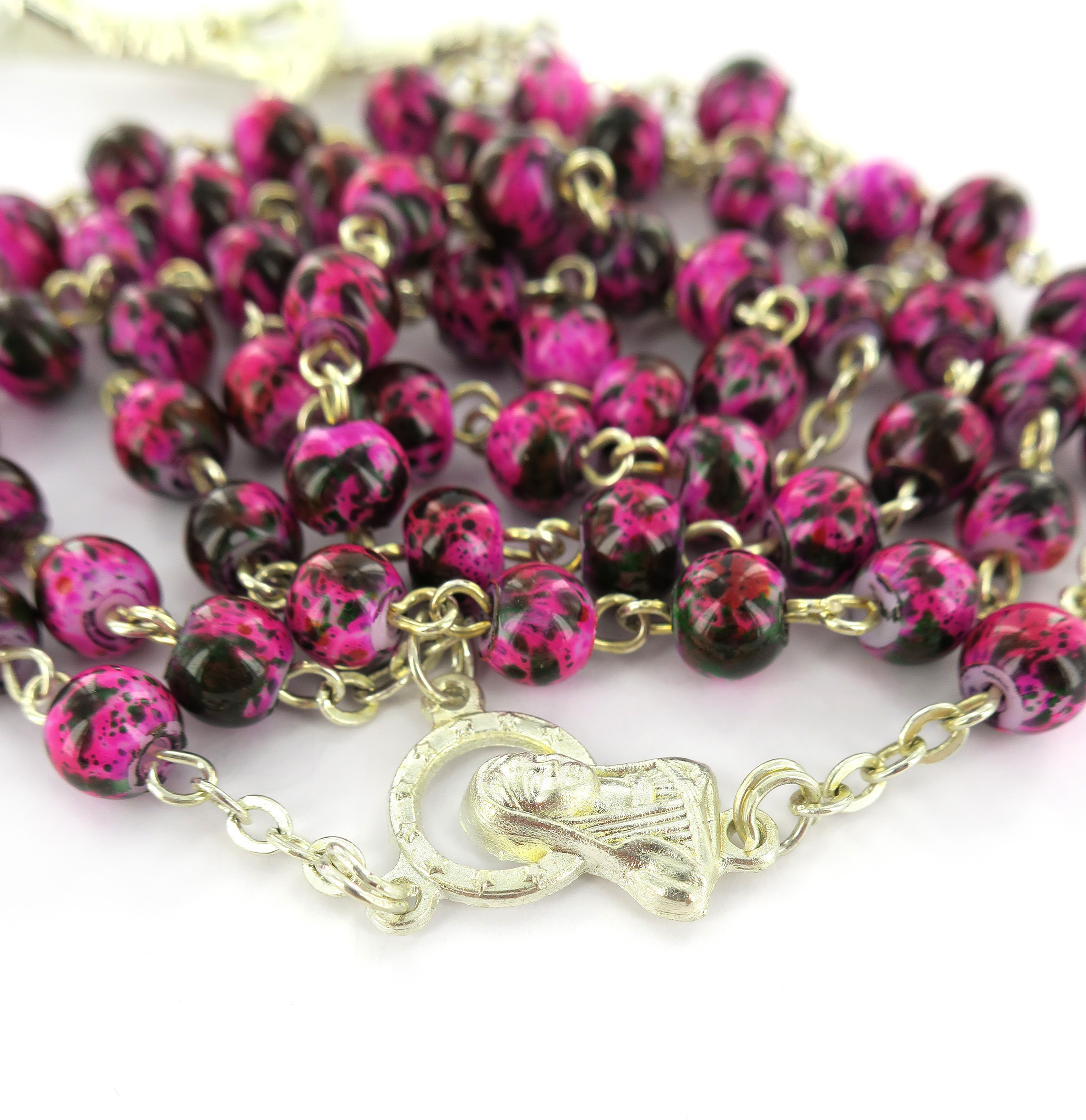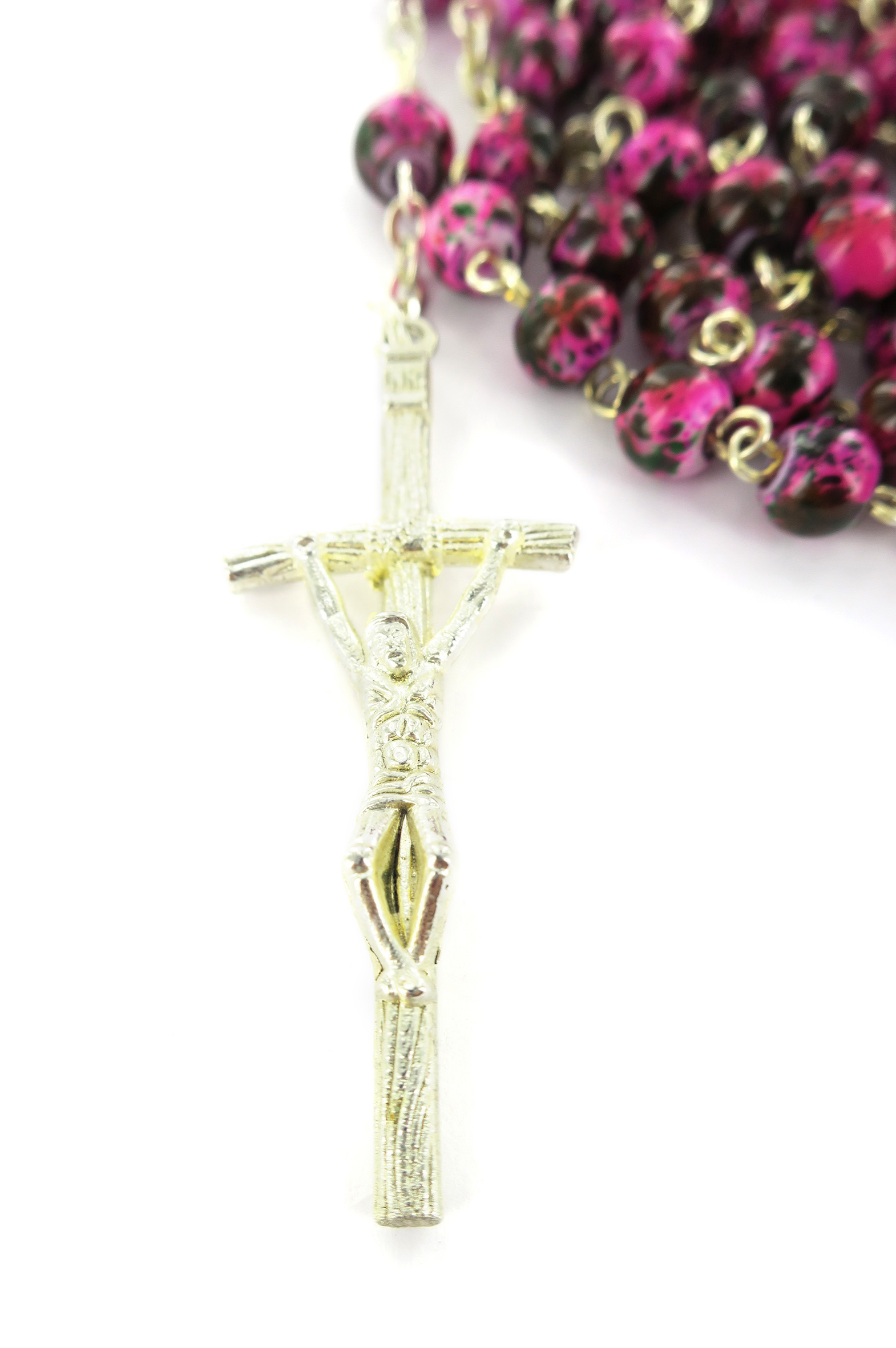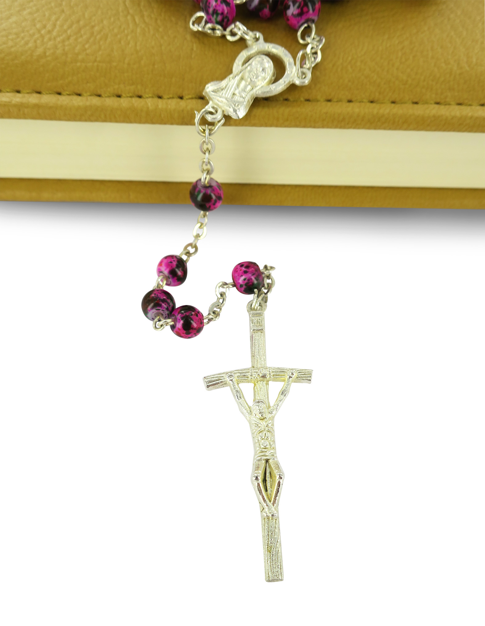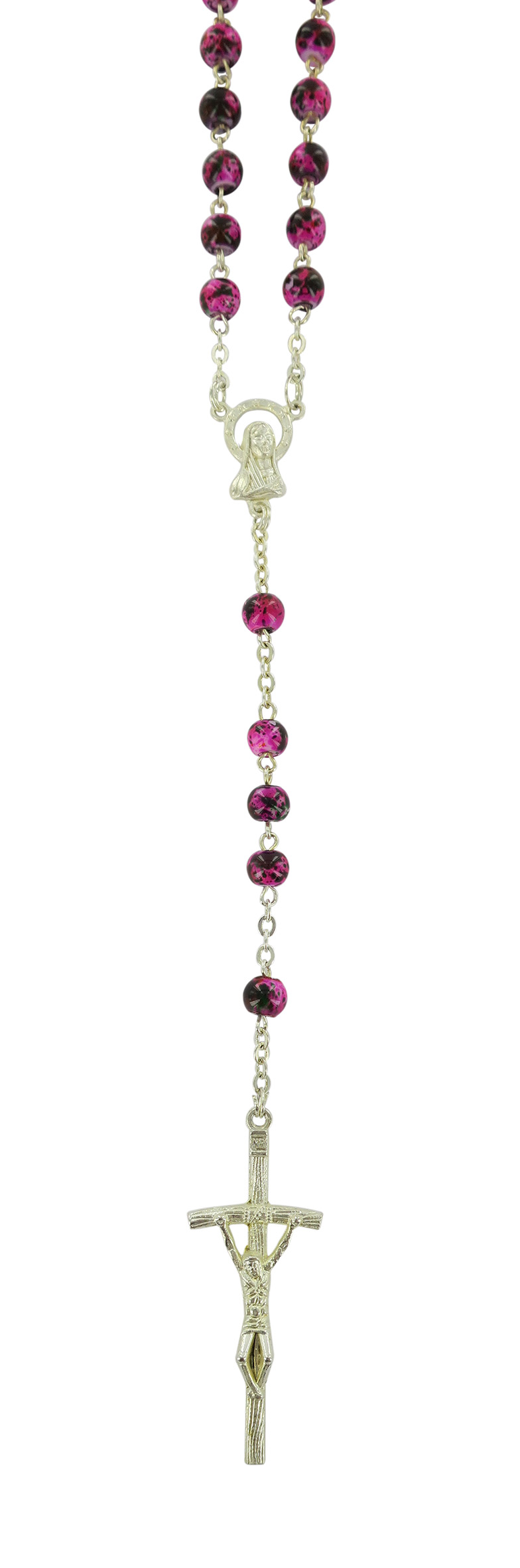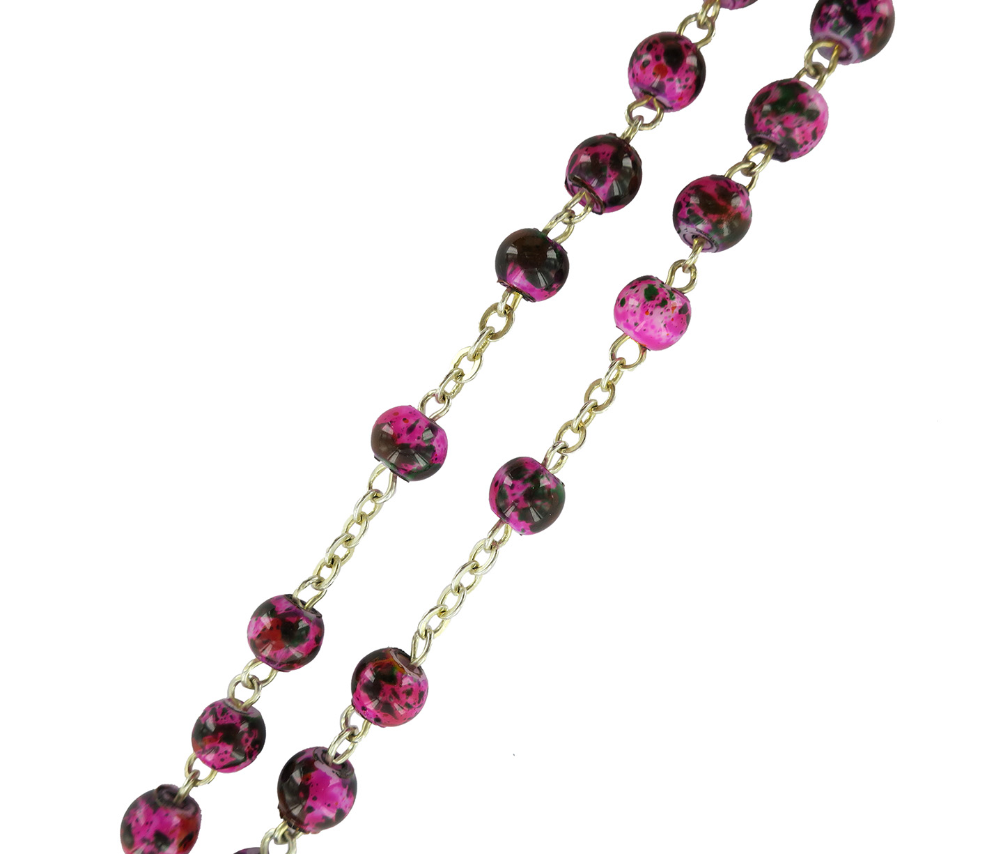 Rosario con grani tondi in vetro di colore fucsia il cui diametro è di 6 mm.