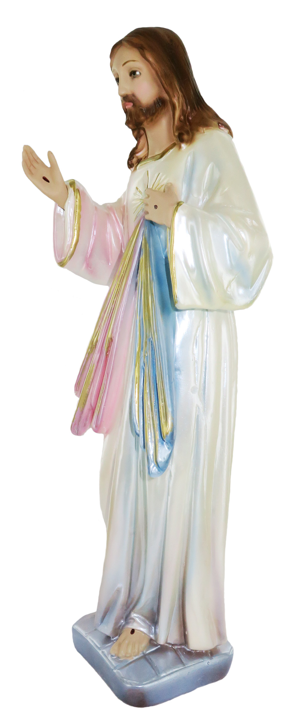 La statua, in gesso finemente dipinto a mano impreziosito da una rifinitura madreperlata, raffigura Gesù Misericordioso scalzo sopra a un piedistallo squadrato con una mano sul petto. Veste una tunica bianca sfumata di azzurro e rosa. Dal cuore si propagano dei raggi; sulle mani e sui piedi porta i segni della Crocifissione. Gli indumenti vantano un'attenzione particolare alla resa delle pieghe e delle delicate sfumature, che donano grande plasticità alla rappresentazione.