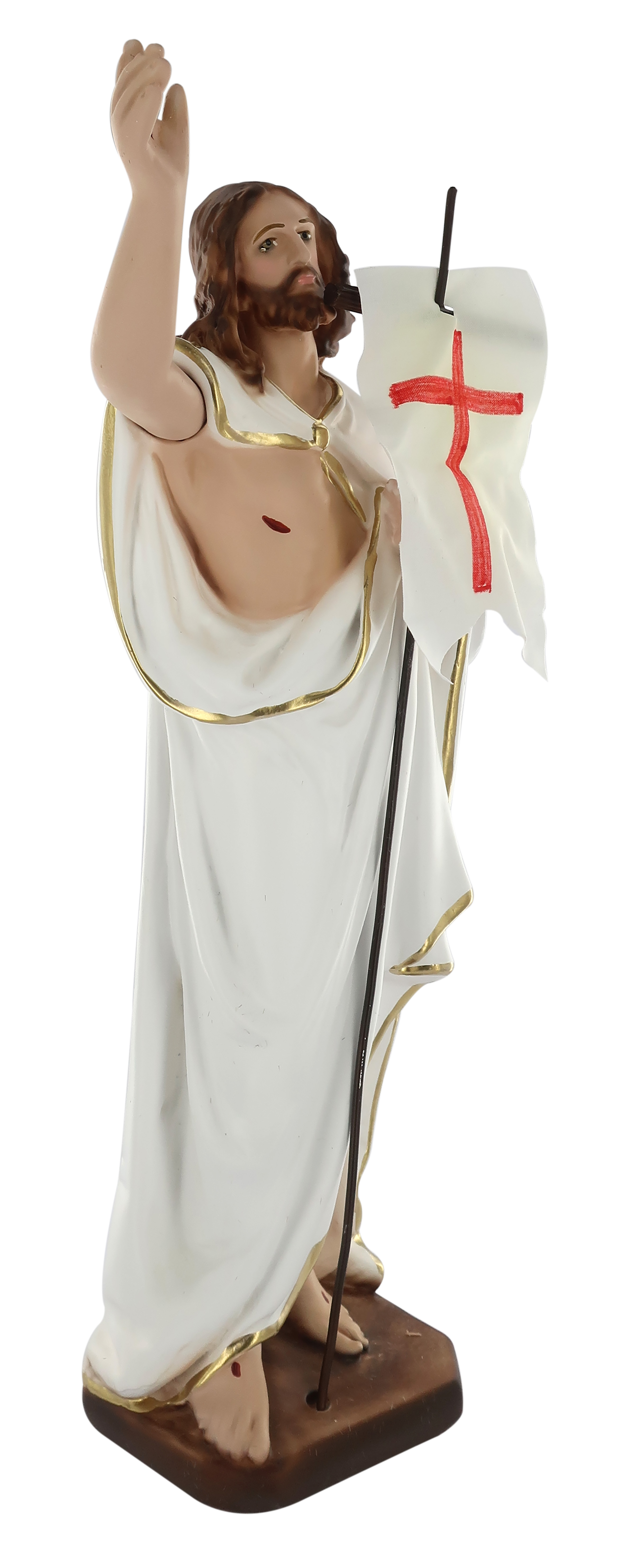 La statua, in gesso finemente dipinto a mano, è dedicata a Gesù Cristo Risorto. Su un piedistallo marrone, come vuole l'iconografia, il Salvatore veste una tunica bianchissima, porta i segni della crocifissione alle mani e ai piedi, ha una mano rivolta verso l'alto e regge nell'altra il caratteristico vessillo crociato in segno di vittoria contro la morte.