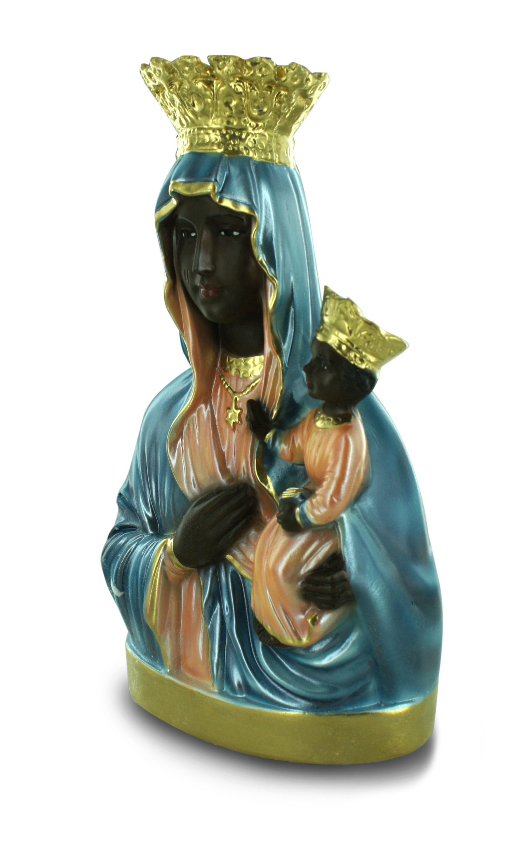 La statua, in gesso finemente dipinto a mano e impreziosito da una rifinitura madreperlata, raffigura la Madonna Nera di Czestochowa, rappresentazione tratta da un dipinto della Vergine custodito nel santuario di Jasna Gòra, vicino alla cittadina polacca di Czestochowa. Il dipinto si dice che sia stato realizzato da S. Luca utilizzando del legno originariamente appartenuto e utilizzato dalla Sacra Famiglia. Il soggetto principale, che poggia su un piedistallo color oro tondeggiante, è qui ritratto a mezzobusto, con il Bambino in braccio. Le vesti, nei colori dell'azzurro e dell'arancio, sono ricche di pieghe. Entrambi i volti dei soggetti, di carnagione scura, sono ulteriormente accentuati dalla corona color oro che indossano.