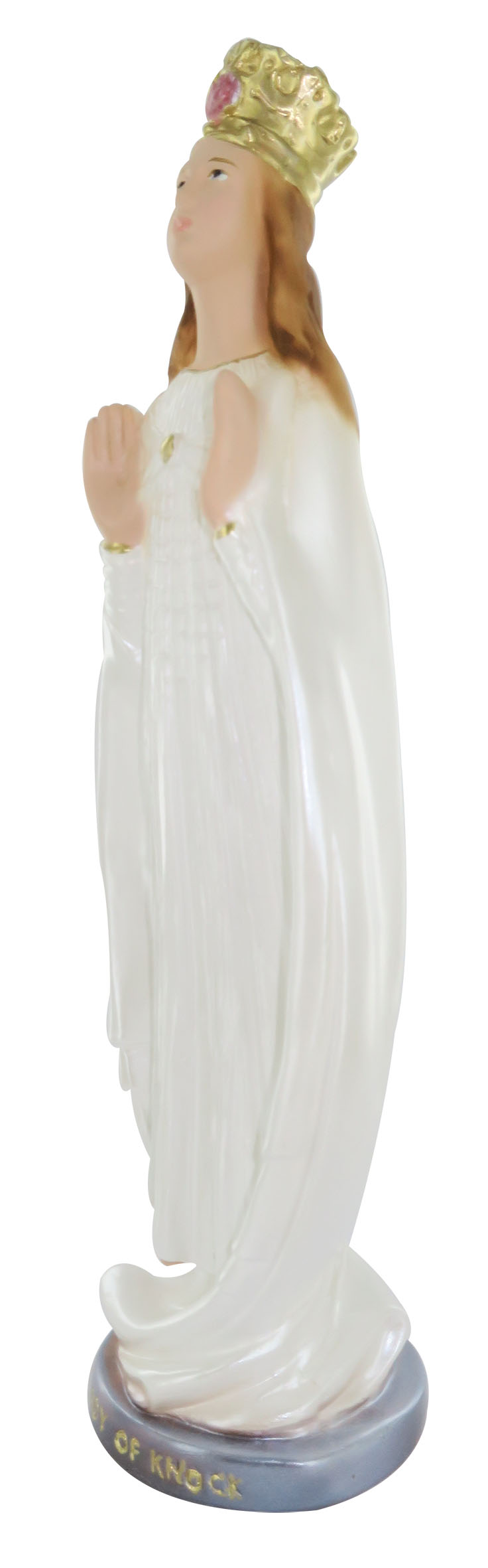 La statua, in gesso finemente dipinto a mano e impreziosito da una rifinitura madreperlata, raffigura la Madonna di Knock e celebra l'apparizione mariana avvenuta nell'agosto del 1879 nella località di Knock, in Irlanda, diventata la meta di pellegrinaggio cattolico principale dell'isola. Indossa una veste bianchissima molto semplice e ricca di pieghe, impreziosita da dettagli in color oro e una corona. Secondo il racconto della testimone, Mary McLoughlin, la Madonna apparve insieme a S. Giuseppe e a S. Giovanni.