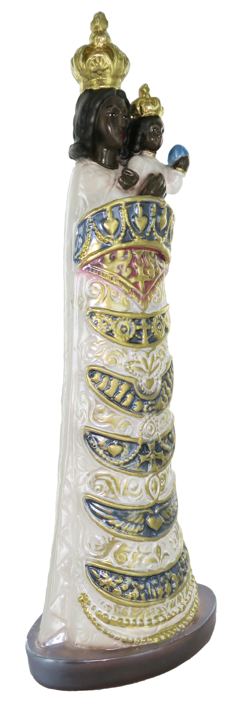 Resa nera dai fumi dei ceri e delle lampade ad olio, la "Virgo Lauretana" indossa la "dalmatica", una preziosa e decorata veste bianca solitamente portata dai diaconi. In questa rappresentazione, vanta una linea semplice con decori ed inserti elaborati di color oro, che spiccano sullo sfondo candido, catturando l'attenzione dell'osservatore. La donna è ritratta con il bambino in braccio, anch'egli dalla pelle scura.