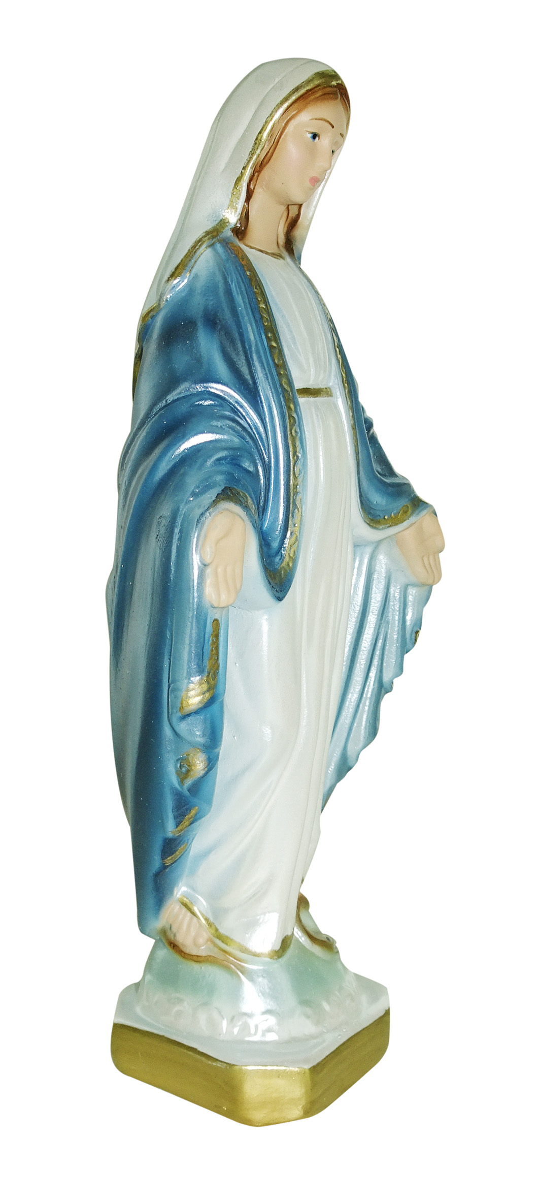 Questa statua della Madonna Miracolosa da circa 20 cm è realizzata artigianalmente in Italia e si distingue per la qualità della fattura e per il sapiente uso dei colori. L'effetto madreperlato rende le tinte molto lucenti e arricchisce la figura di suggestivi riflessi, donandole un aspetto elegante e pregevole. La statua della Madonna Miracolosa è ideale per nicchie o ambienti dedicati al culto, ma può anche essere esposta in casa come soprammobile o in una vetrinetta. La luce delle fiammelle dei lumini o dei faretti esalterà l'effetto iridescente della sua rifinitura madreperlacea.