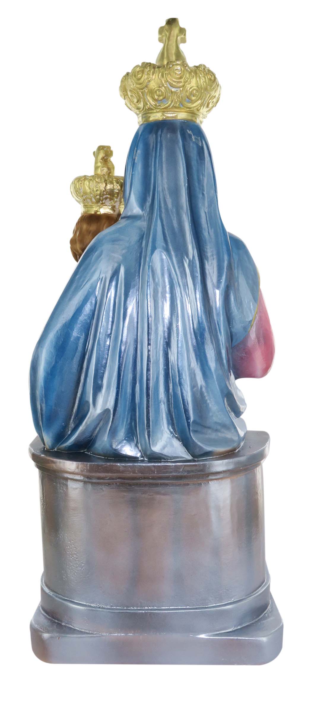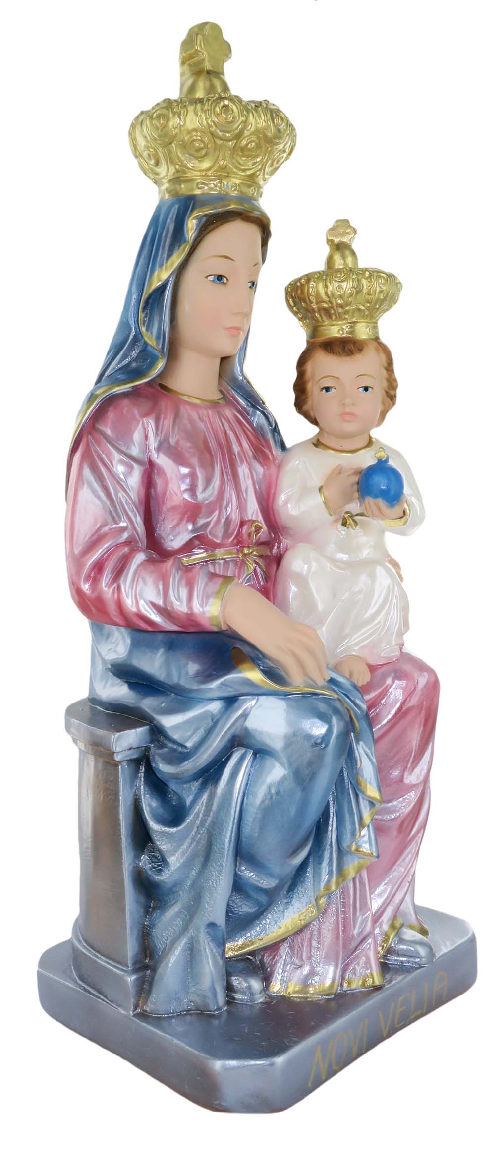 La statua, in gesso finemente dipinto a mano e impreziosita da una rifinitura madreperlata, raffigura la Madonna di Novi Velia, figura mariana del Santuario del Sacro Monte edificato nel 1323 sul Monte Gelbison, in provincia di Salerno. In questa rappresentazione, la Madonna divide la scena con il Bambino, da lei tenuto in braccio. La donna indossa una veste rosa e un lungo velo azzurro, mentre il Bambino una veste bianca, su cui spicca un globo crucigero azzurro. La solennità di entrambi i soggetti viene rappresentata dalle due grandi corone di color oro da loro indossate. La Madonna di Novi Velia apparve ad un gruppo di muratori, annunciando il suo desiderio di vedere la cappella che stavano costruendo dedicata agli angeli. I lavori, prima di quell'episodio, non vedevano grandi progressi, visto che quanto costruito di giorno veniva ritrovato distrutto la mattina successiva.