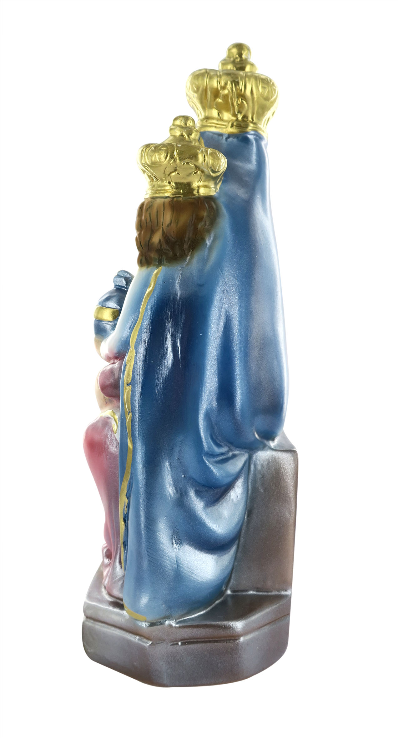 La statua, in gesso finemente dipinto a mano e impreziosita da una rifinitura madreperlata, raffigura la Madonna di Novi Velia, figura mariana del Santuario del Sacro Monte edificato nel 1323 sul Monte Gelbison, in provincia di Salerno. In questa rappresentazione, la Madonna divide la scena con il Bambino, da lei tenuto in braccio. La donna indossa una veste rosa coperta da un mantello azzurro, mentre Gesù Bambino spicca in una piccola veste bianca e un globo crucigero. La Madonna di Novi Velia apparve ad un gruppo di muratori, annunciando il suo desiderio di vedere la cappella che stavano costruendo dedicata agli angeli. I lavori, prima di quell'episodio, non vedevano grandi progressi, visto che quanto costruito di giorno veniva ritrovato distrutto la mattina successiva.