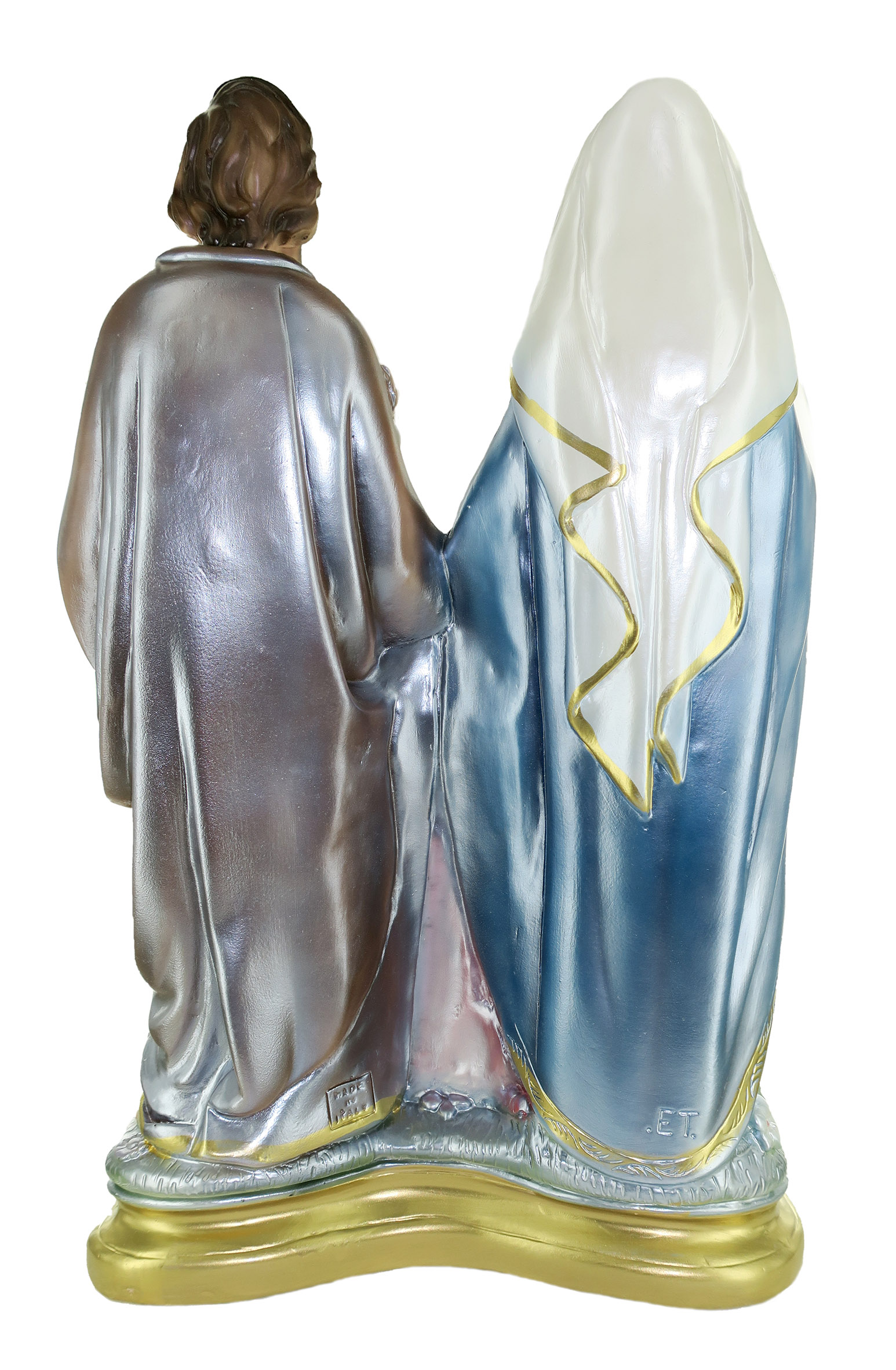 Questa statua della Sacra Famiglia da circa 40 cm è realizzata artigianalmente in Italia e si distingue per la qualità della fattura e per il sapiente uso dei colori, adeguatamente dosati. L'effetto madreperlato rende le tinte molto lucenti e arricchisce le figure di suggestivi riflessi, donando loro un aspetto elegante e pregevole. Adatta a nicchie e ambienti dedicati al culto, la statua della Sacra Famiglia sarà ancora più bella se illuminata dalla luce delle fiammelle dei lumini o dei faretti, che esalterà l'effetto iridescente della sua rifinitura madreperlacea.