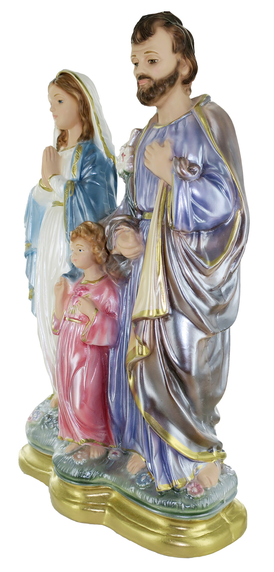 La statua, in gesso finemente dipinto a mano e impreziosito da una rifinitura madreperlata, raffigura la Sacra Famiglia. La rappresentazione include Giuseppe, Maria e il Bambino, in piedi l'uno vicino all'altro, su una base comune sagomata intorno alle tre figure. I bordi delle vesti dei soggetti e le loro cinte sono evidenziati da un tratto di color oro. Il Bambino, con la sua veste rosa e con mano benedicente, spicca tra i genitori in raccoglimento, chevestono di bianco, azzurro e viola. Nelle scritture, sono diversi gli episodi che vedono la Sacra Famiglia protagonista: basti pensare alla fuga in Egitto o al ritrovamento di Gesù al tempio.