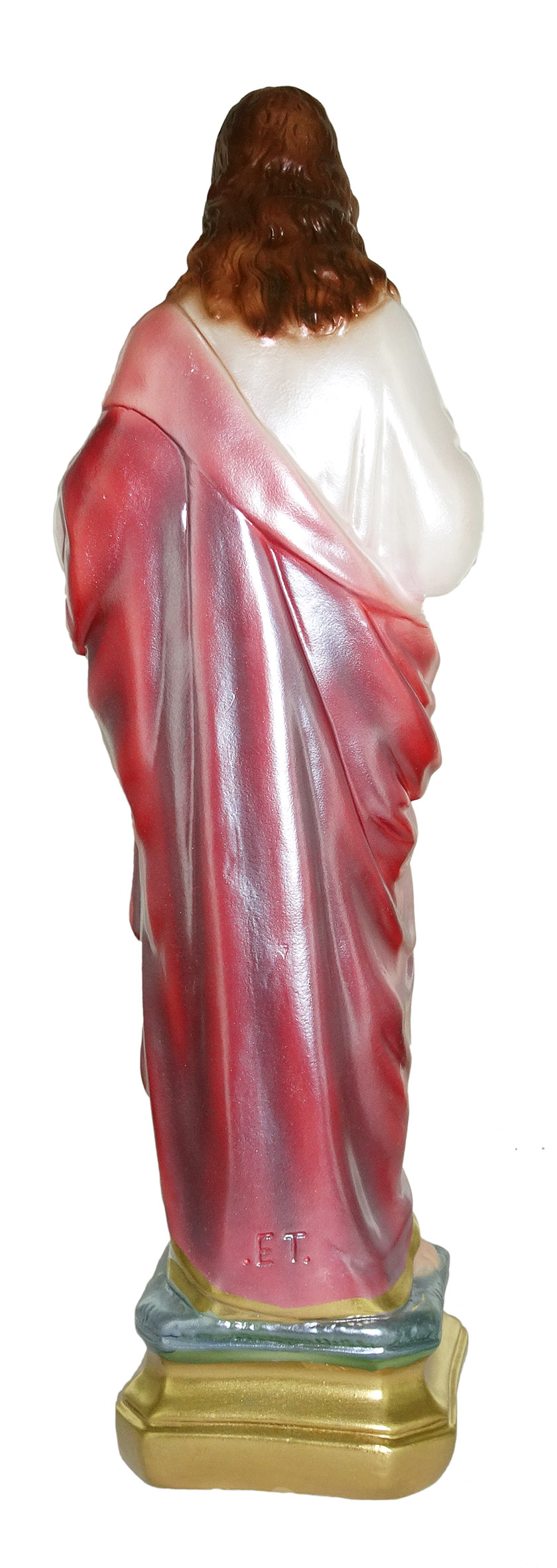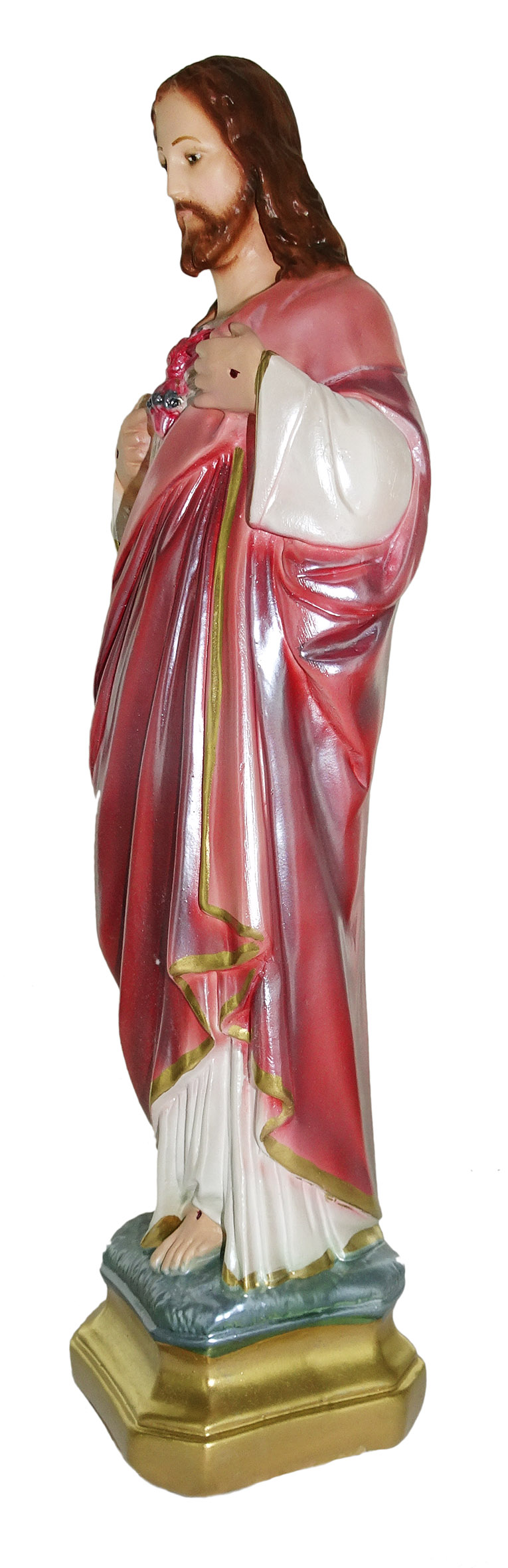 La statua, in gesso finemente dipinto a mano e impreziosito da una rifinitura madreperlata, raffigura il Sacro Cuore di Gesù, devozione molto cara ai cattolici. Cristo è su un piedistallo color oro e verde scuro; sulle mani e su un piede, porta il segno della Crocifissione. Rappresentato con la barba e i capelli lunghi, Gesù indossa una veste bianca coperta da un mantello rosso ricchissimo di pieghe. Sulla candida tunica spicca il cuore rosso con le fiamme, volte a simboleggiare l'ardore misericordioso che il Salvatore prova nei confronti dei peccatori.