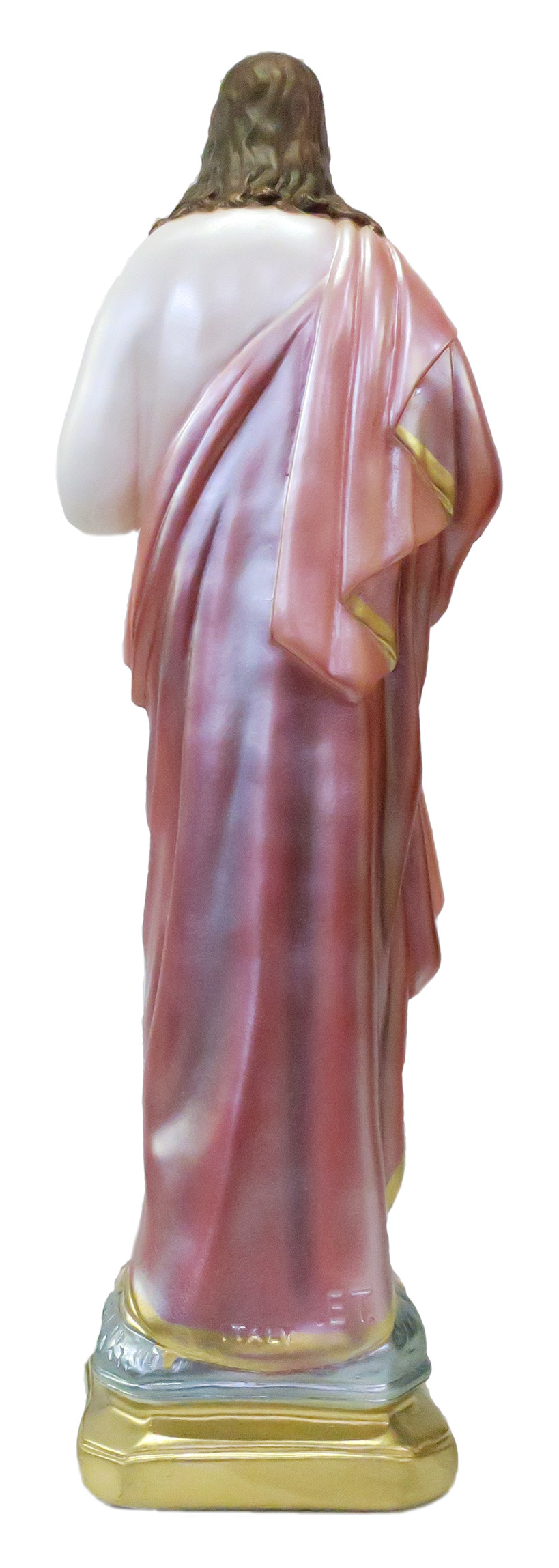 La statua, in gesso finemente dipinto a mano e impreziosito da una rifinitura madreperlata, raffigura il Sacro Cuore di Gesù, devozione molto cara ai cattolici. Cristo è su un piedistallo color oro; sulle mani, appoggiate al petto, porta il segno della Crocifissione. Rappresentato con la barba e i capelli lunghi, Gesù indossa una veste bianca coperta da un mantello rosato, ricchissimo di pieghe e bordato di color oro. Sulla candida tunica spicca il cuore con una croce e delle fiamme volte a simboleggiare l'ardore misericordioso che il Salvatore prova nei confronti dei peccatori. I suoi indumenti vantano un'attenzione particolare alla resa delle pieghe e delle delicate sfumature, che donano grande plasticità e pregio alla rappresentazione.
