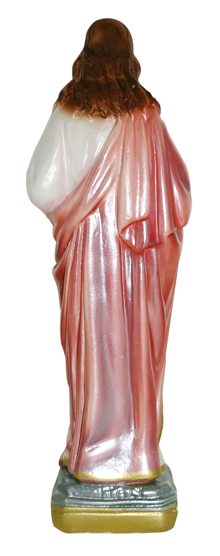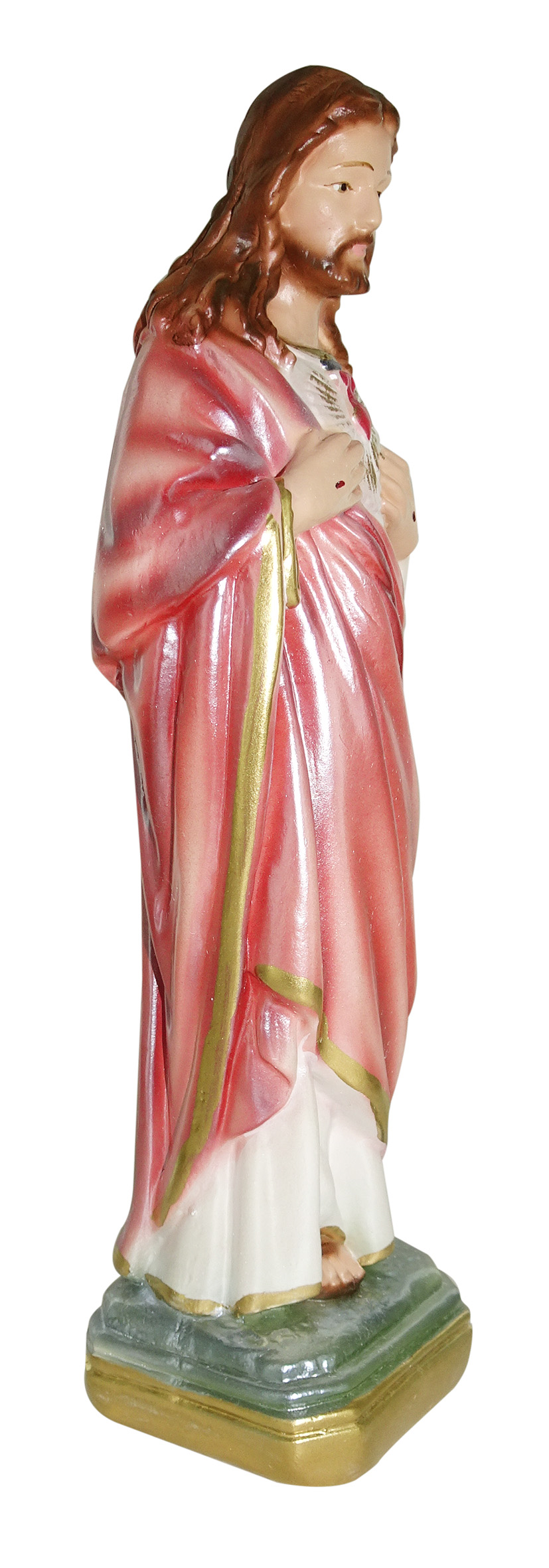 La statua, in gesso finemente dipinto a mano e impreziosito da una rifinitura madreperlata, raffigura il Sacro Cuore di Gesù, devozione molto cara ai cattolici. Il Salvatore è su un piedistallo color oro e verde scuro; sulle mani, porta il segno della Crocifissione. Rappresentato con la barba e i capelli lunghi, Gesù indossa una veste bianca coperta da un mantello rosso-rosato ricchissimo di pieghe. Sulla candida tunica spicca il cuore di un rosso più acceso, volto a simboleggiare l'amore del Salvatore per il genere umano.