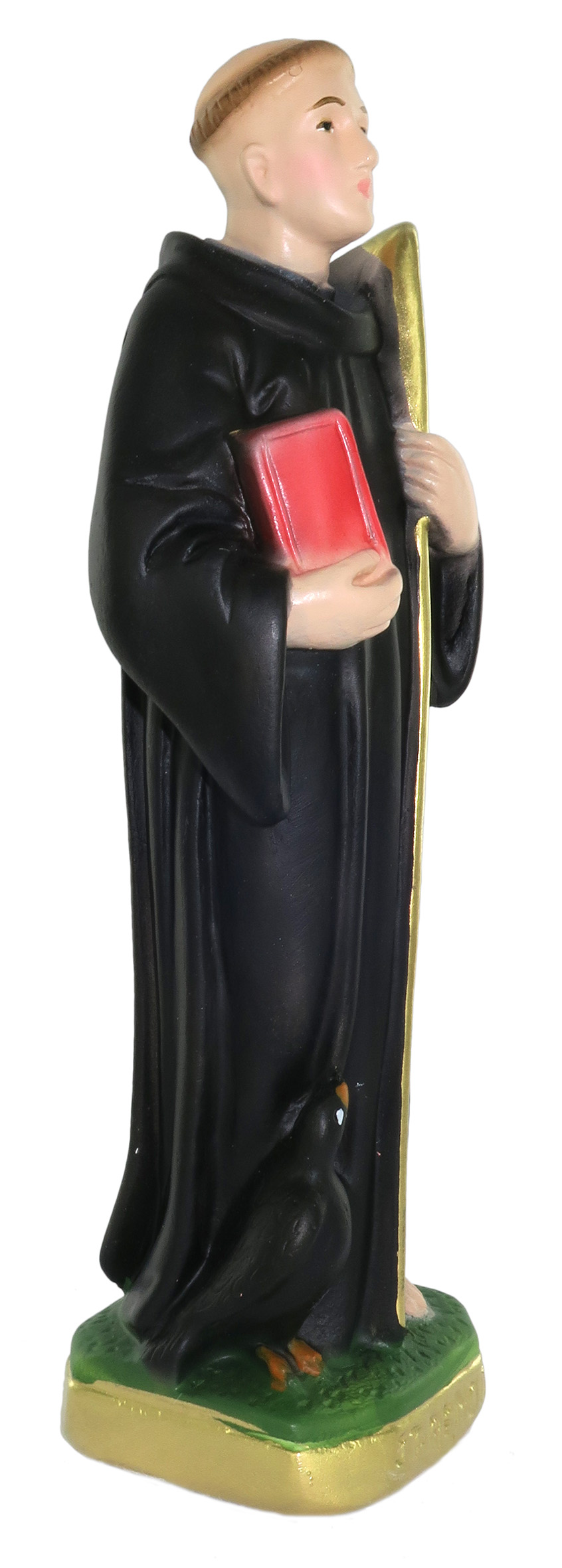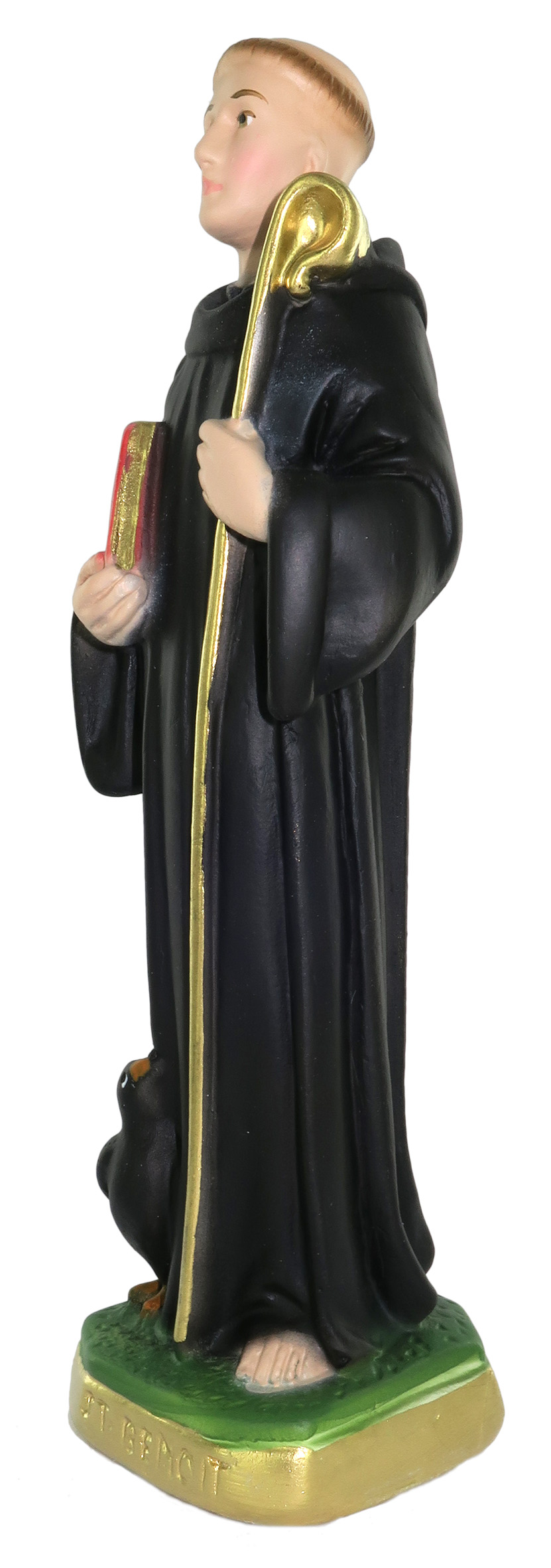 La statua, in gesso finemente dipinto a mano, raffigura San Benedetto da Norcia su un piedistallo color oro e verde. Insieme al santo trova posto nella rappresentazione il suo animale simbolo, il corvo. La vicenda narra che il sacerdote Fiorenzo, invidioso dei successi dell'uomo, abbia tentato di assassinarlo inviandogli del pane avvelenato. S. Benedetto, accortosene, avrebbe ordinato all'animale di sbarazzarsene per non recare male a nessuno. L'uomo è qui rappresentato con un pastorale color oro (anch'esso suo simbolo) e un libro rosso (il suo scritto, la "Regola benedettina"), che spiccano sulla sua veste scura, molto semplice e lineare.