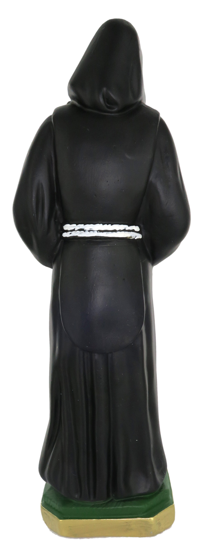 Questa statua di S. Francesco di Paola da 30 cm è realizzata artigianalmente in Italia e si distingue per la qualità della fattura e per il sapiente uso dei colori. Gli indumenti, di un colore nero molto coprente, vantano un'attenzione particolare alla resa delle pieghe, che donano grande plasticità alla rappresentazione.